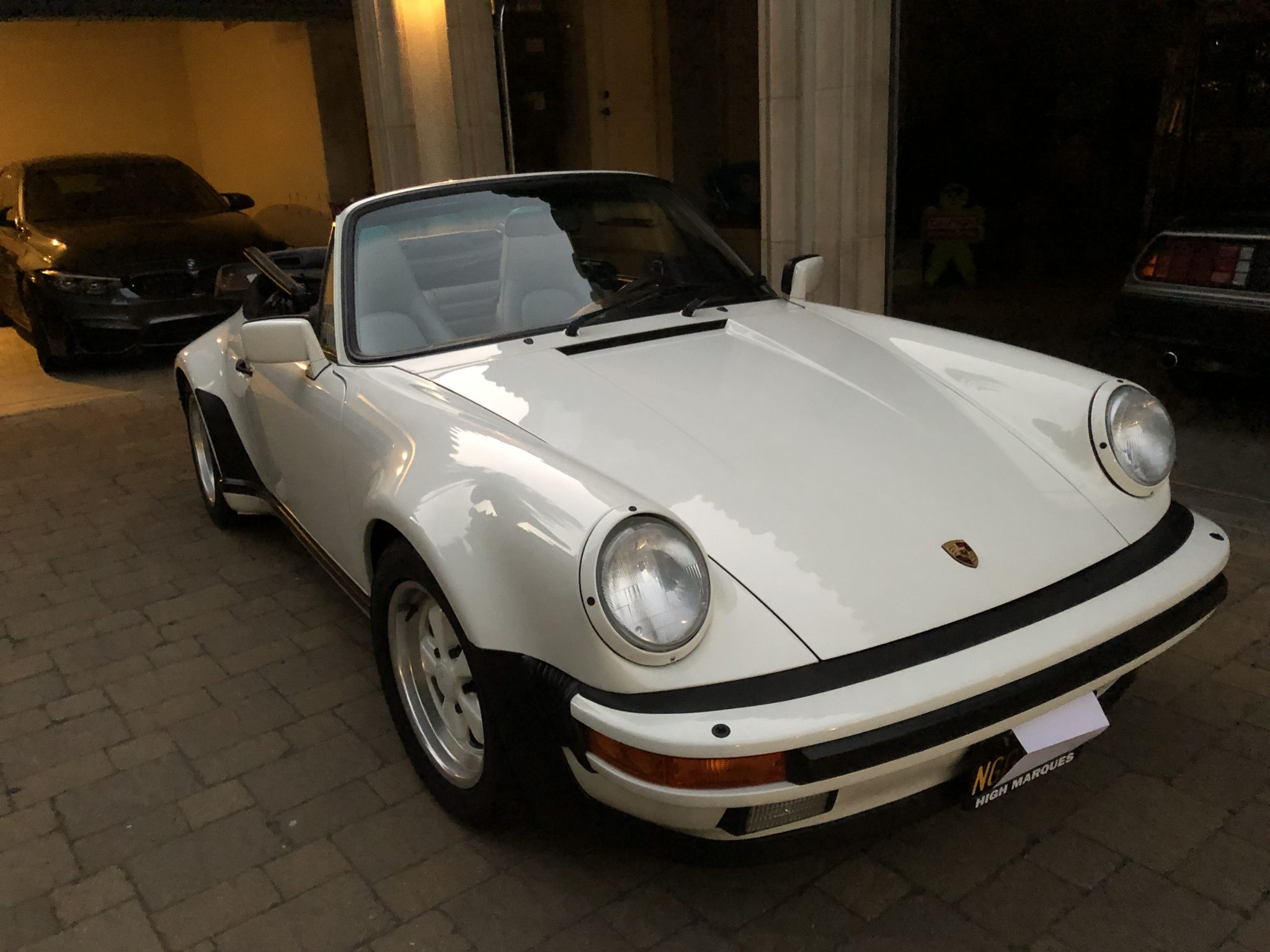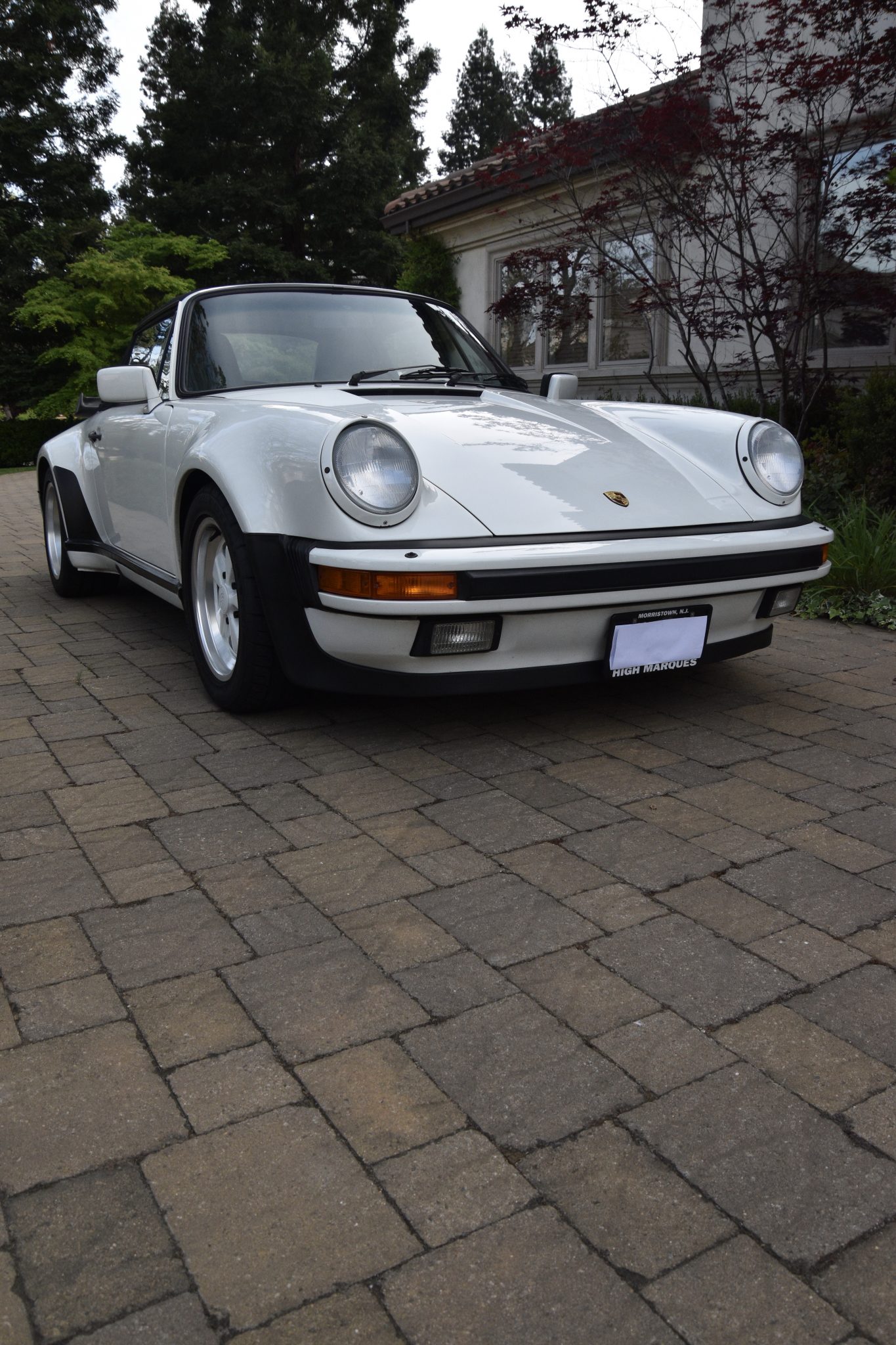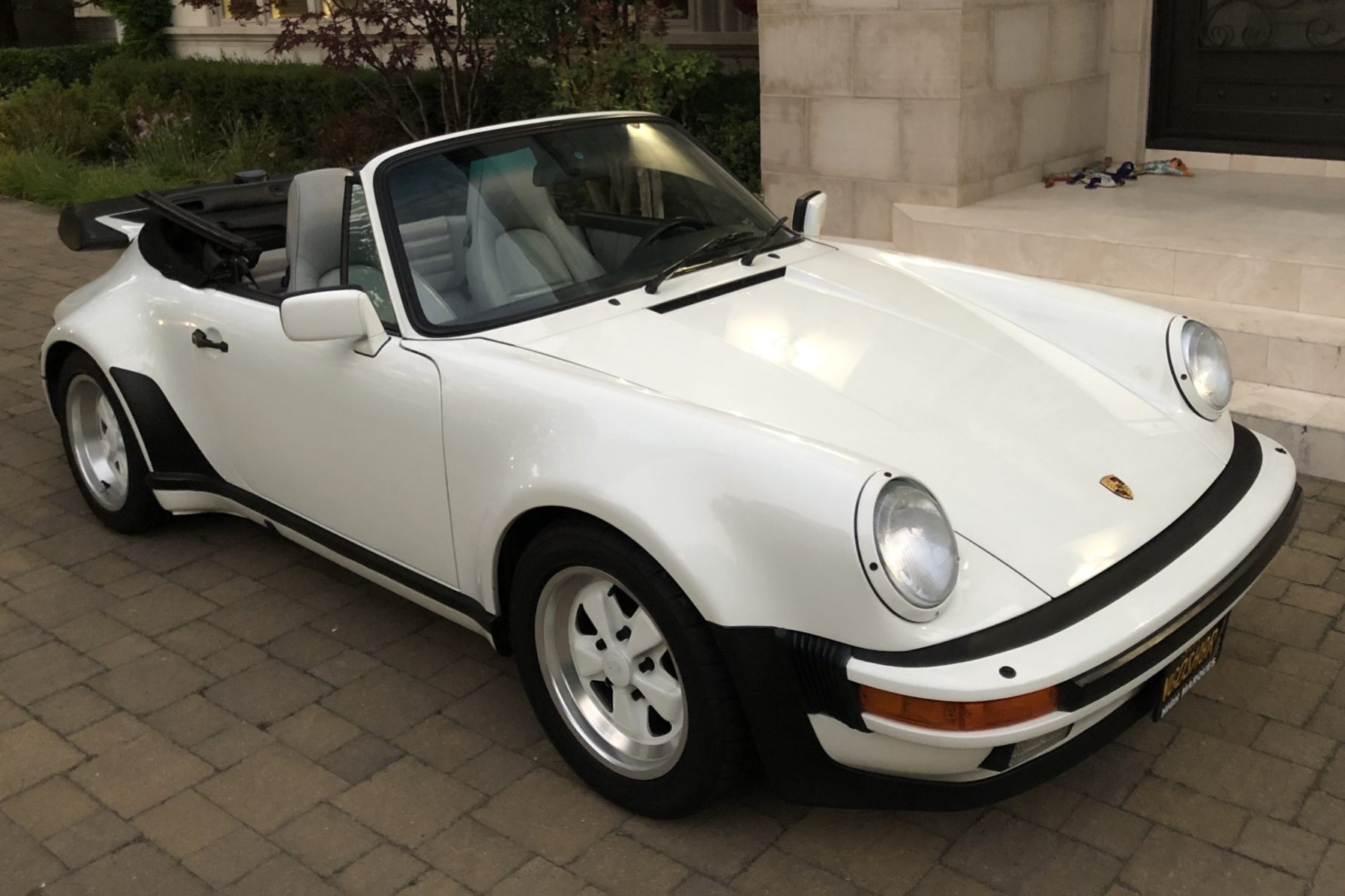 The power-operated black soft top houses a heated glass rear window and can be seen raised in the gallery below. Body-colored 16″ Fuchs wheels feature anodized lips and are mounted with 2016-coded Bridgestone Potenza RE11 tires sized 205/55 up front and 245/45 out back. Cross-drilled brake rotors and four-piston calipers with Porsche scripts came standard on the Turbo.