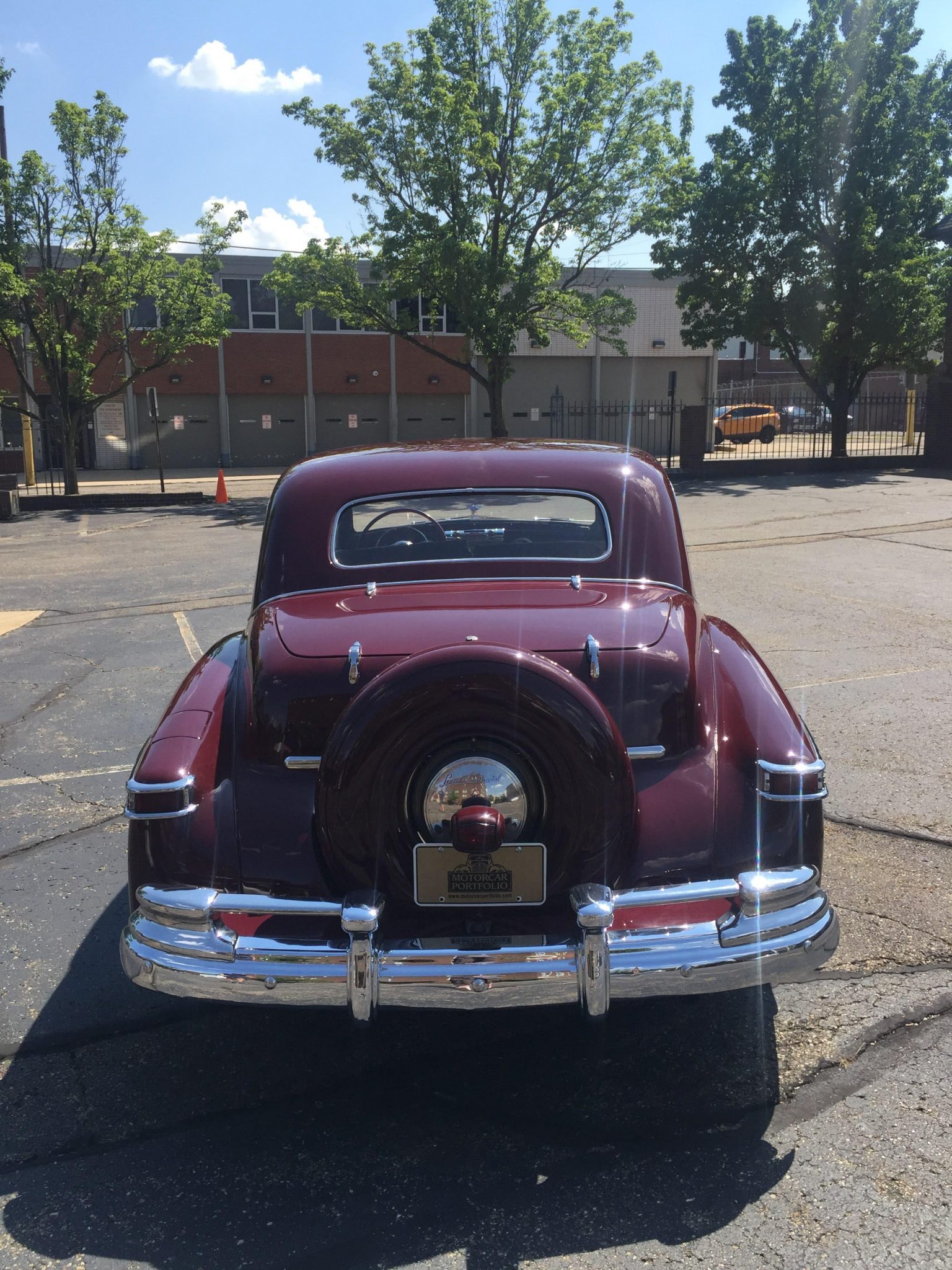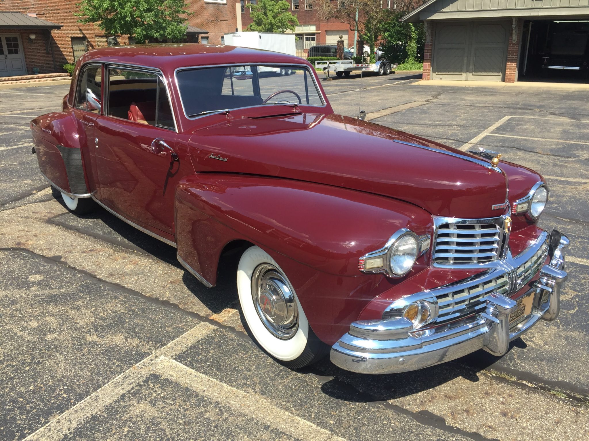 A repaint in maroon accented with polished brightwork was commissioned under prior ownership, and the current condition of the finish is captured in detail in the photo gallery below. Steel wheels wear chrome beauty rings, hubcaps with red Lincoln lettering, and 15″ Firestone wide-whitewall tires. The Continental featured leaf-spring front and rear suspension as well as drum brakes at all four corners.