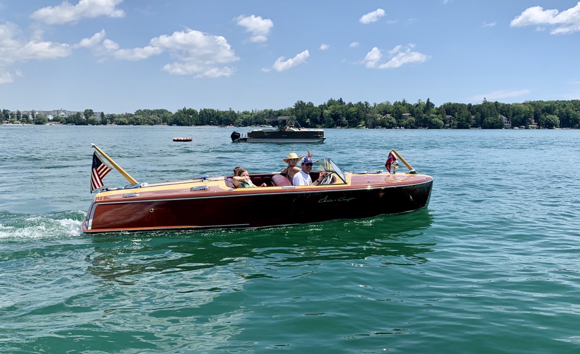 The boat is equipped with a four-piece, flat-folding windscreen, a white boot top, and polished trim and accessories throughout. Its name, True Story, is denoted by a removable decal attached to the convex, “bubble” transom stern.