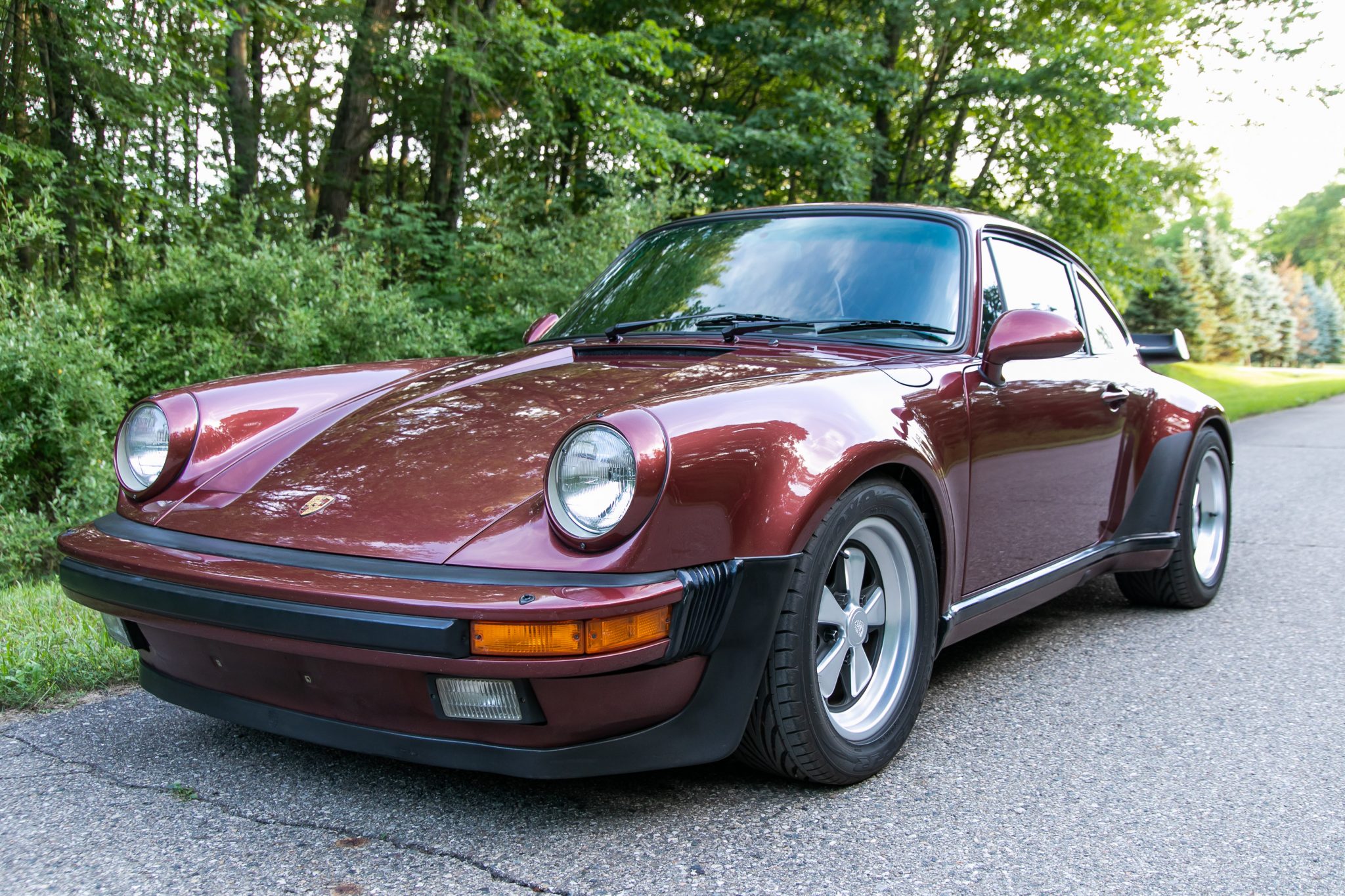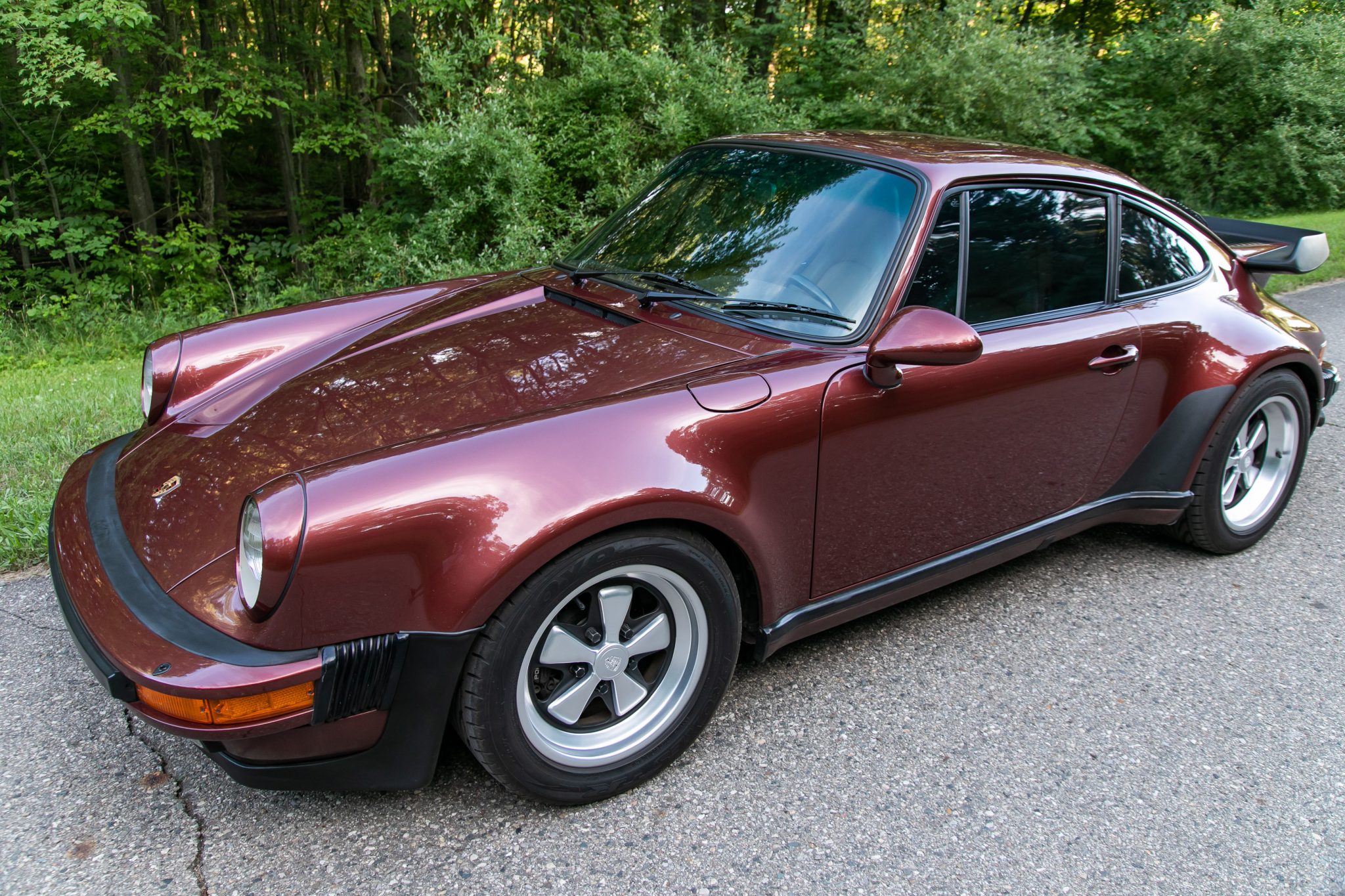 Staggered-width 16″ Fuchs wheels were refurbished by Fuchs Restoration Services in 2016, and are wrapped in Toyo Proxes tires measuring 225/50 up front and 245/45 out back. Cross-drilled rotors and four-piston brake calipers are fitted at each corner, and Bilstein shocks are fitted out back.