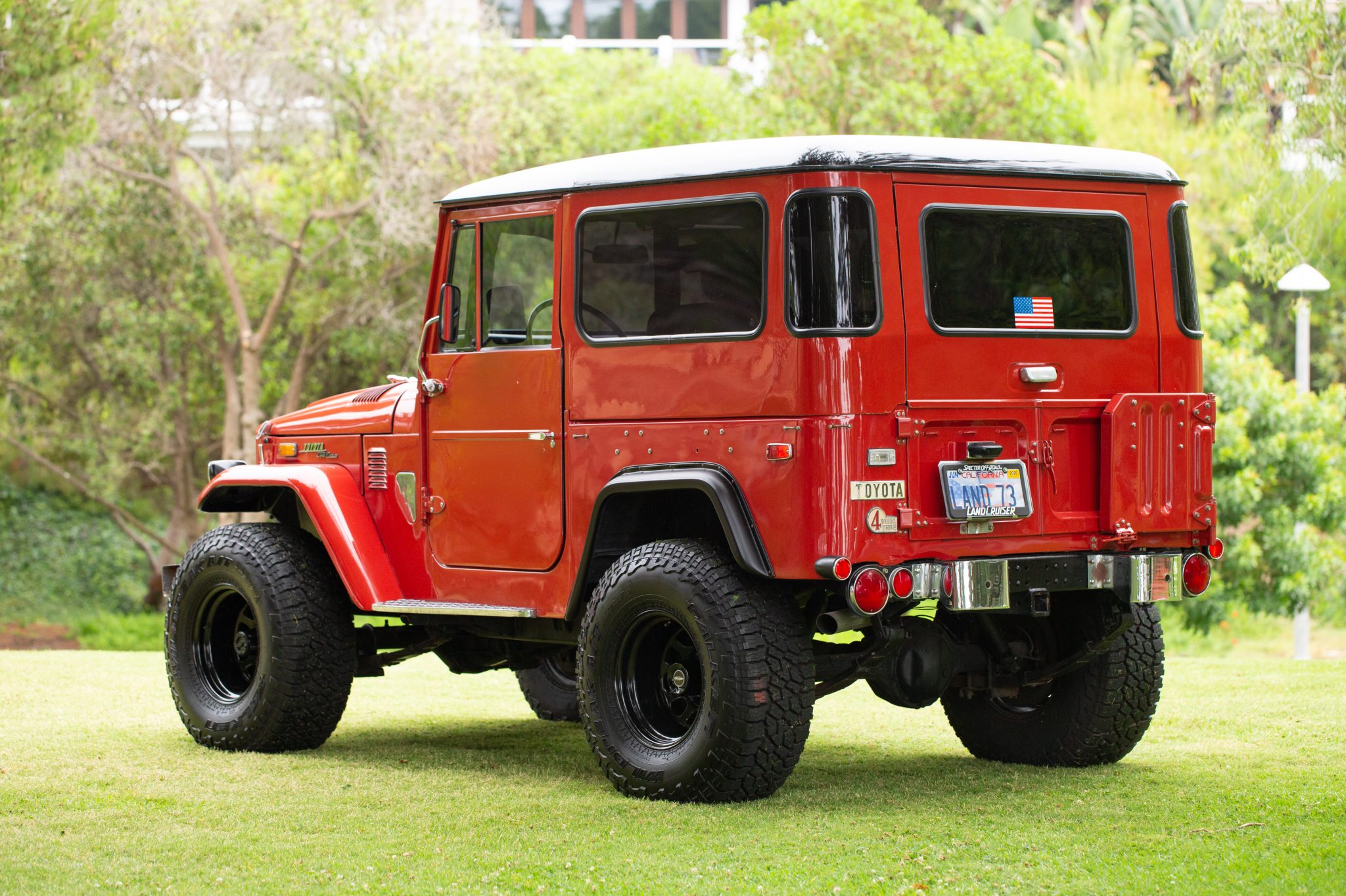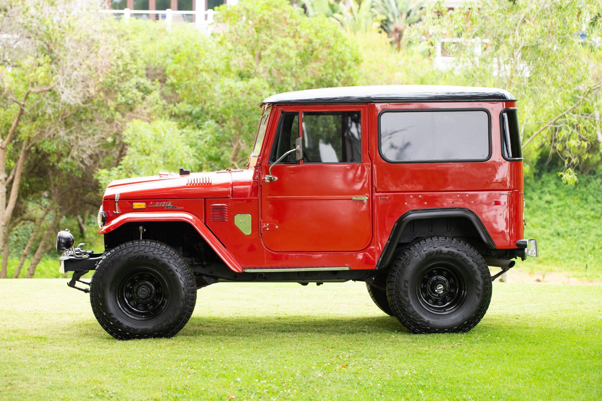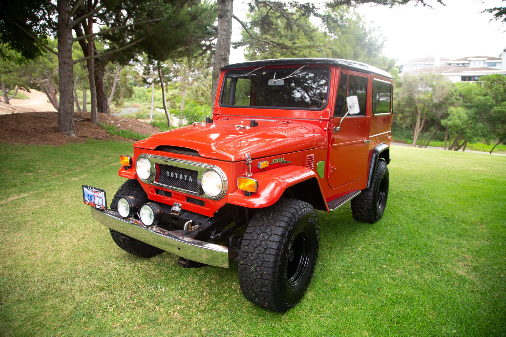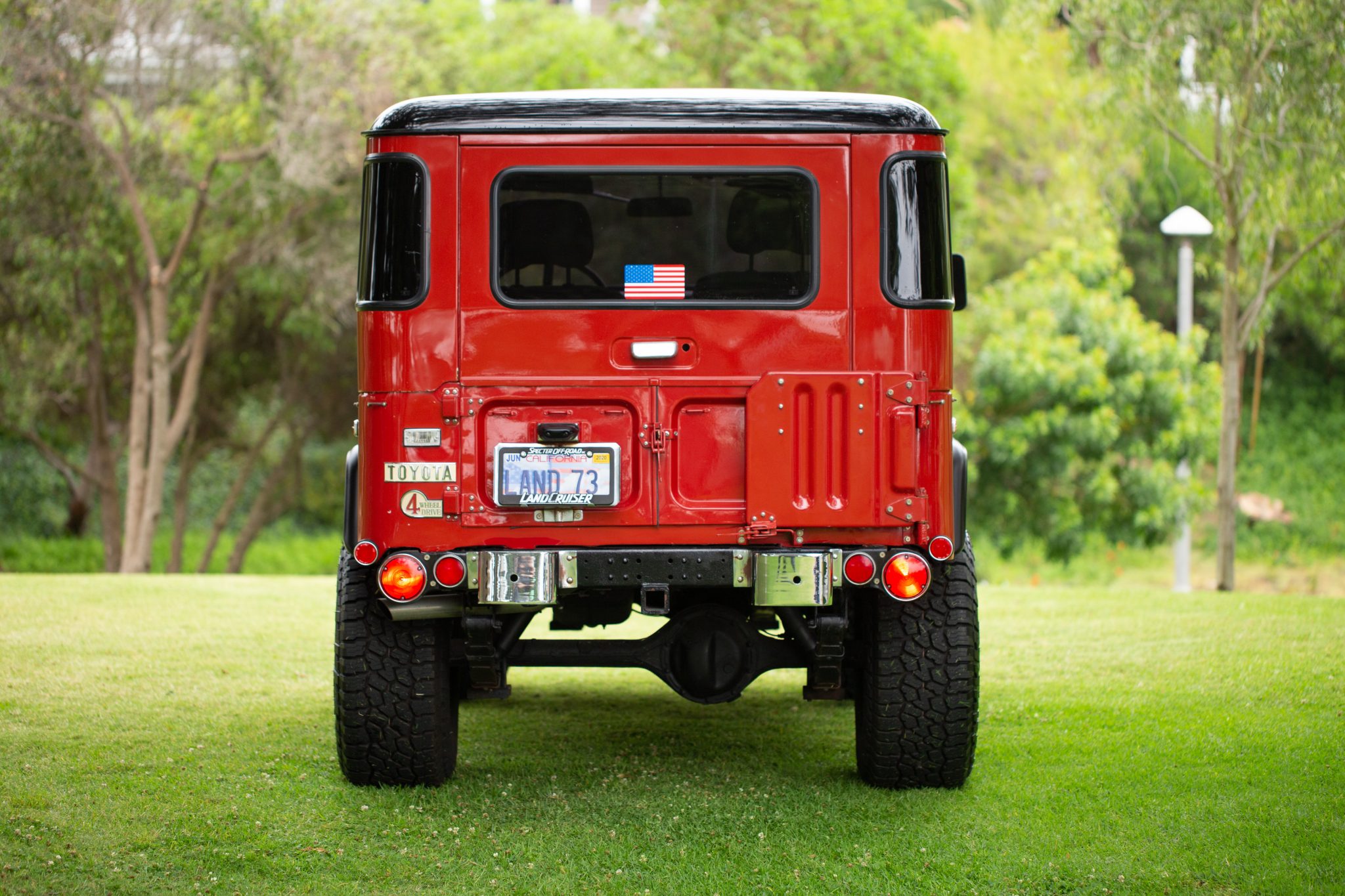 A suspension lift has been fitted to help the body clear 33″ Falken Wildpeak AT3W all-terrain tires, which are mounted on black 15″ American Racing D-window steel wheels. A swing-away carrier is affixed at the rear.