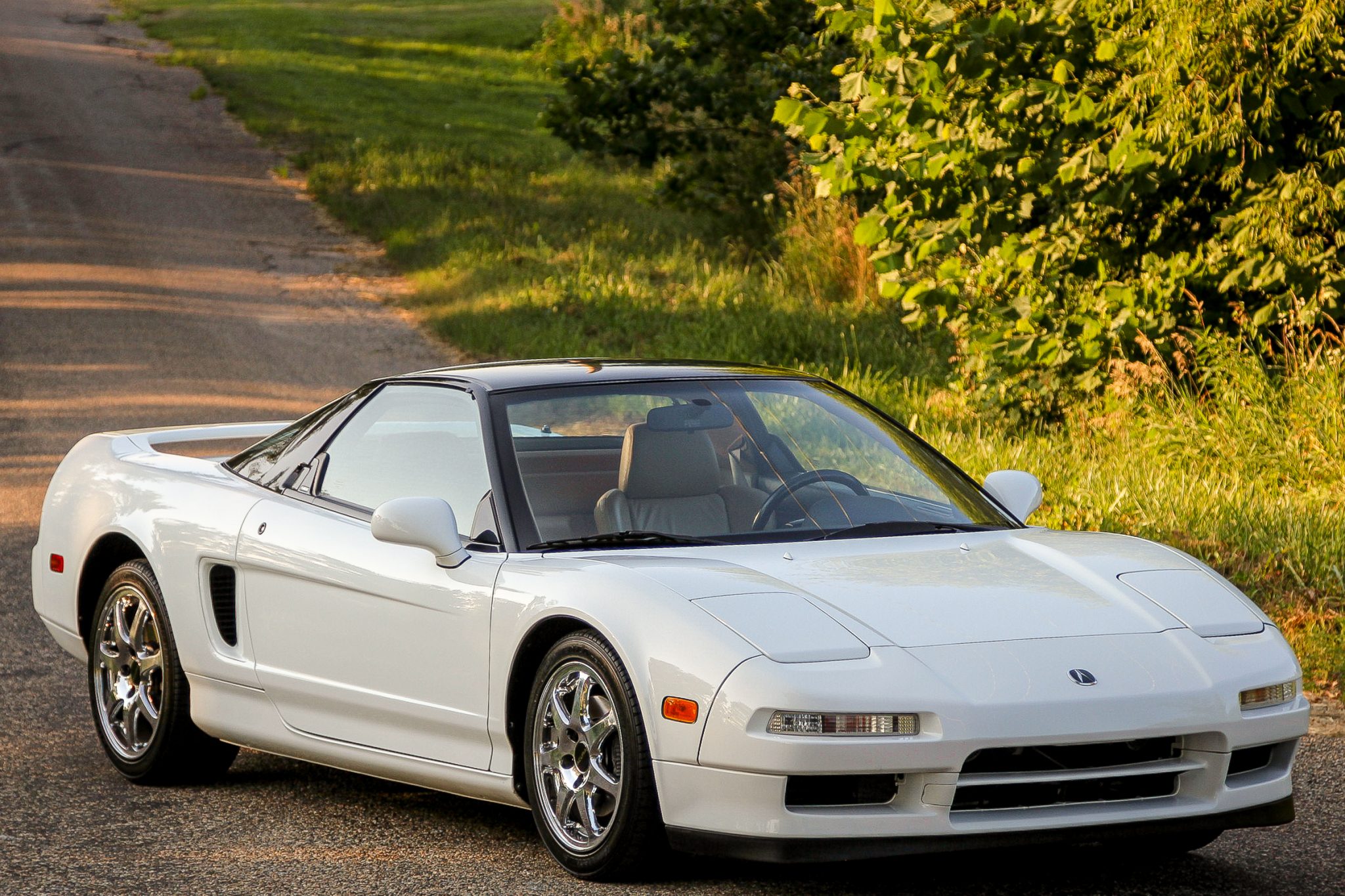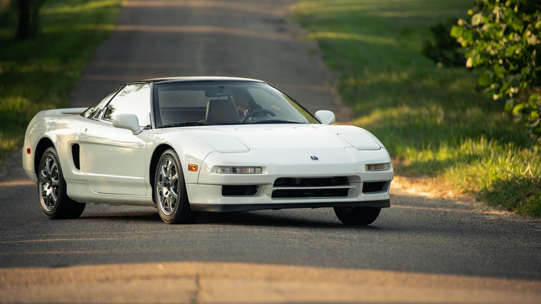 Chrome-finished factory forged wheels measure 16″ up front and 17″ out back and wear Bridgestone Potenza RE010 tires measuring 215/45 up front and 245/40 out back. NSX-branded calipers are equipped at each corner, and additional equipment includes a traction control system.