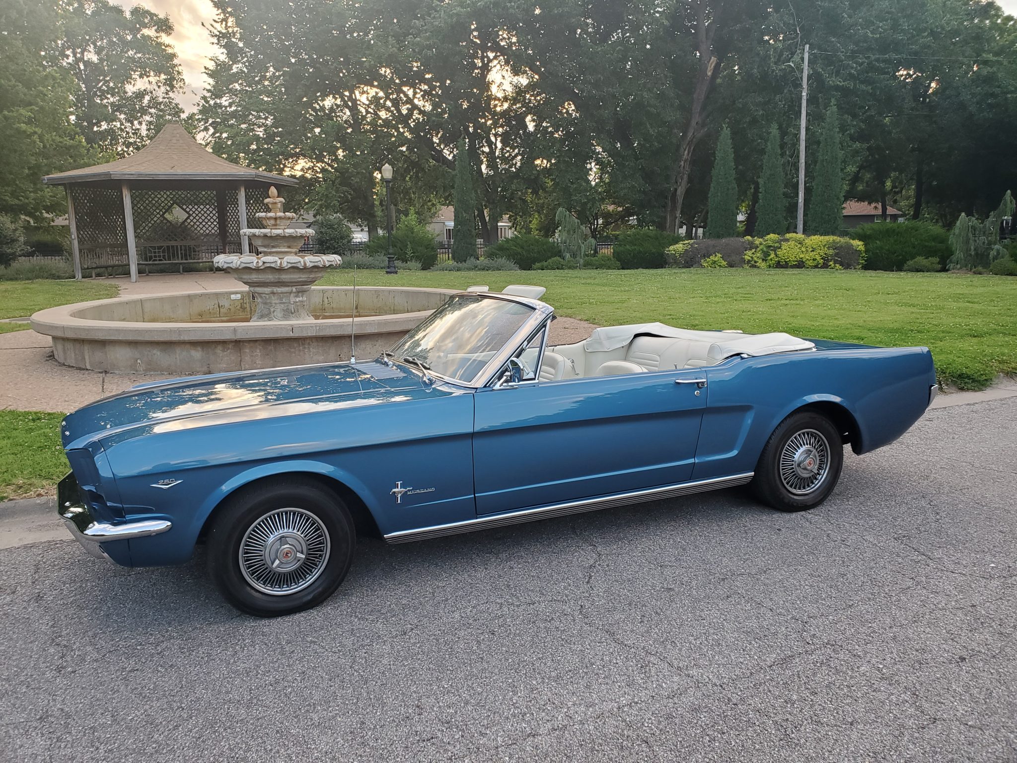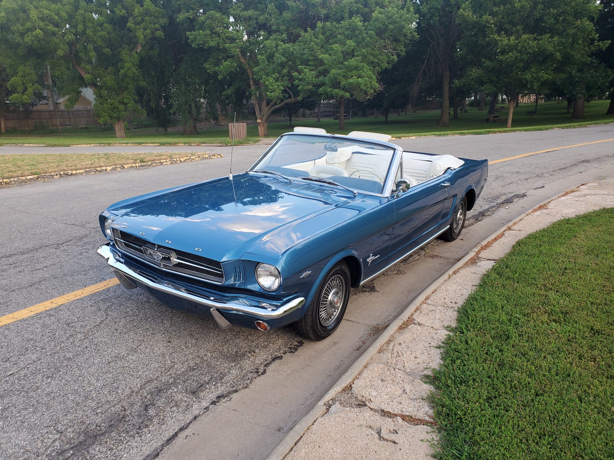 A white boot covers the convertible top when retracted. Factory wire-look covers are fitted over 13″ five-lug steel wheels, which have been mounted with radial tires. The front drum brake wheel cylinders were replaced in April 2020.