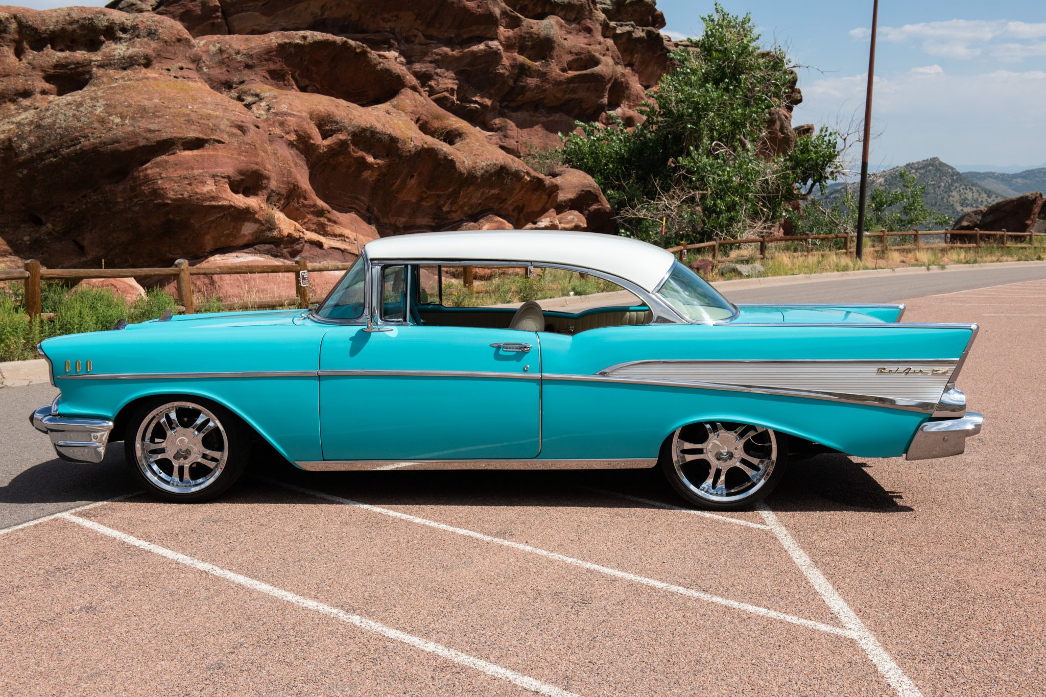 Aftermarket 18″ and 20″ wheels are mounted with 235/40 and 265/30 BFGoodrich g-Force T/A KDW tires. Braking is handled by power-assisted front discs and rear drums. Drop spindles have been utilized to lower the car, which also has power steering.