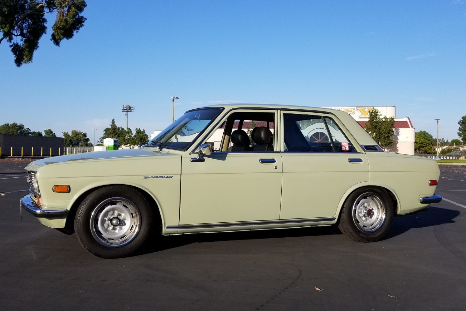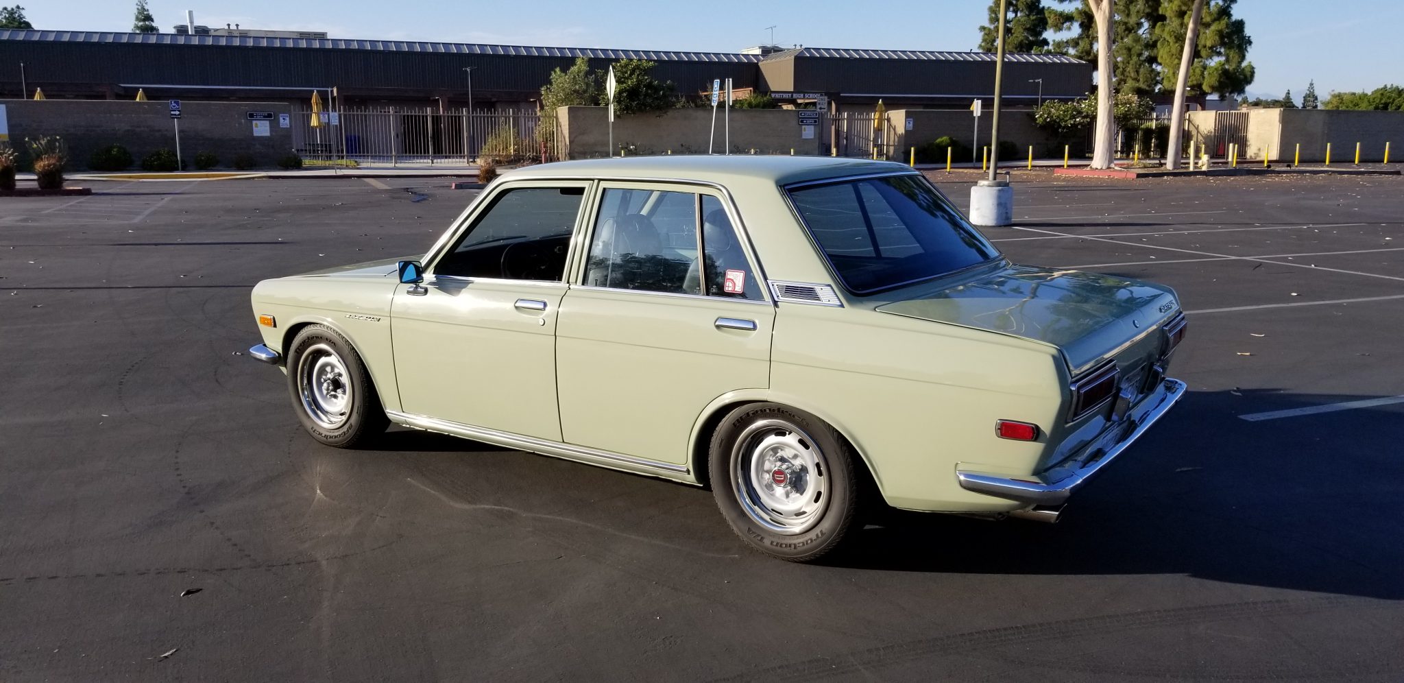 Silver-painted 14” steel wheels from a Datsun 240Z wear chrome trim rings and are wrapped in BFGoodrich Traction T/A tires sized 195/65. Stopping power is provided by front discs with 280ZX calipers along with rebuilt drums out back. The master cylinder has reportedly been rebuilt and a Nissan brake booster installed. The suspension features adjustable Tokico shocks and Eibach lowering springs up front, while an adjustable crossmember and shortened springs are fitted in the rear. A rebuilt steering box has reportedly been installed, along with replacement tie rods, ball joints, sway bar bushings, and idler arms.