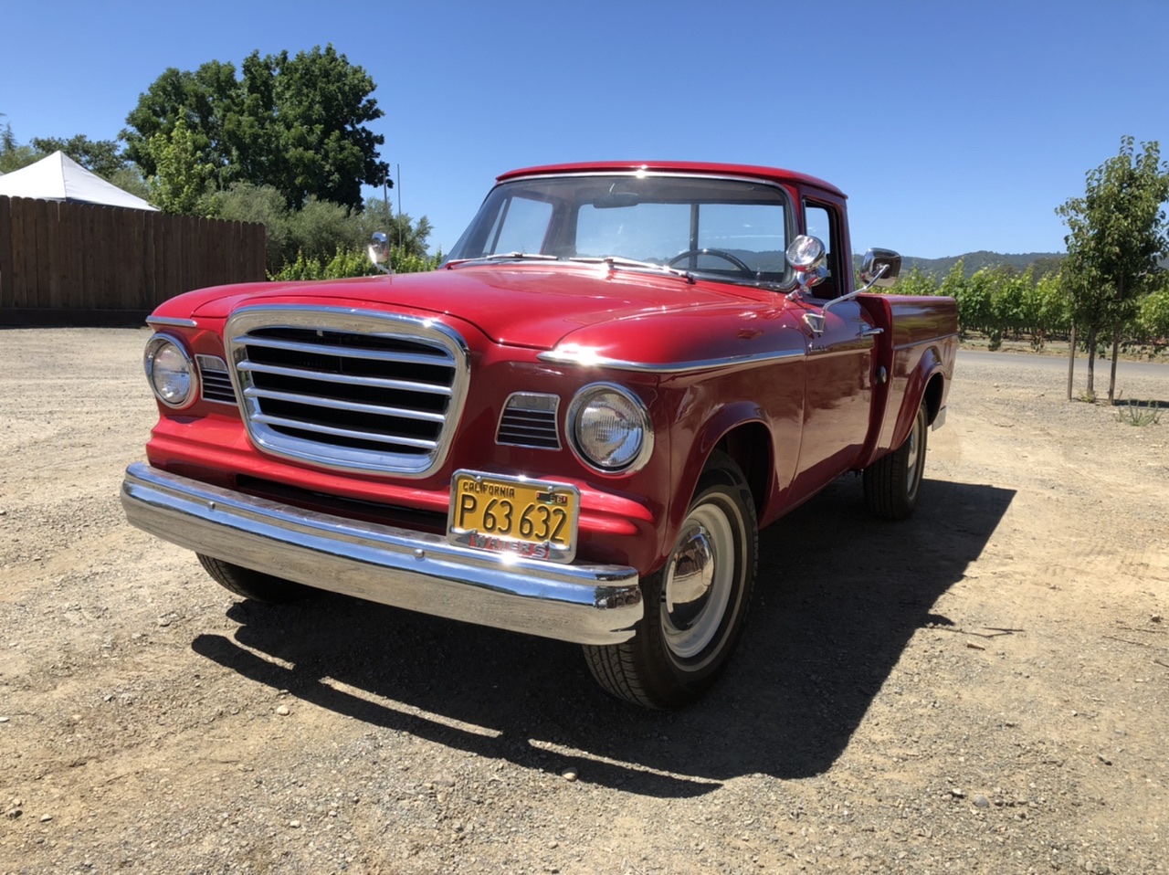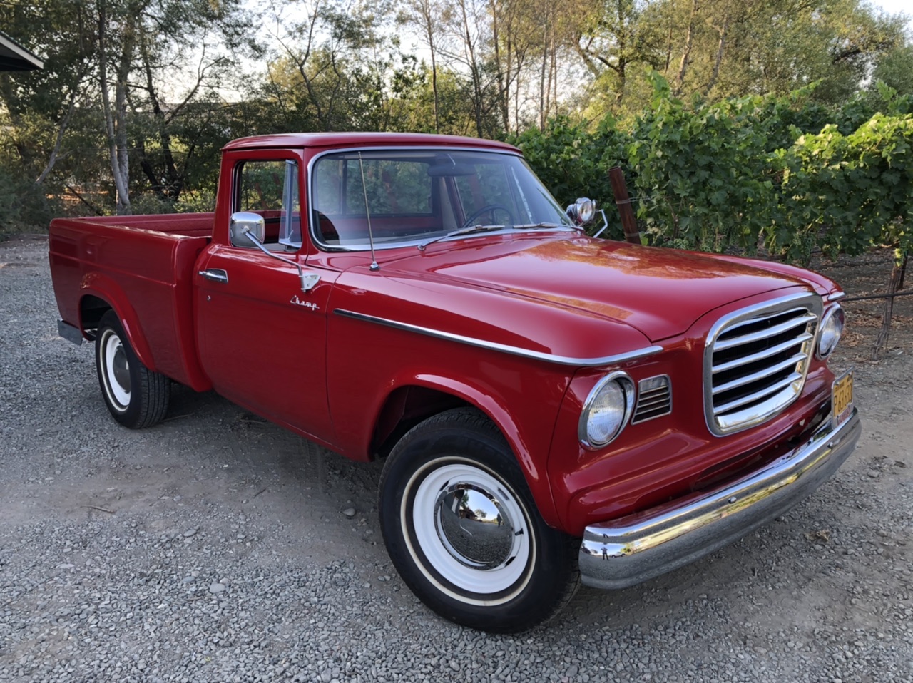 White-finished 15″ steel wheels wear polished hubcaps and 235/75 Hankook Optimo H724 thin whitewall tires. The seller states that Hydrovac power-assisted drum brakes from a 1963 Studebaker have been added. Service during current ownership reportedly included the replacement of the wheel cylinders, master cylinder, brake shoes, and brake lines. The truck pulls slightly to the right when braking.
