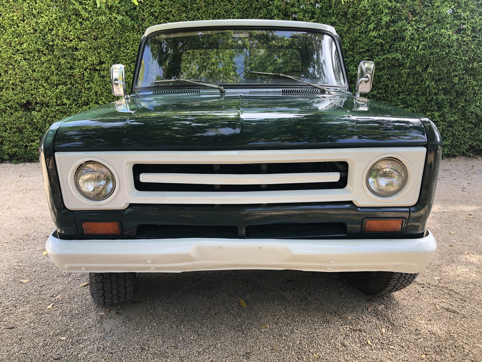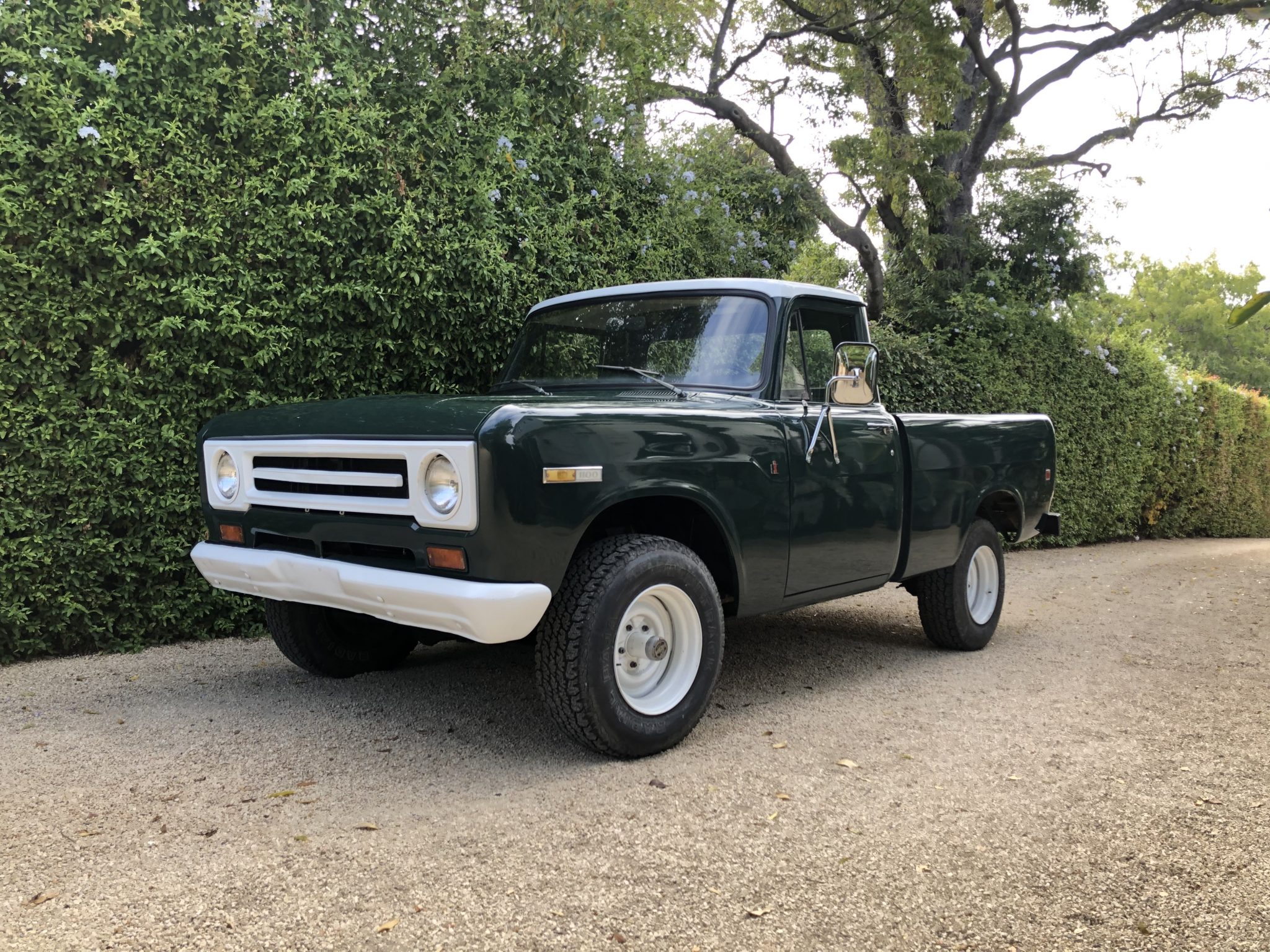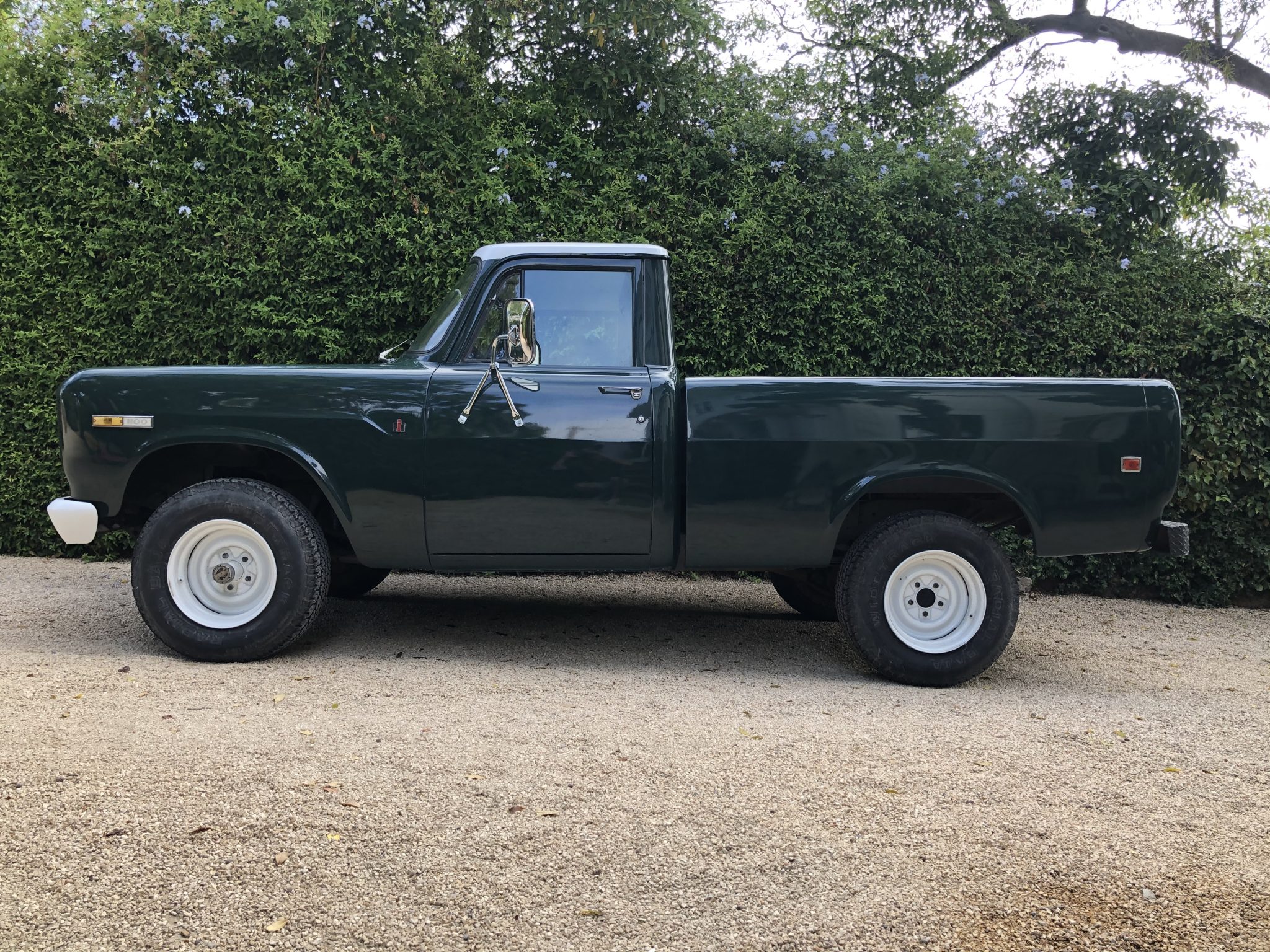 Five-lug 16″ steel wheels are mounted over manually-locking hubs up front and wear older 31″ tires that the seller says should be replaced. The truck is equipped with power-assisted steering and drum brakes. One replacement front drum, two wheel cylinders, and new lines are said to have been fitted in preparation for the sale.