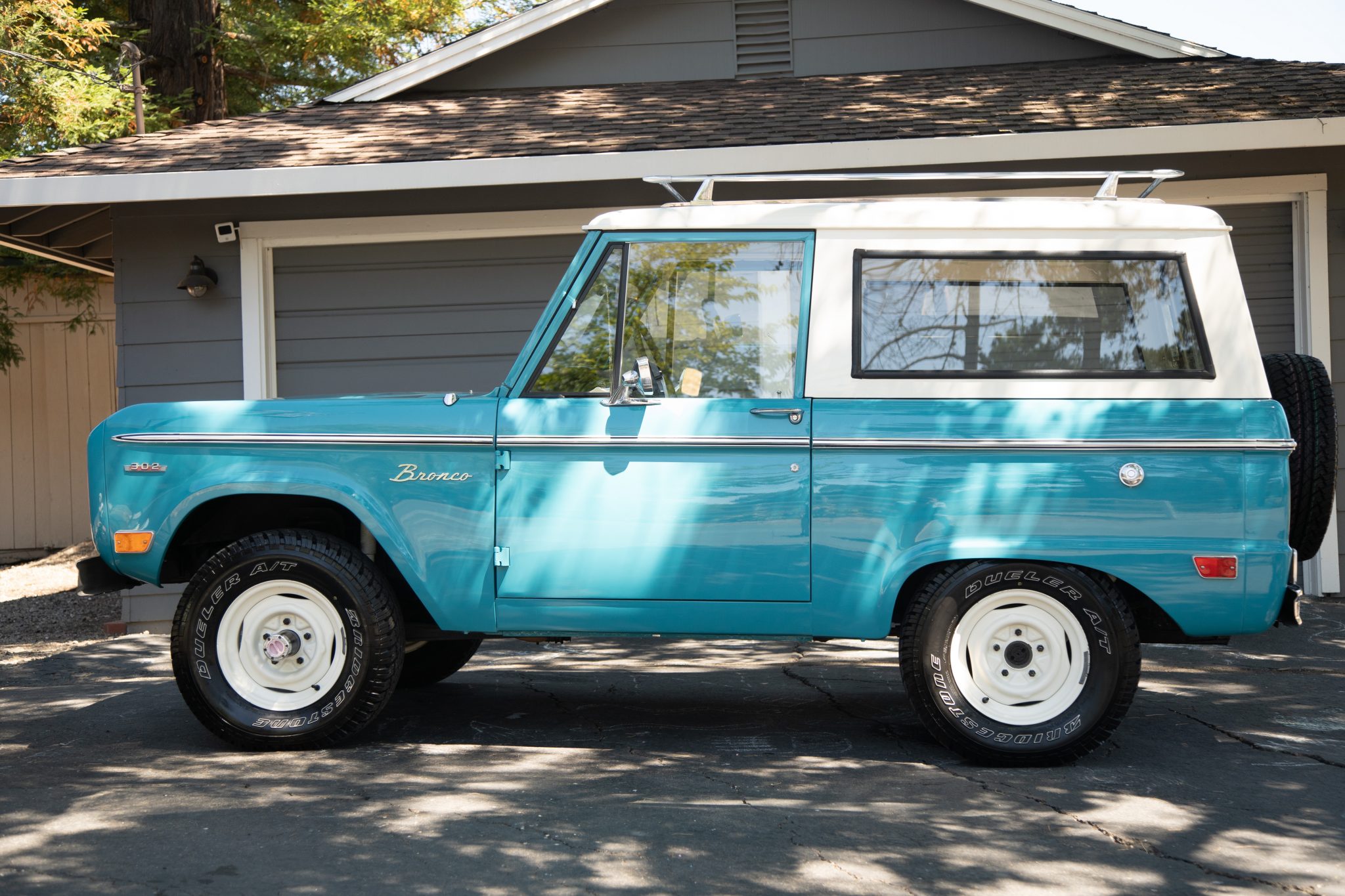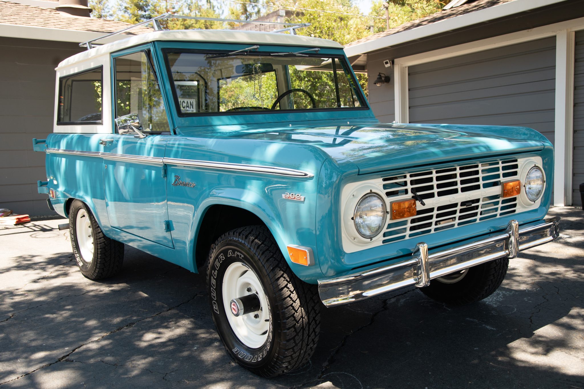 White 15″ steel wheels wear Bridgestone Dueler A/T tires that measure 235/75. A matching spare is mounted to a swing-out carrier at the rear, and the truck is equipped with manually-locking front hubs. The rear wheel cylinders, brake drums, and lines were replaced in July 2020, and a new master cylinder was also installed.