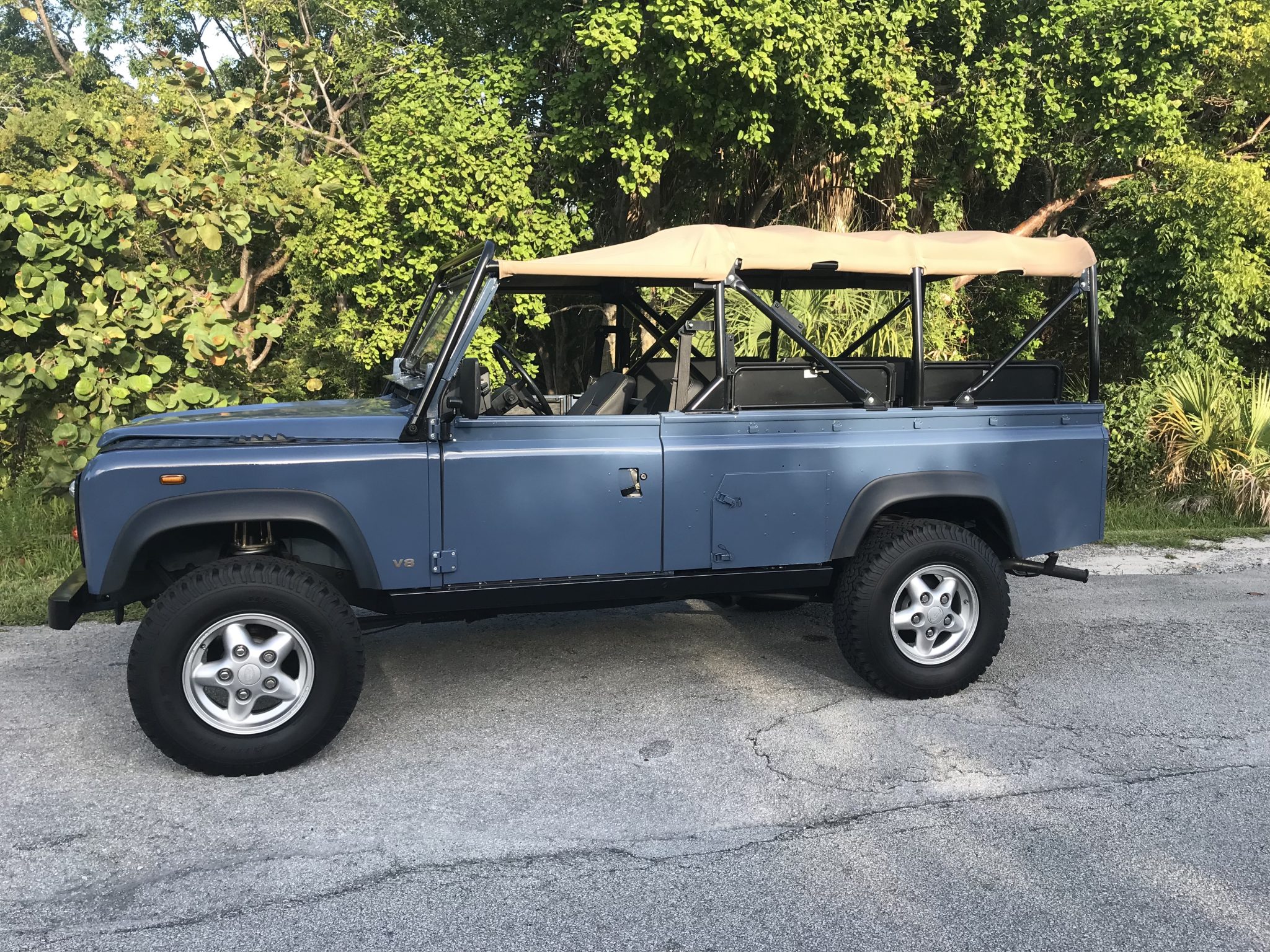 Five-spoke 16″ Freestyle alloy wheels are mounted to the hubs with Terrafirma wheel spacers and wear BFGoodrich All-Terrain T/A tires that measure 235/85. A Terrafirma coilover suspension and steering stabilizer have also been added.