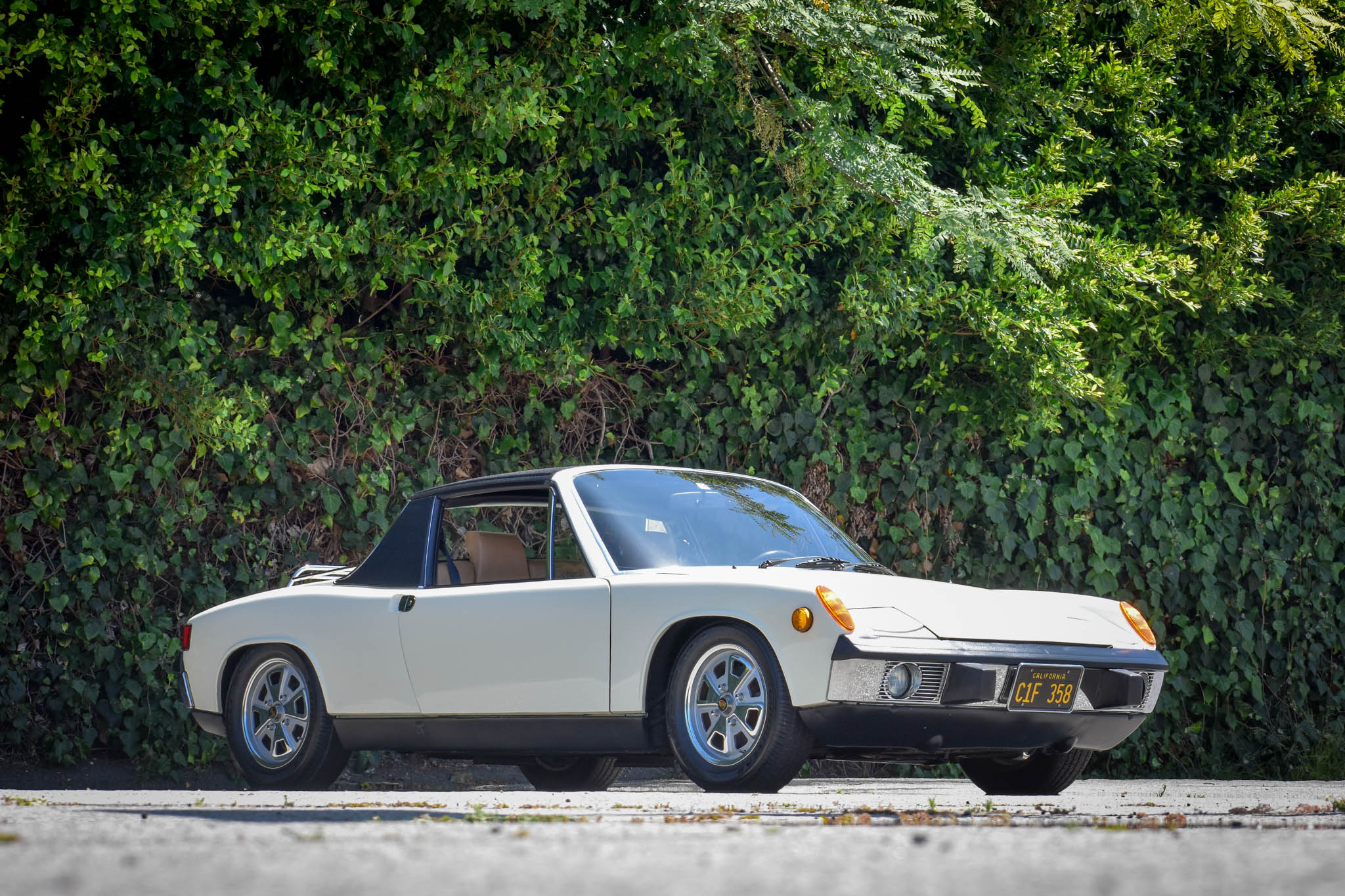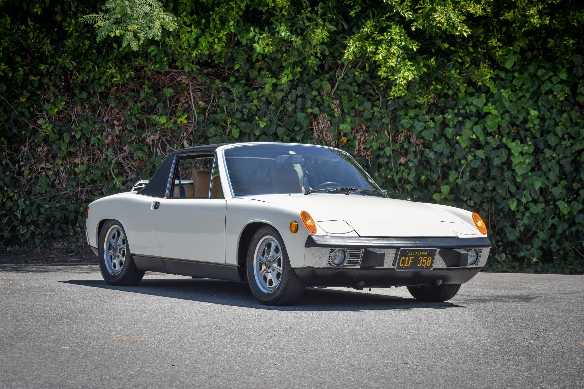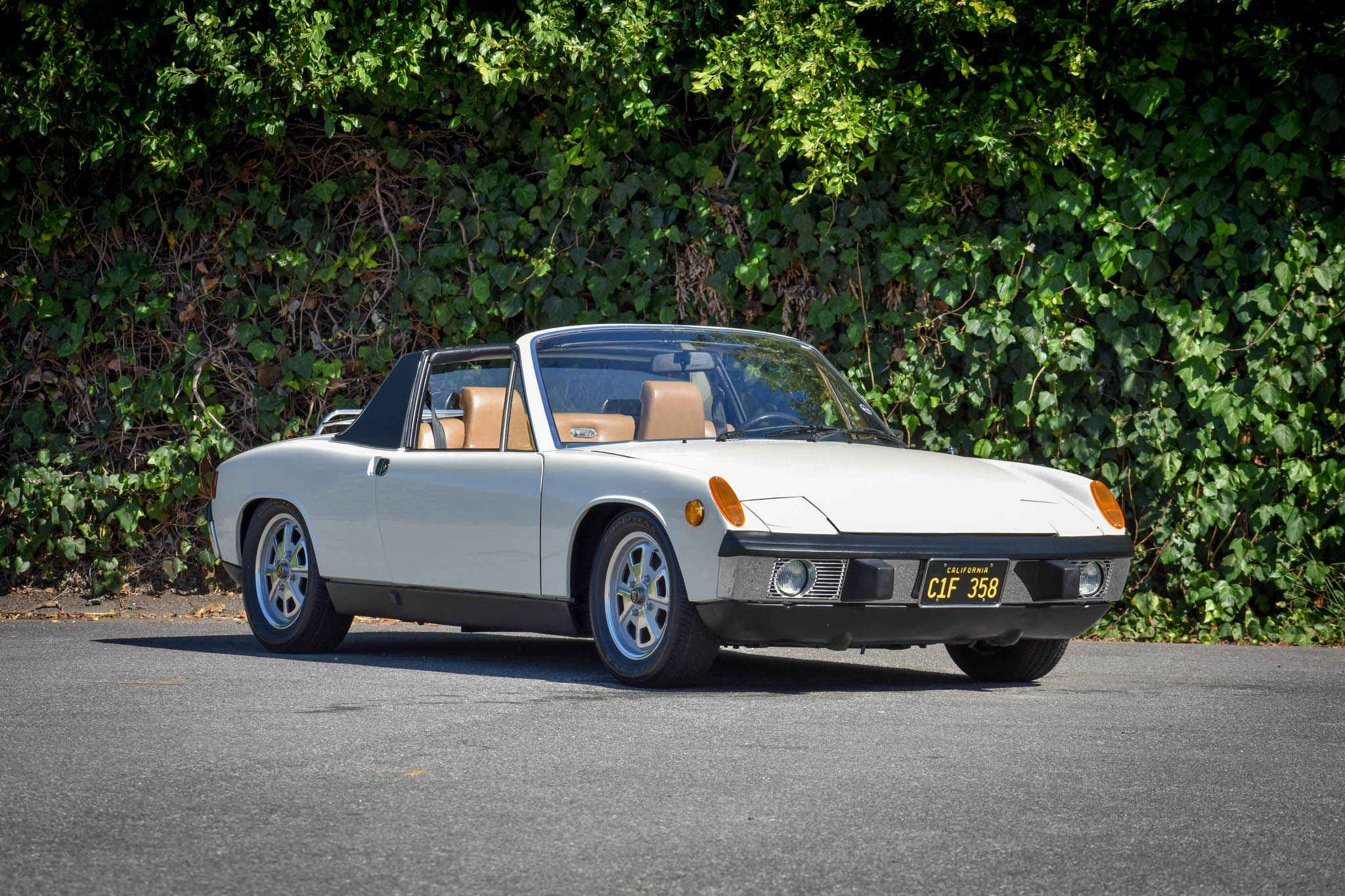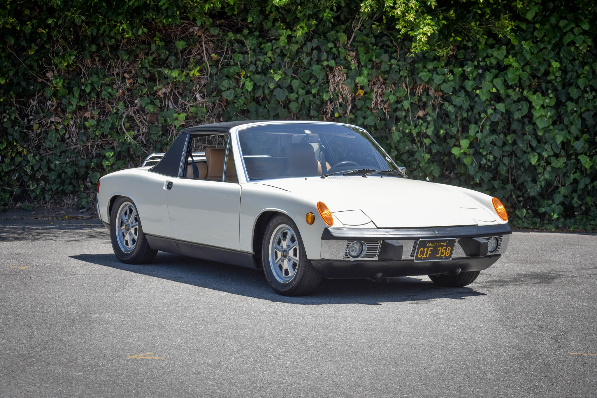 The five Fuchs wheels show 12/73 date stampings, including the matching spare, and were refinished in 2015. Goodyear Eagle RS-A tires measuring 195/60 display 2015 date codes. Braking is handled by four-wheel discs, and the rear shocks and front strut inserts were replaced in 2015.