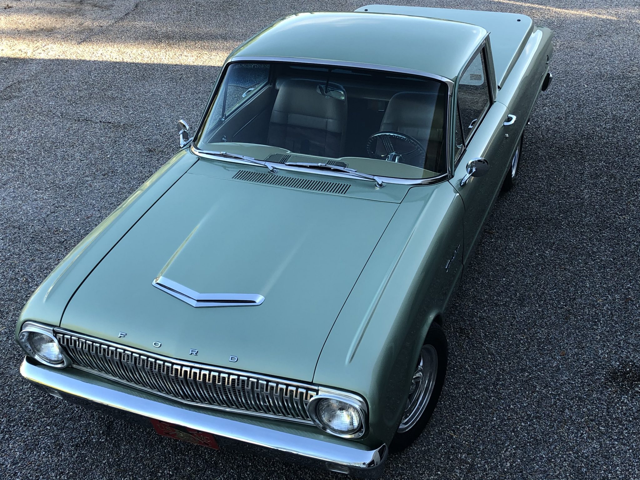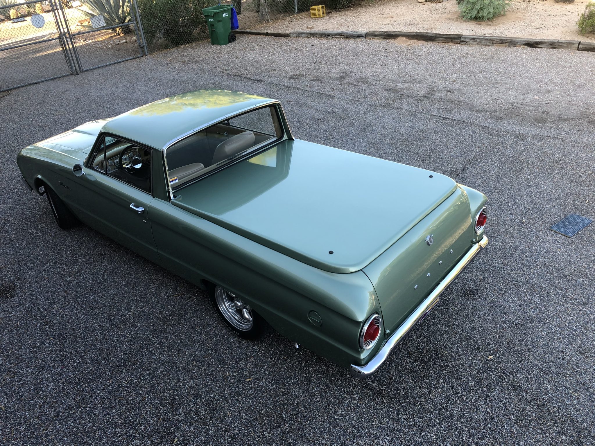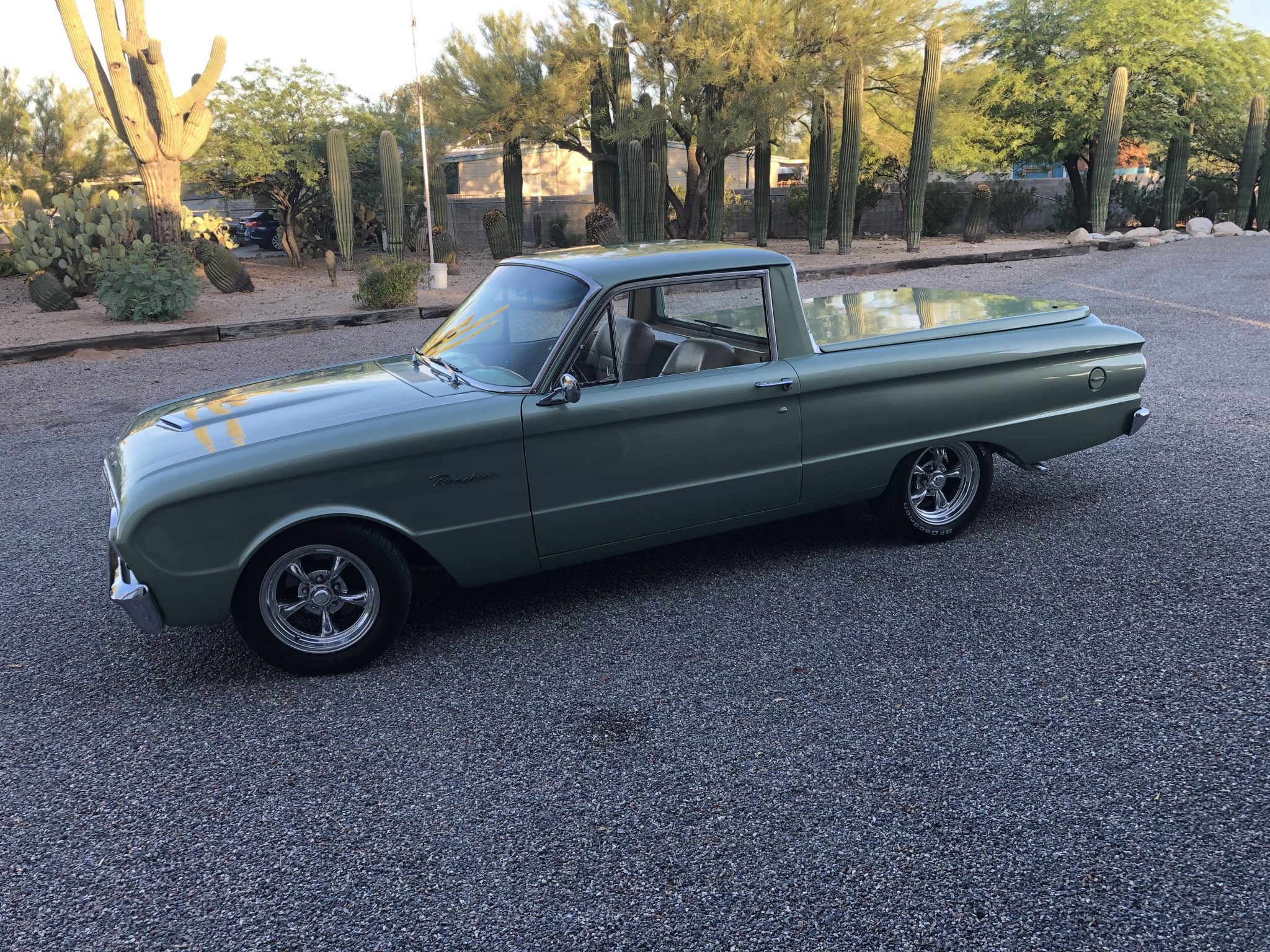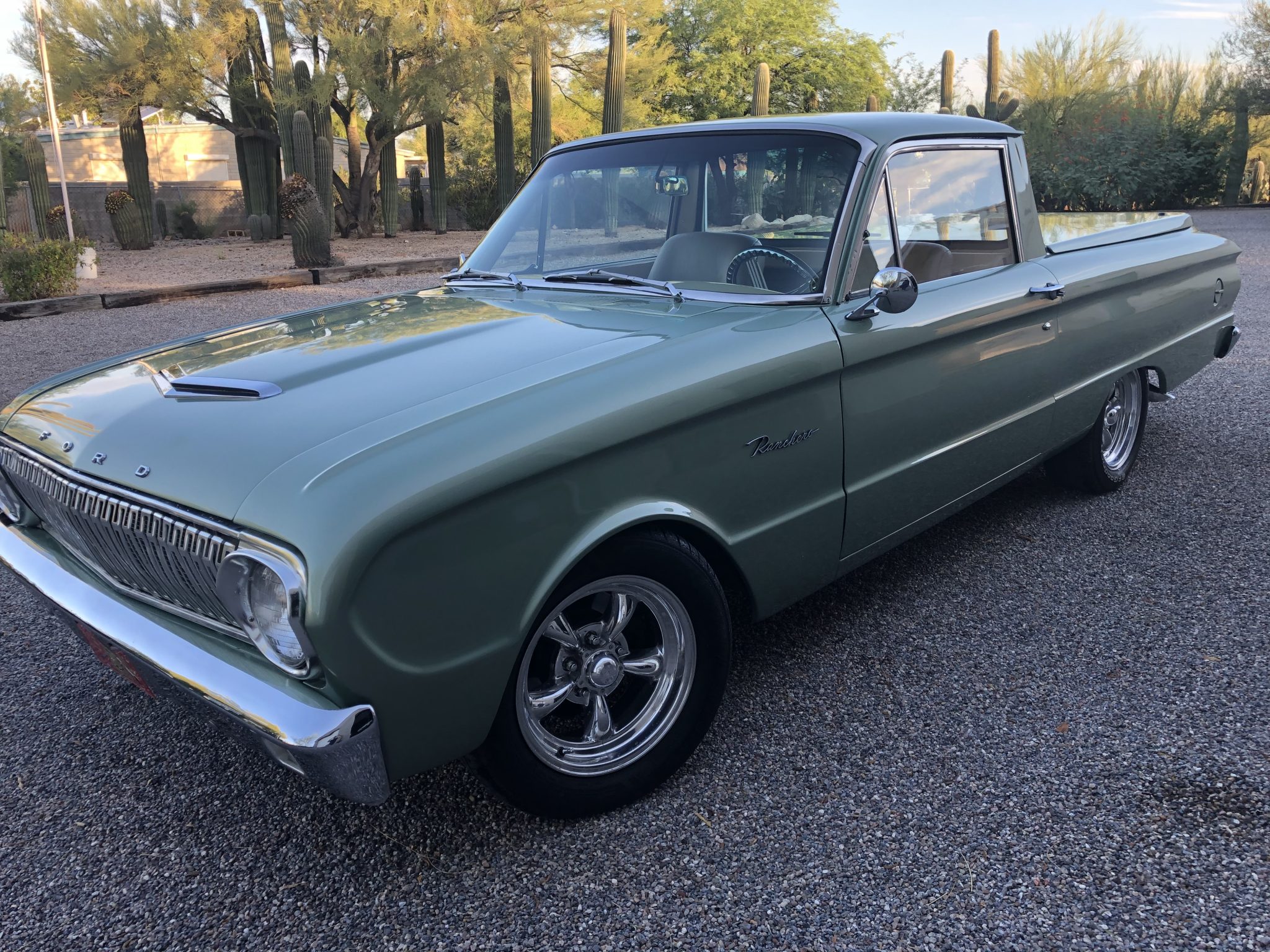 Polished 15″ American Racing Torq Thrust wheels are wrapped in 205/60 Sentury Touring tires. Modifications include a Mustang II front suspension setup with tubular control arms as well as a front sway bar and power-assisted front disc brakes.
