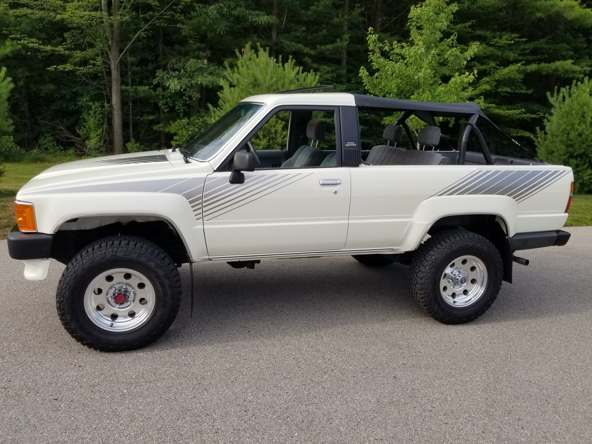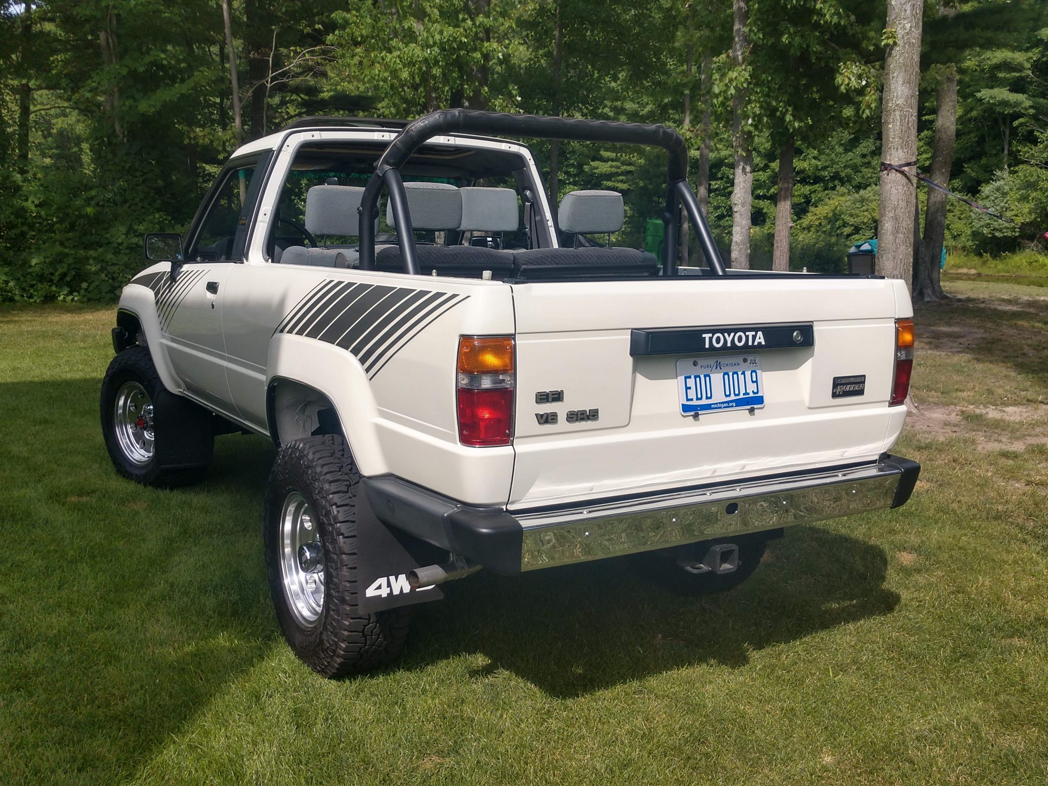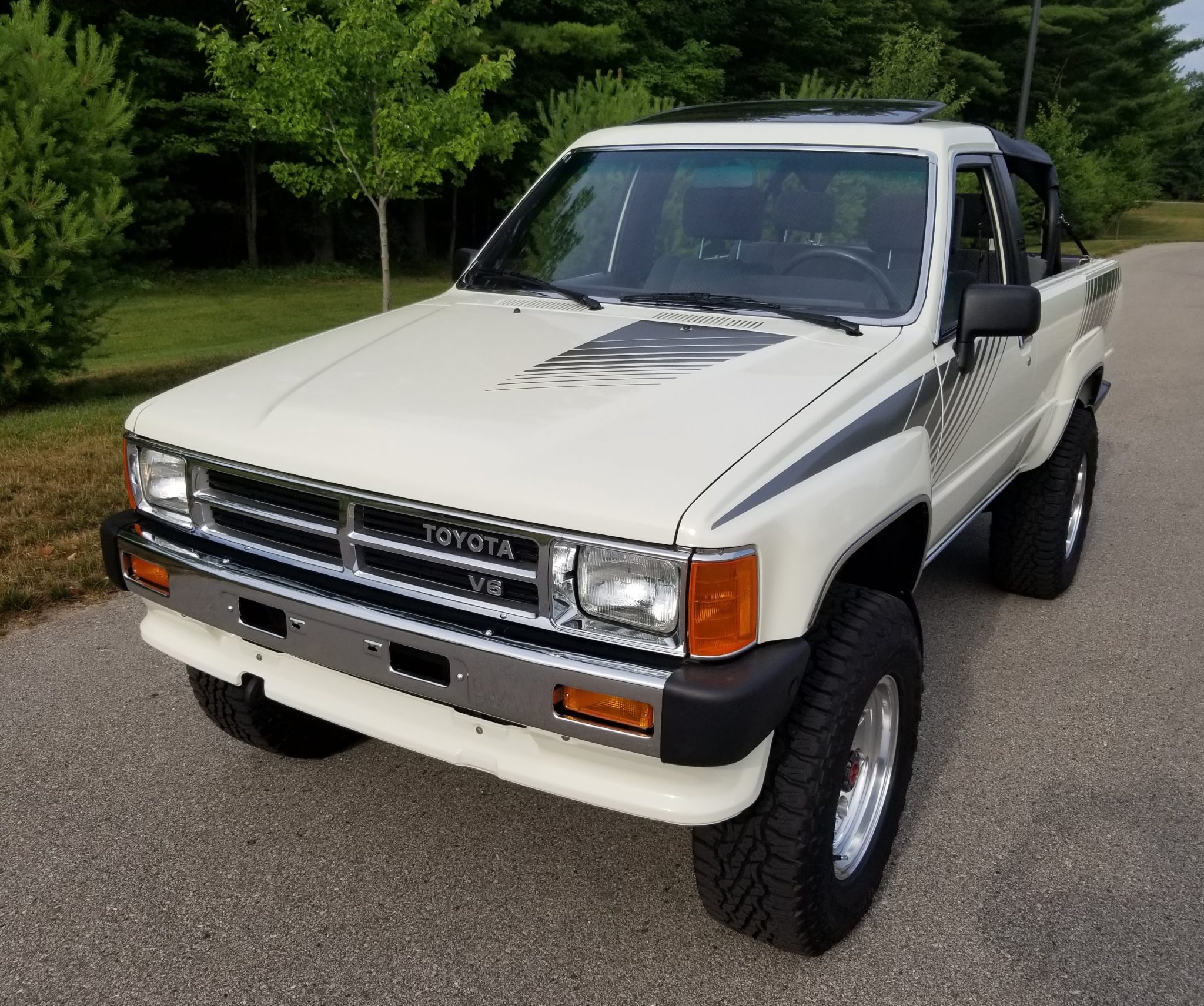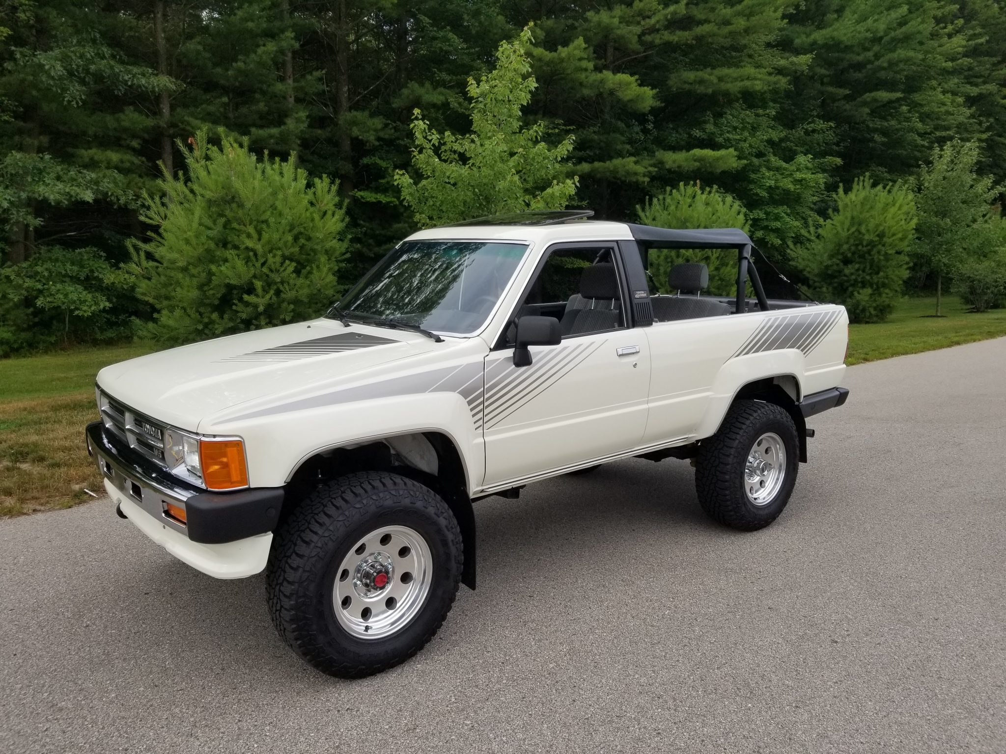 Polished aftermarket 16″ wheels wear Goodyear All Terrain tires, and a set of factory SR5 alloy wheels is included in the sale and pictured in the gallery. The front axle features manually-locking hubs, and mudflaps are fitted at all four corners.