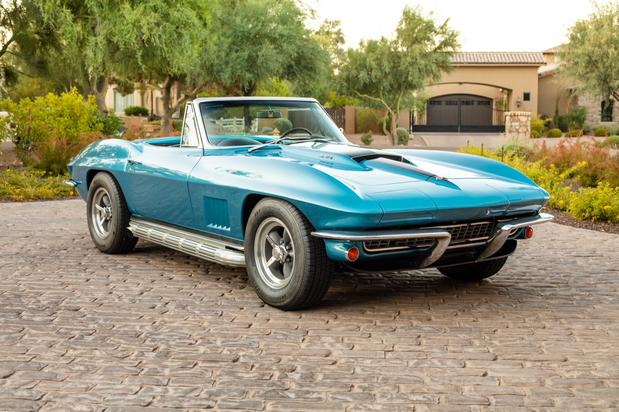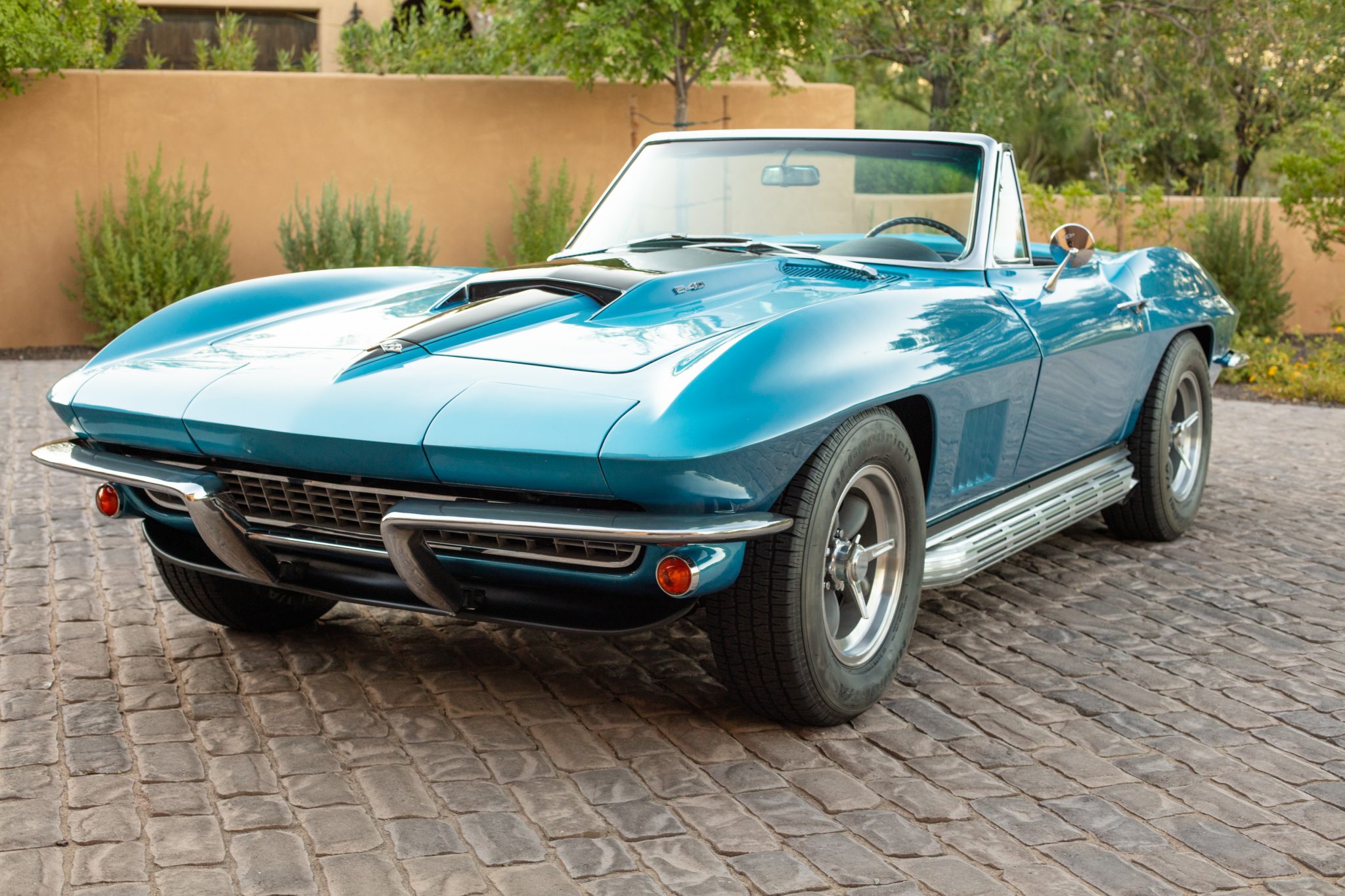 Torq Thrust–style 15″ wheels wear simulated three-ear knockoffs and are mounted with 205/70 BFGoodrich Radial T/A tires. Braking is carried out by four-wheel discs that are said to have been upgraded using stainless-steel sleeved calipers and fitted with replacement Delco rotors, rubber brake hoses, and a master cylinder during the seller’s ownership. Suspension modifications include QA1 rear shocks, a Vette Brakes & Products 330-pound rear spring, and adjustable strut rods.