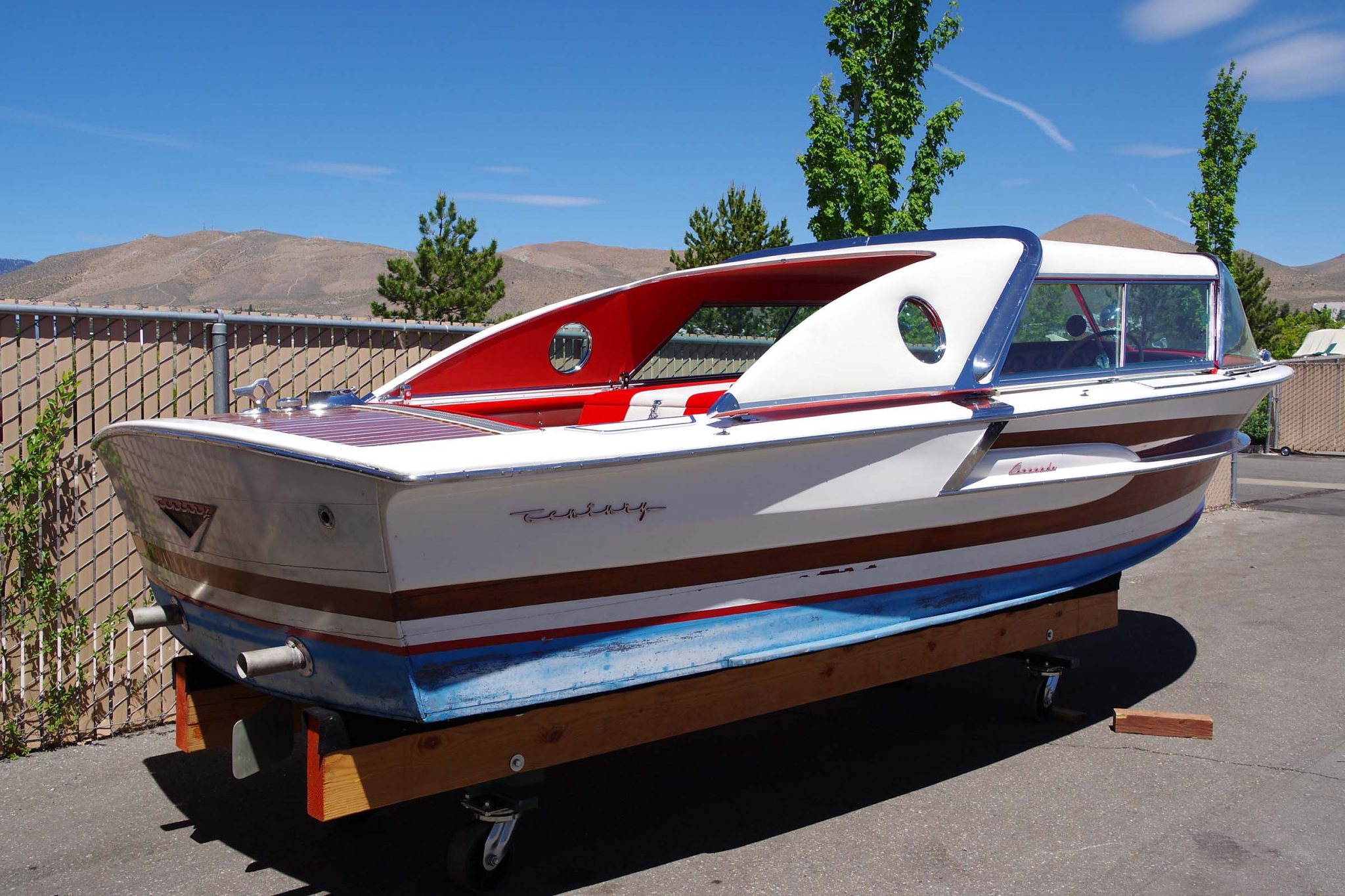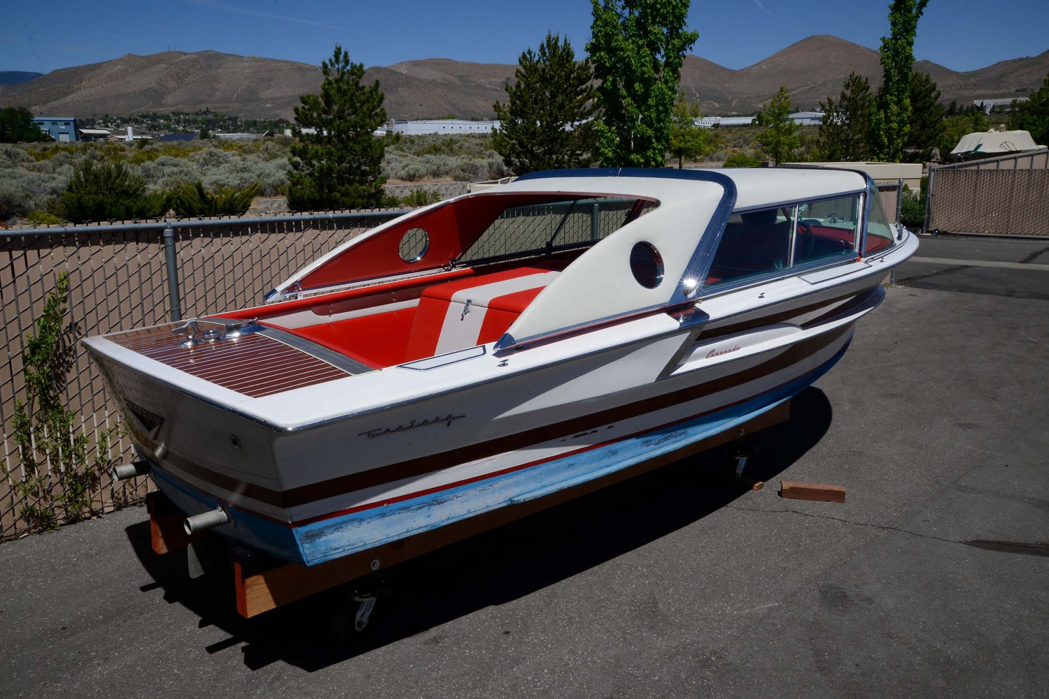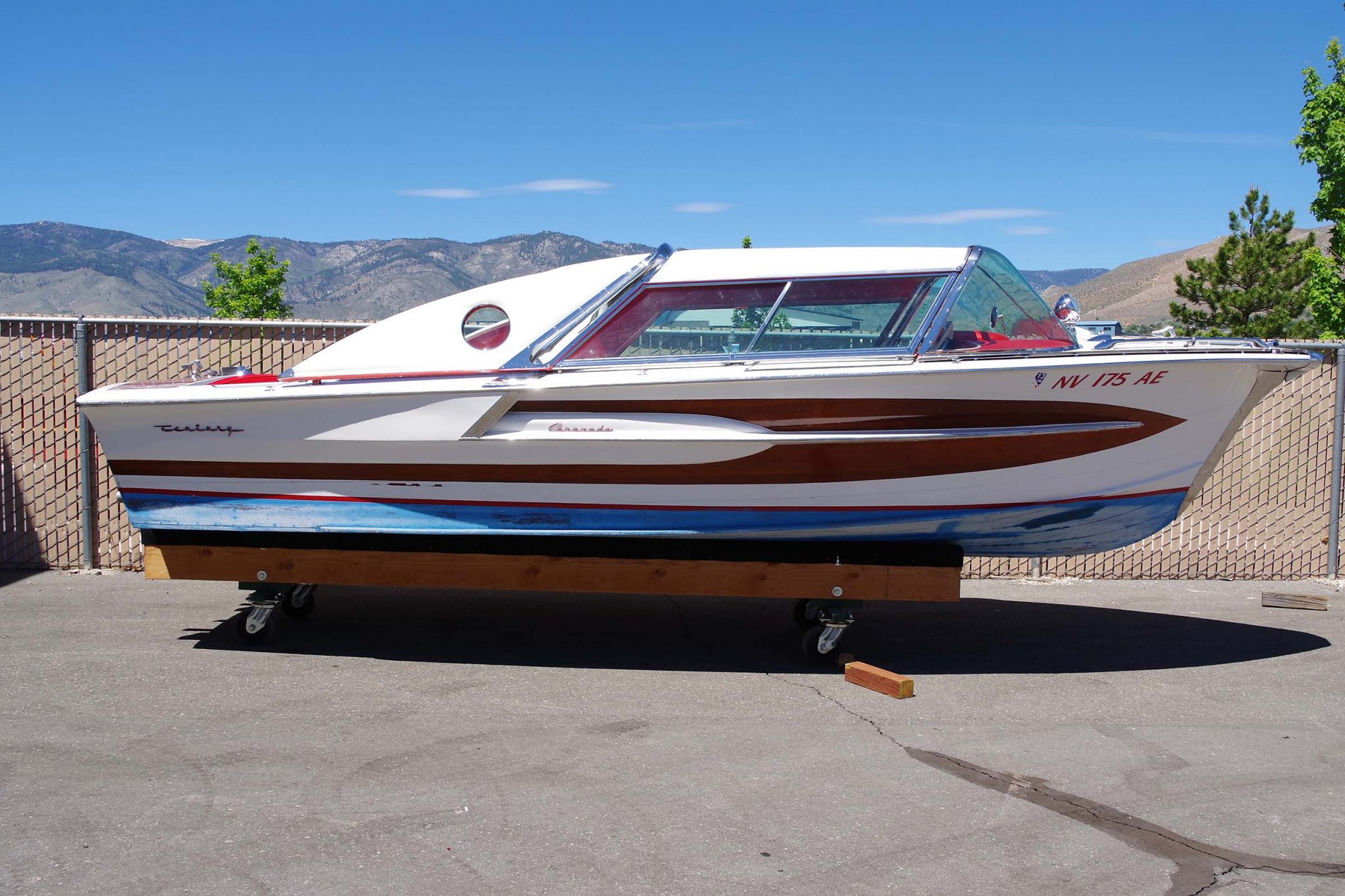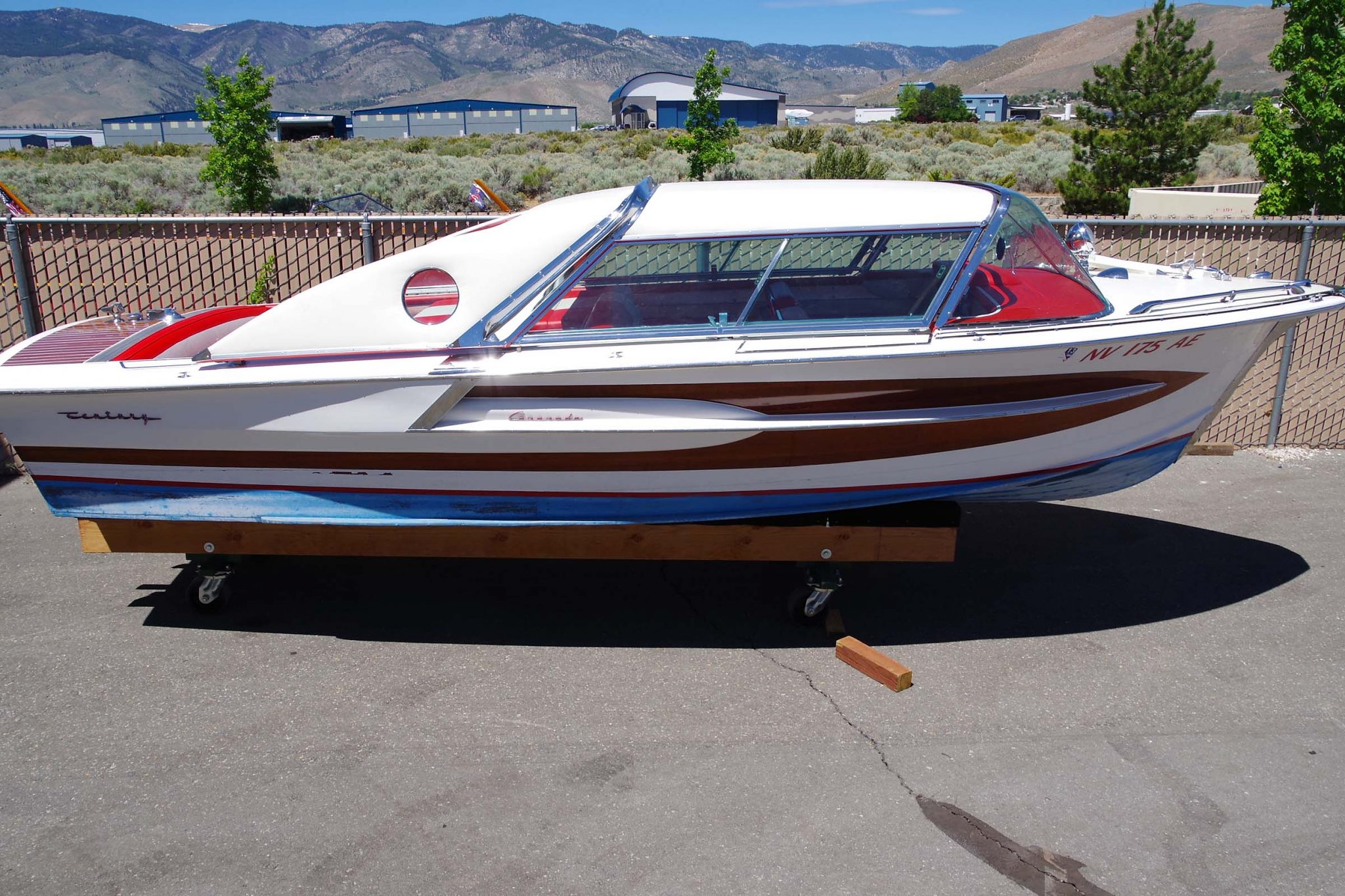 The hardtop is wrapped in white vinyl and can slide back to provide an open-air cockpit. The retractable roof also features sliding plexiglass side windows and aft portholes. The fixed, wrap-around windscreen is trimmed with polished metal. Note also the polished intake-style trim piece at the point of the bow.