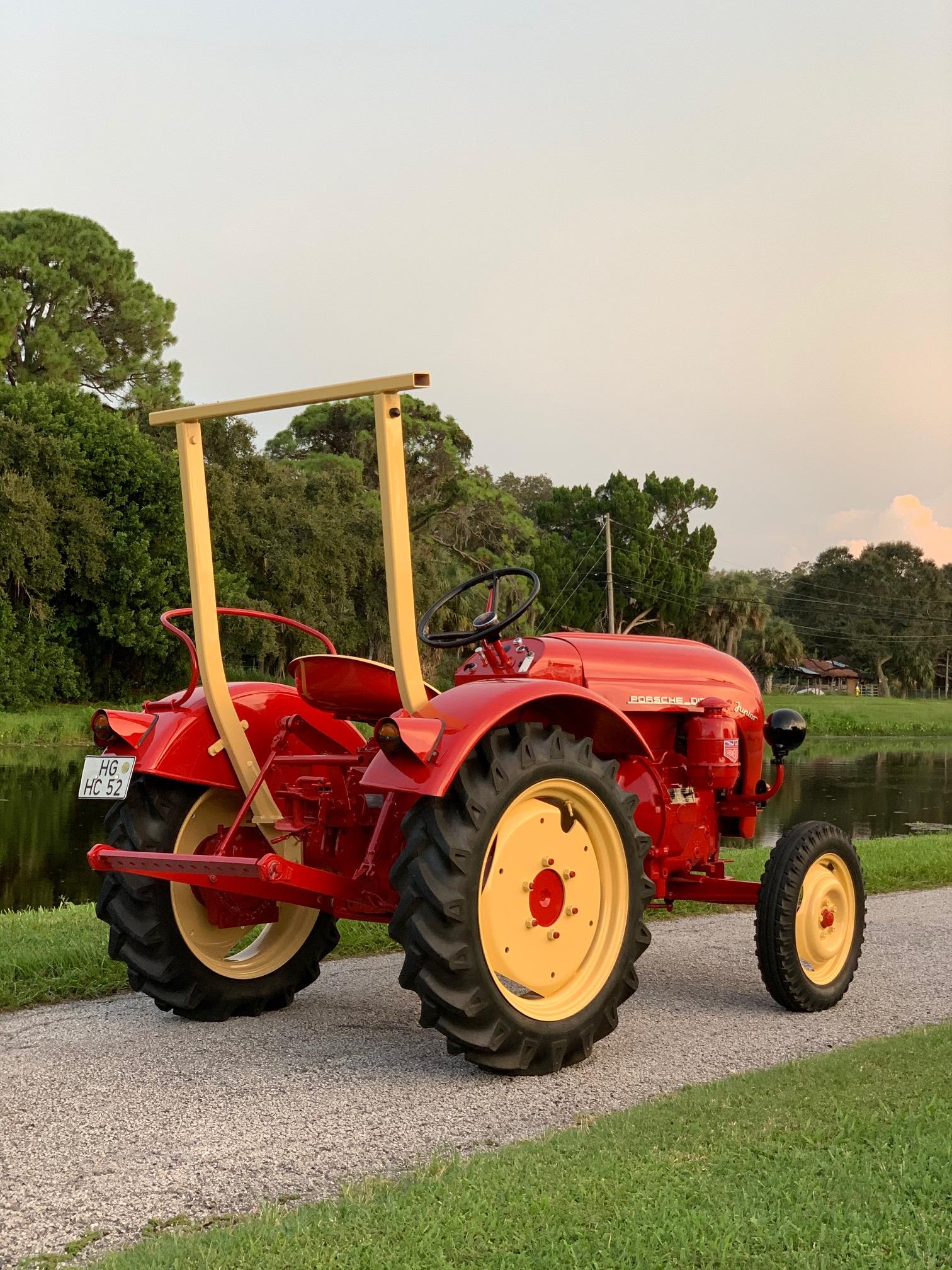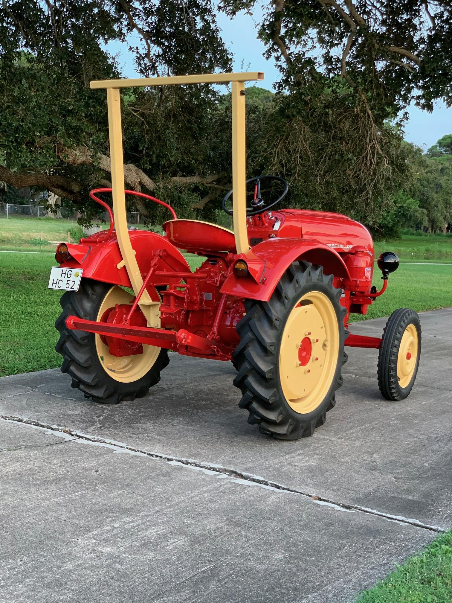 The tractor is equipped with a rollover bar, forward- and rear-facing PTOs, and a Bosch height-adjustable hitch. Cream-colored steel wheels wear 4.50-16 Continental front tires and 8.3/8-24 Agrar rubber in the rear.
