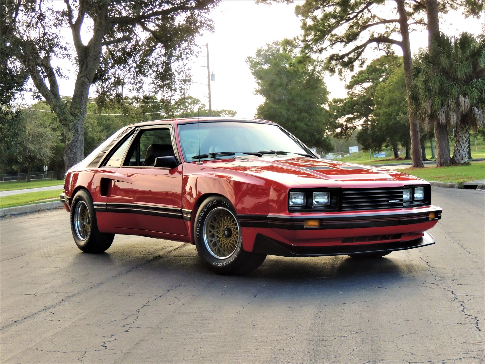 Three-piece 15″x 8″ BBS wheels feature polished lips, gold centers, and Ford center caps, and are mounted with period Firestone Firehawk SS tires sized 255/60 all around. The suspension features Koni F81 shocks, and braking is handled by front discs and rear drums.