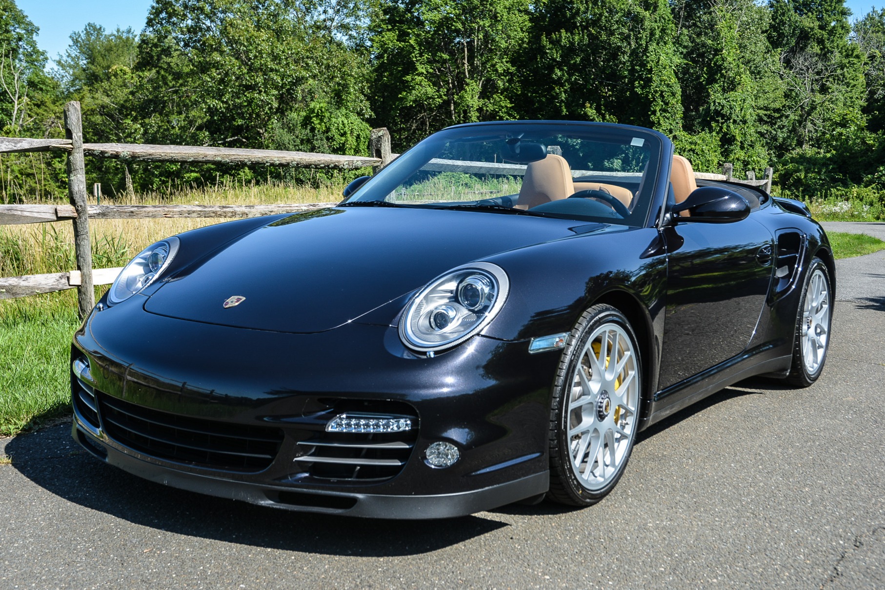 Center-lock 19″ RS Spyder wheels wear Bridgestone Potenza RE050 tires measuring 235/35 up front and 305/30 out back. Ceramic Composite Brakes (PCCB) were standard on the Turbo S and feature yellow-finished calipers.