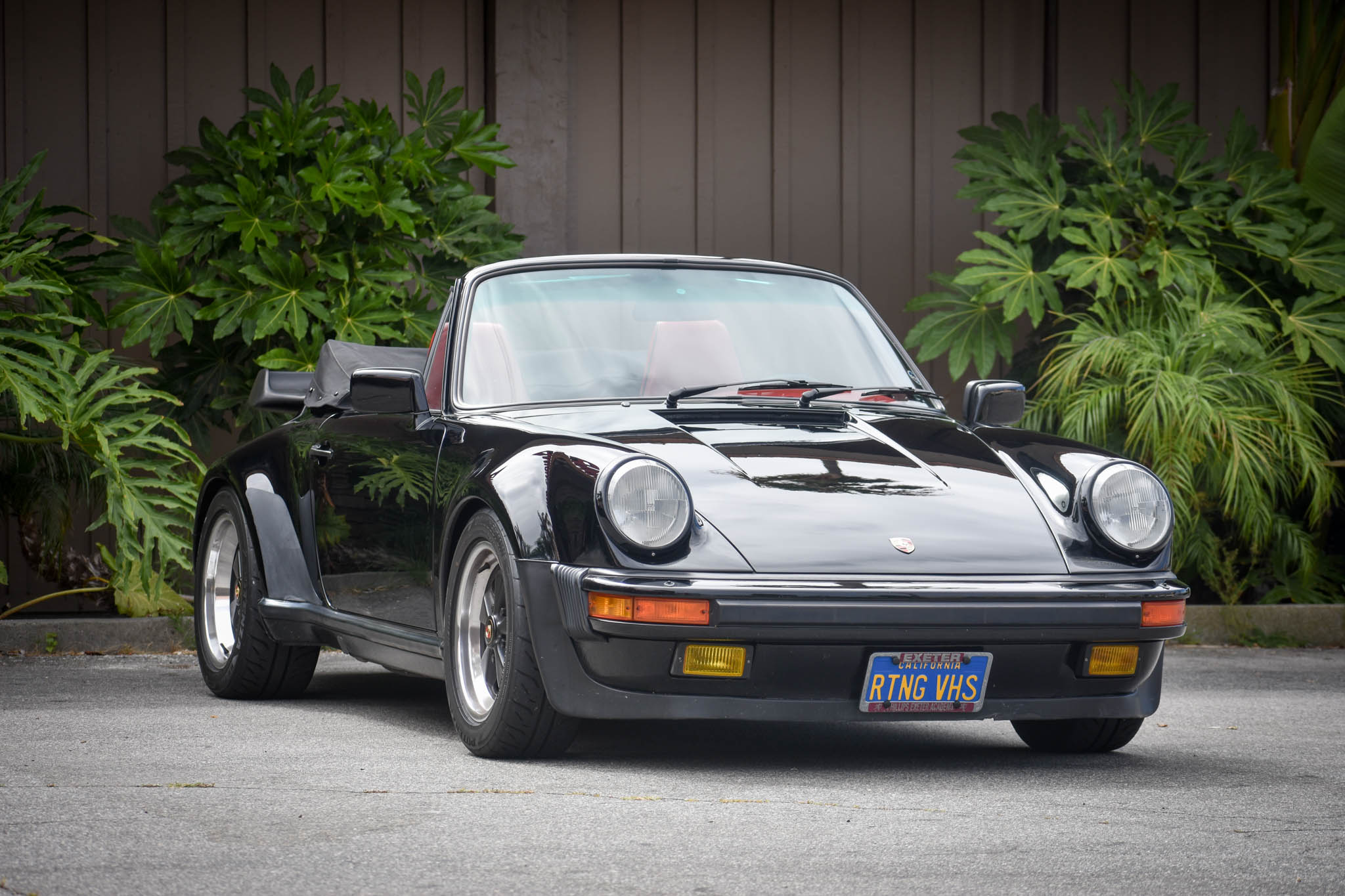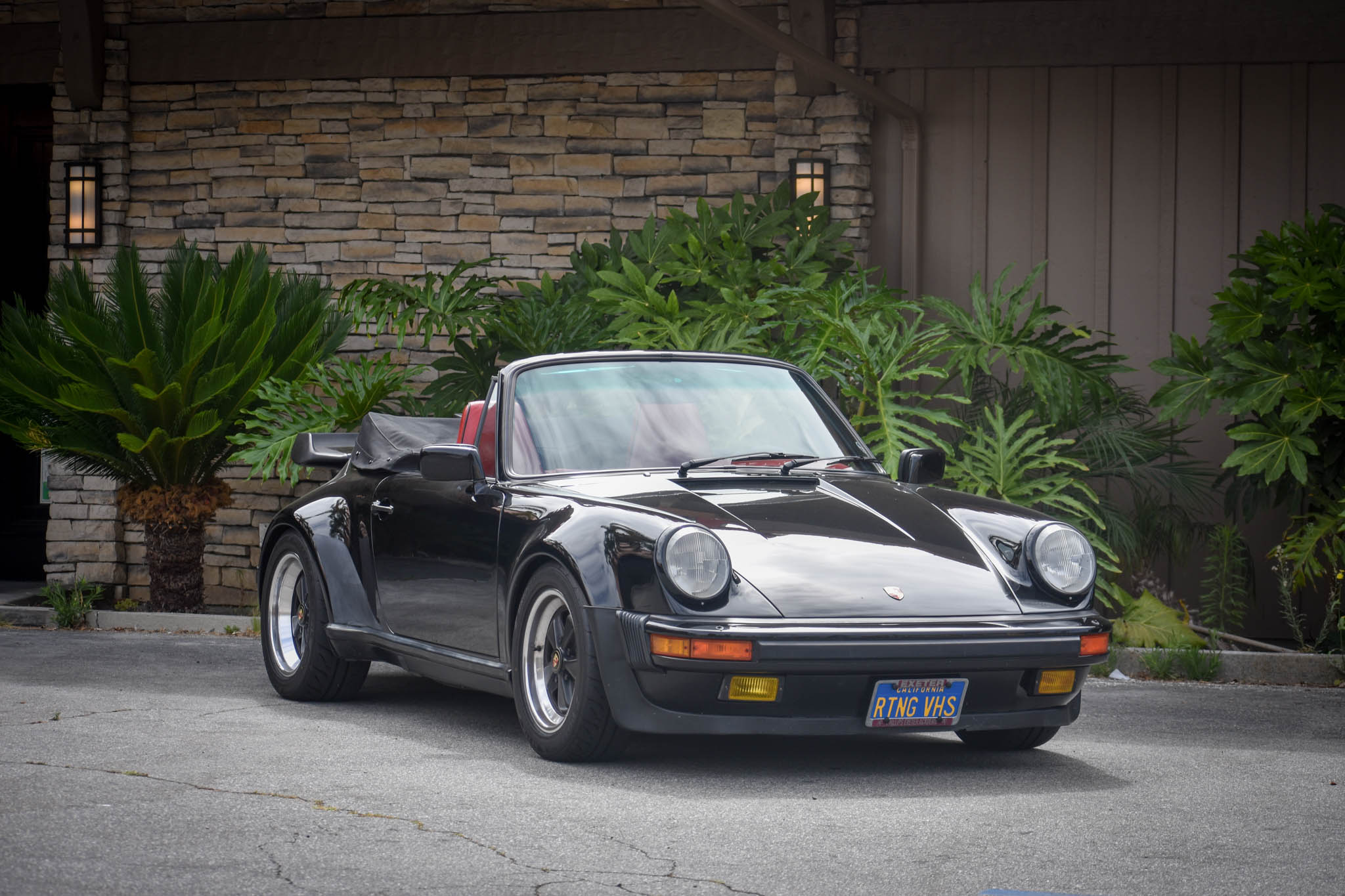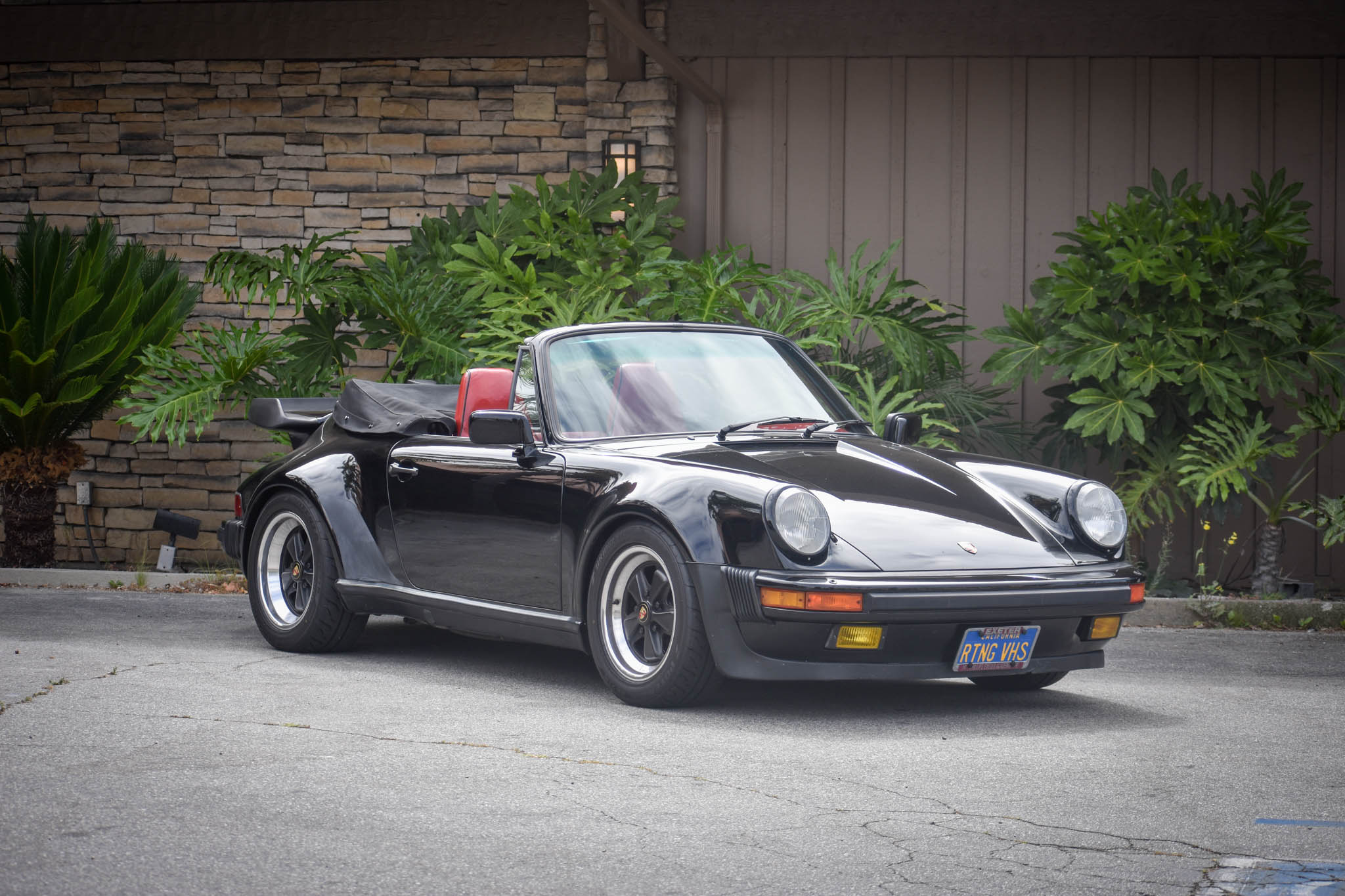 Staggered-width 16″ Fuchs wheels are mounted with Bridgestone Potenza RE-71R tires, and new wheel studs, lug nuts, and wheel spacers were fitted in 2018. New Bilstein dampers were installed in 2017, and in 2018 the car also received a front strut tower bar, spring plate bushings, a four-wheel alignment, and corner balancing. The convertible top received a new latch, hardware, lower seals, and an adjustment in September 2017.