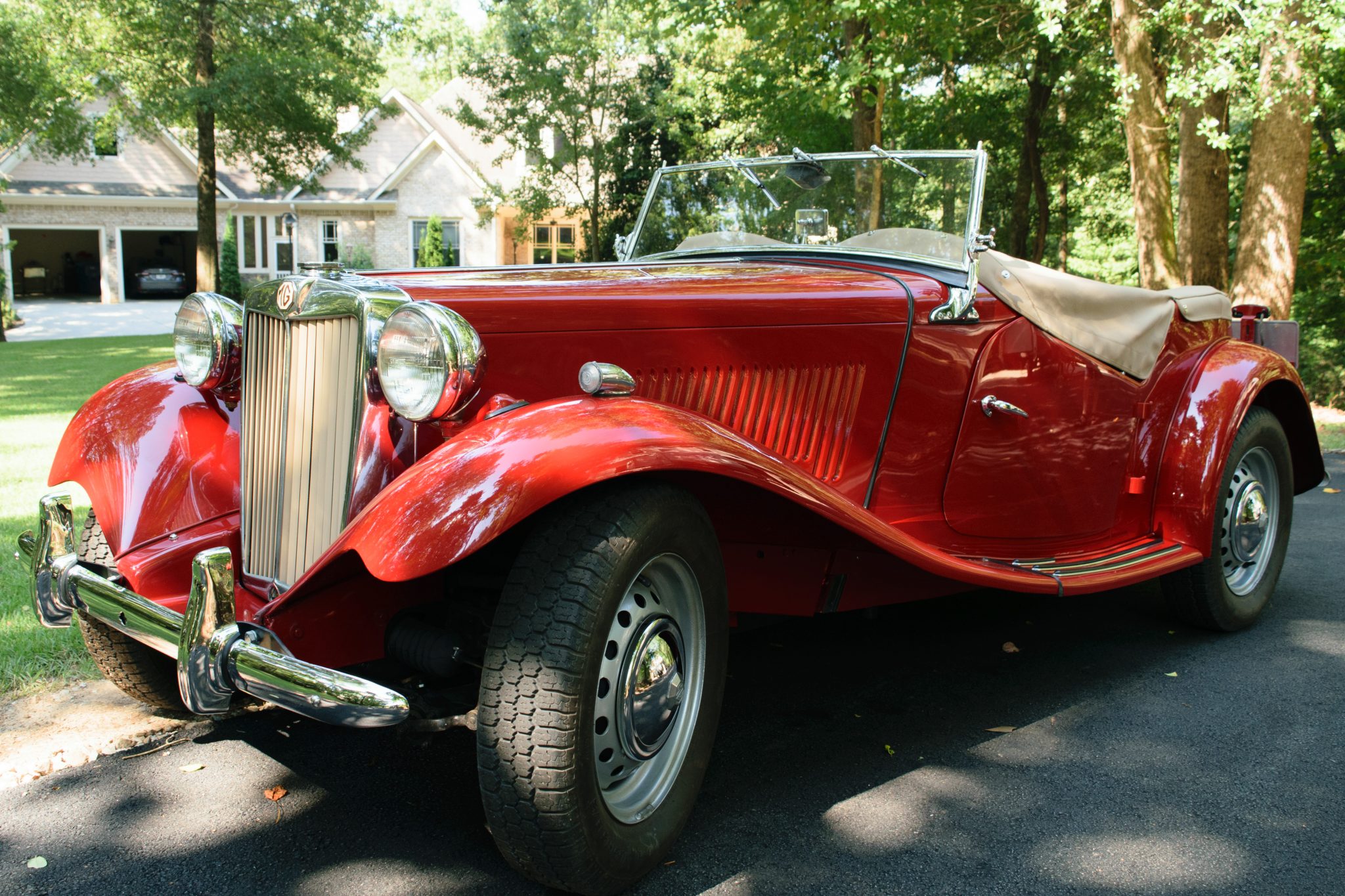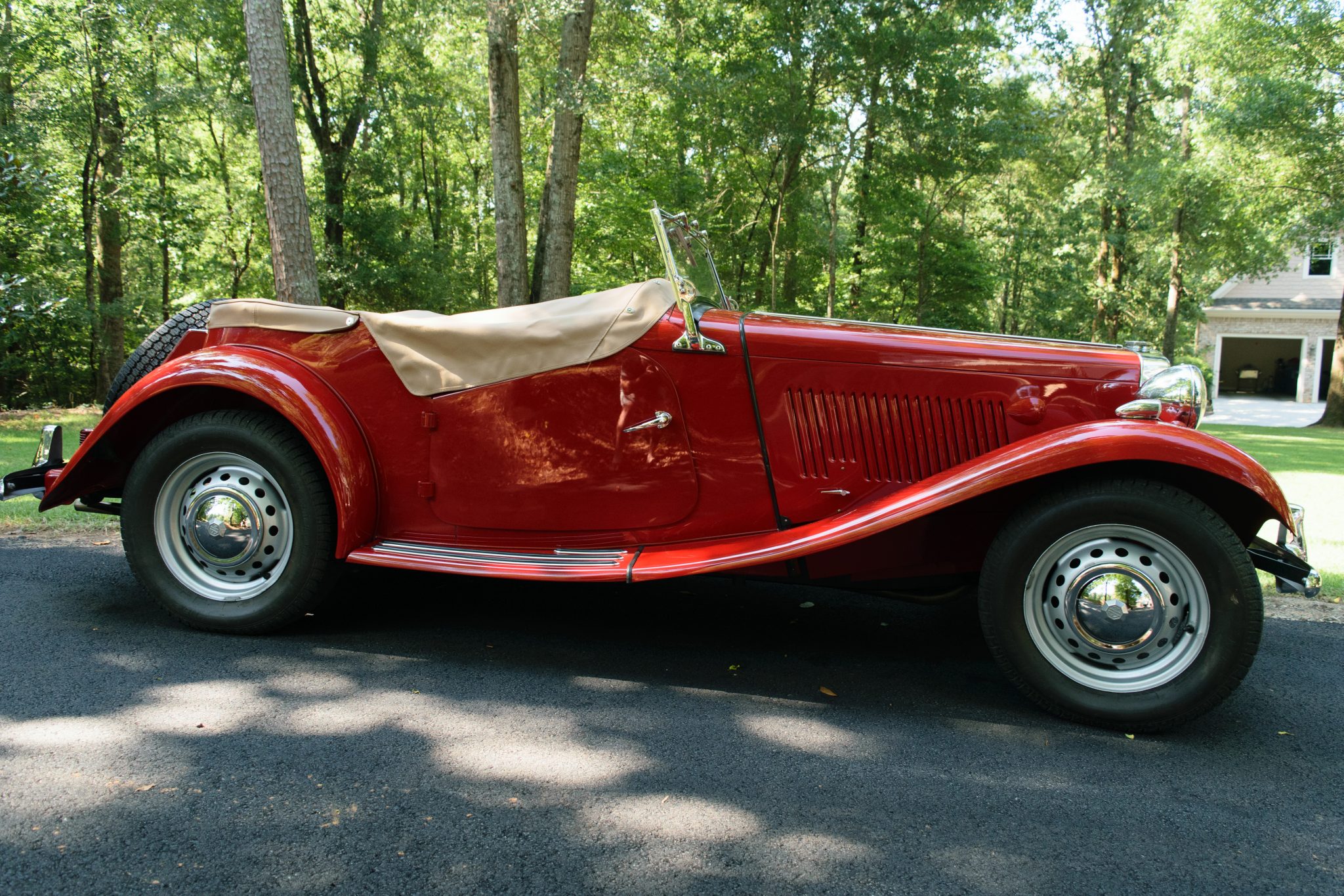 The replacement tan canvas top features a vinyl rear window and is shown both lowered and raised. Robbins side curtains and a tonneau cover are included in the sale. Hammered silver-finish 15″ steel wheels wear chrome hubcaps and Nankang 165 tires, and a matching spare is mounted to the fuel tank at the rear. The front and rear Andrex shocks were replaced in 2004.