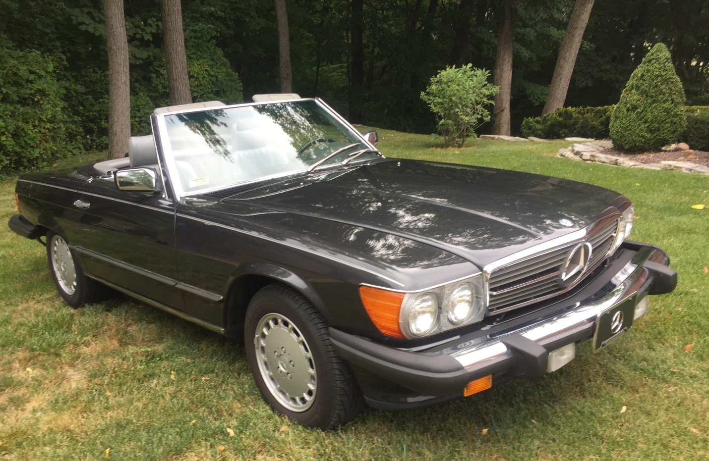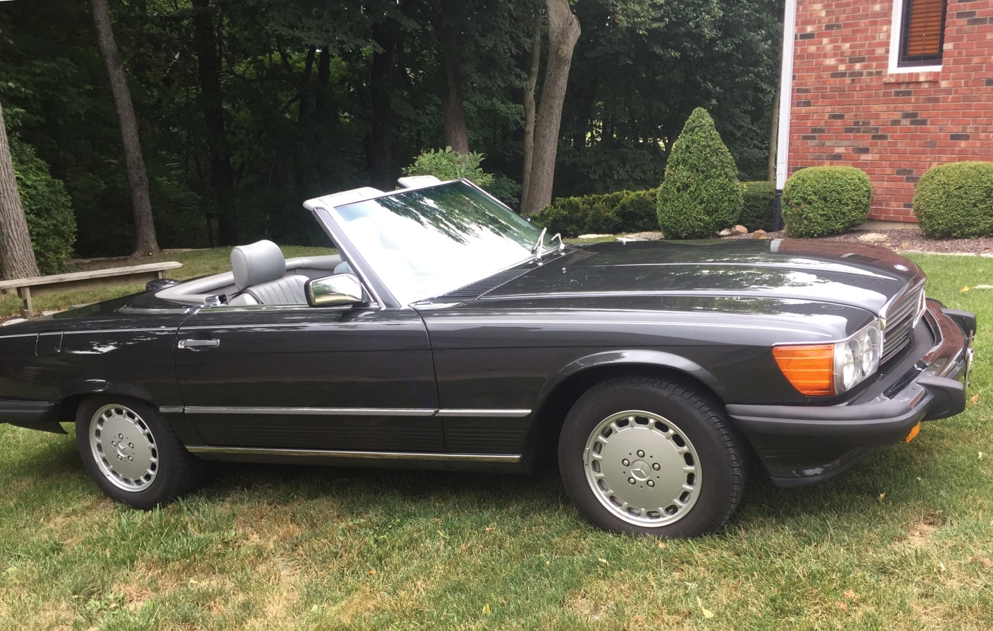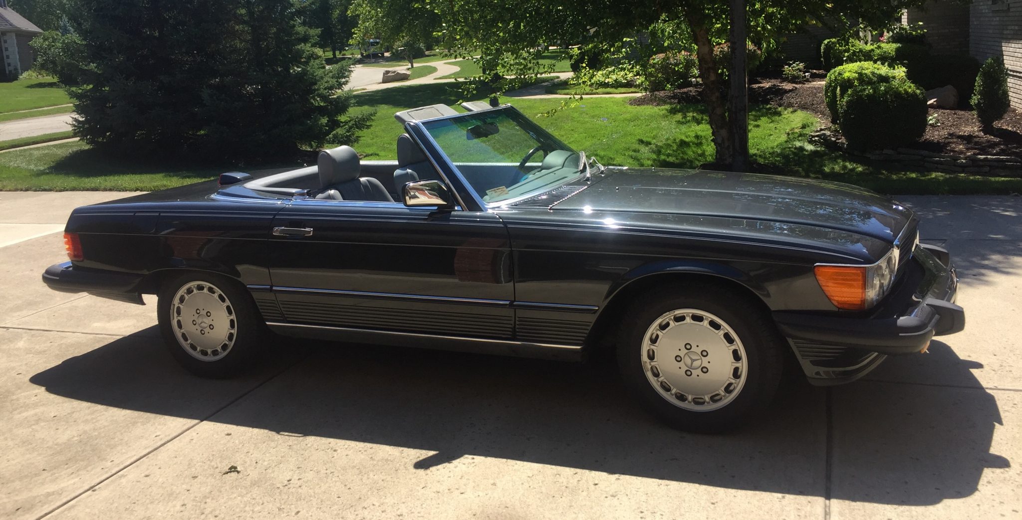 The matching factory hardtop is shown installed in the photo above. Dings are pictured in the lower body cladding and rear bumper. Stock 15” Gullideckel alloy wheels wear Michelin Hydro Edge tires.
