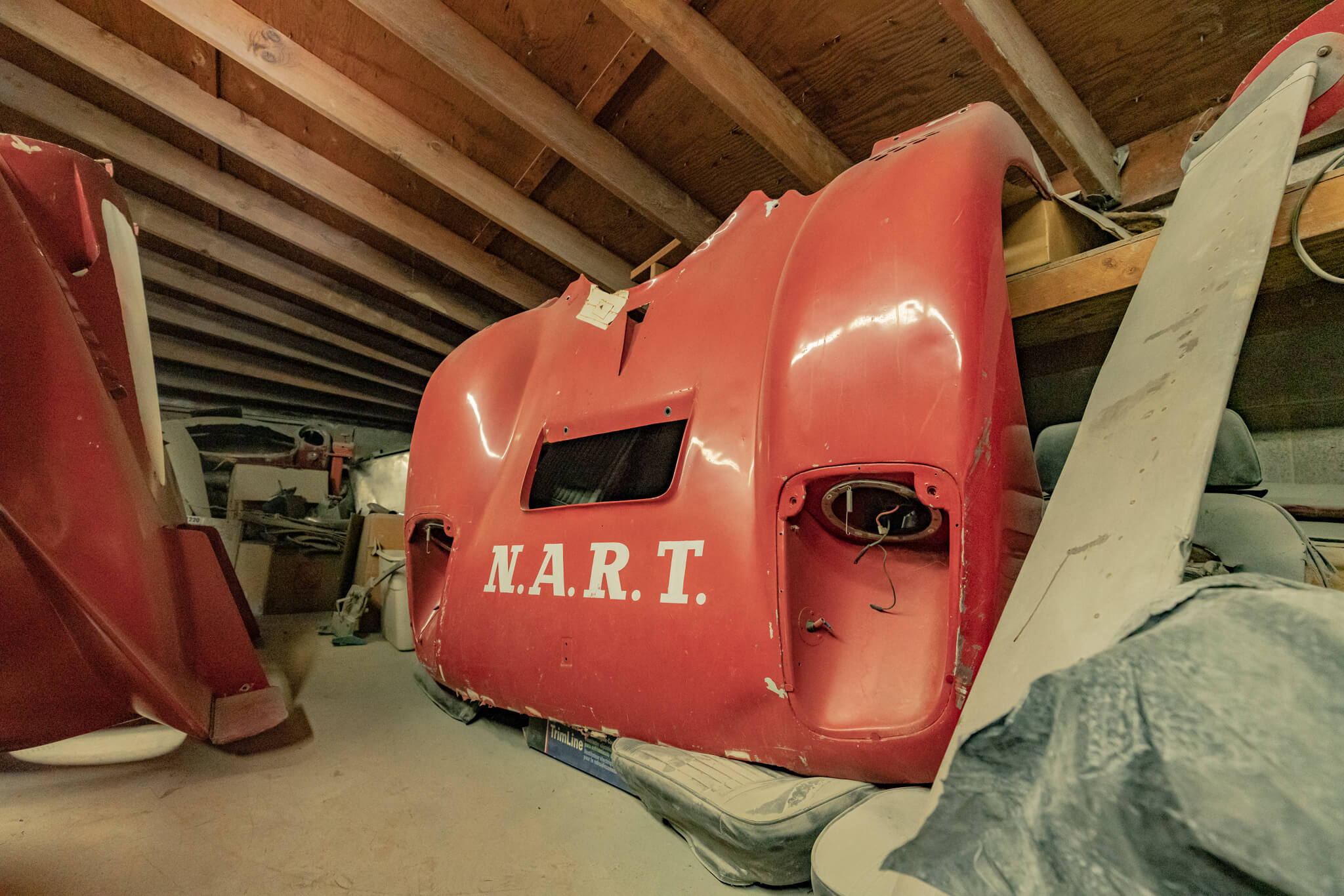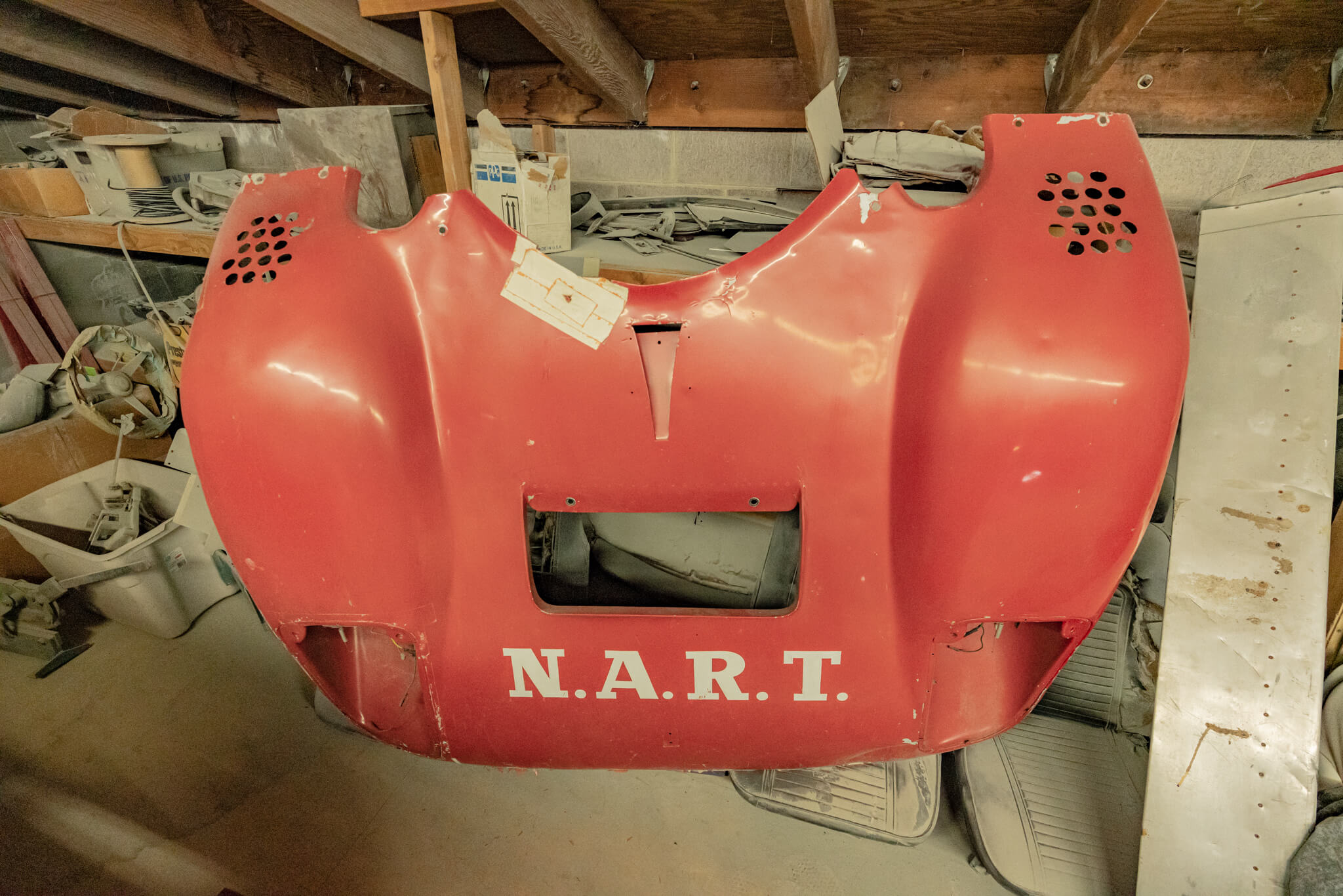 Wearing an older red finish, the nose retains white N.A.R.T. and Goodyear graphics. Other features include headlight buckets, a center vent, and a NACA duct.