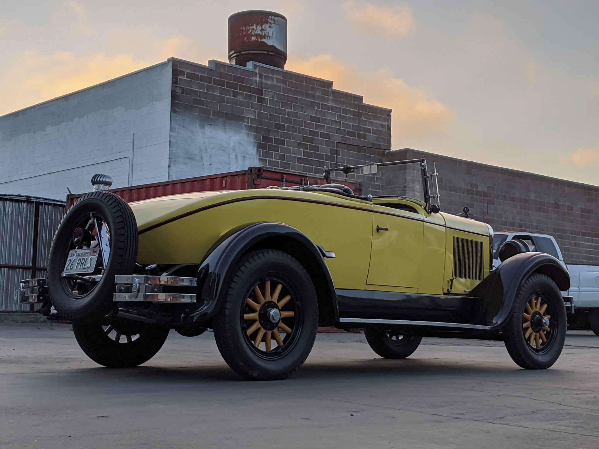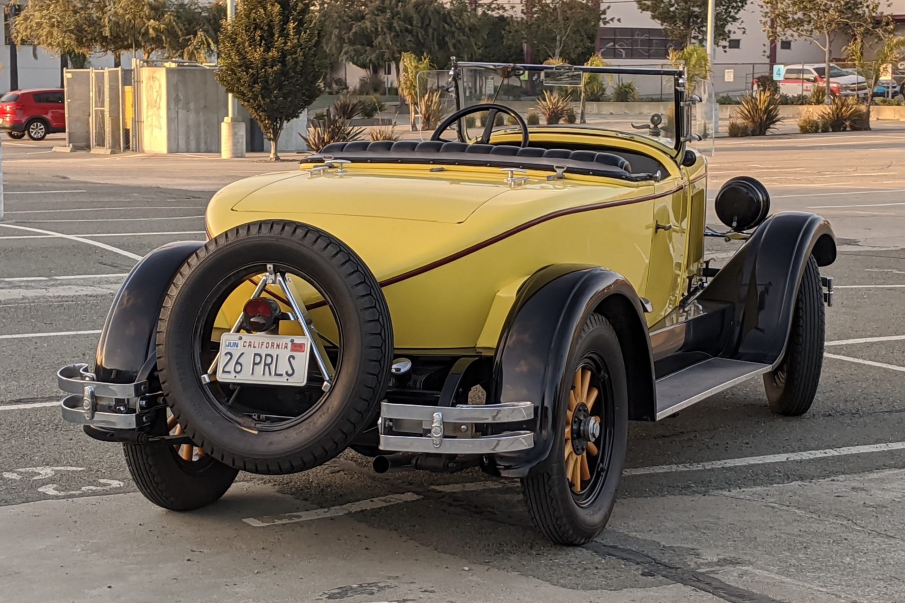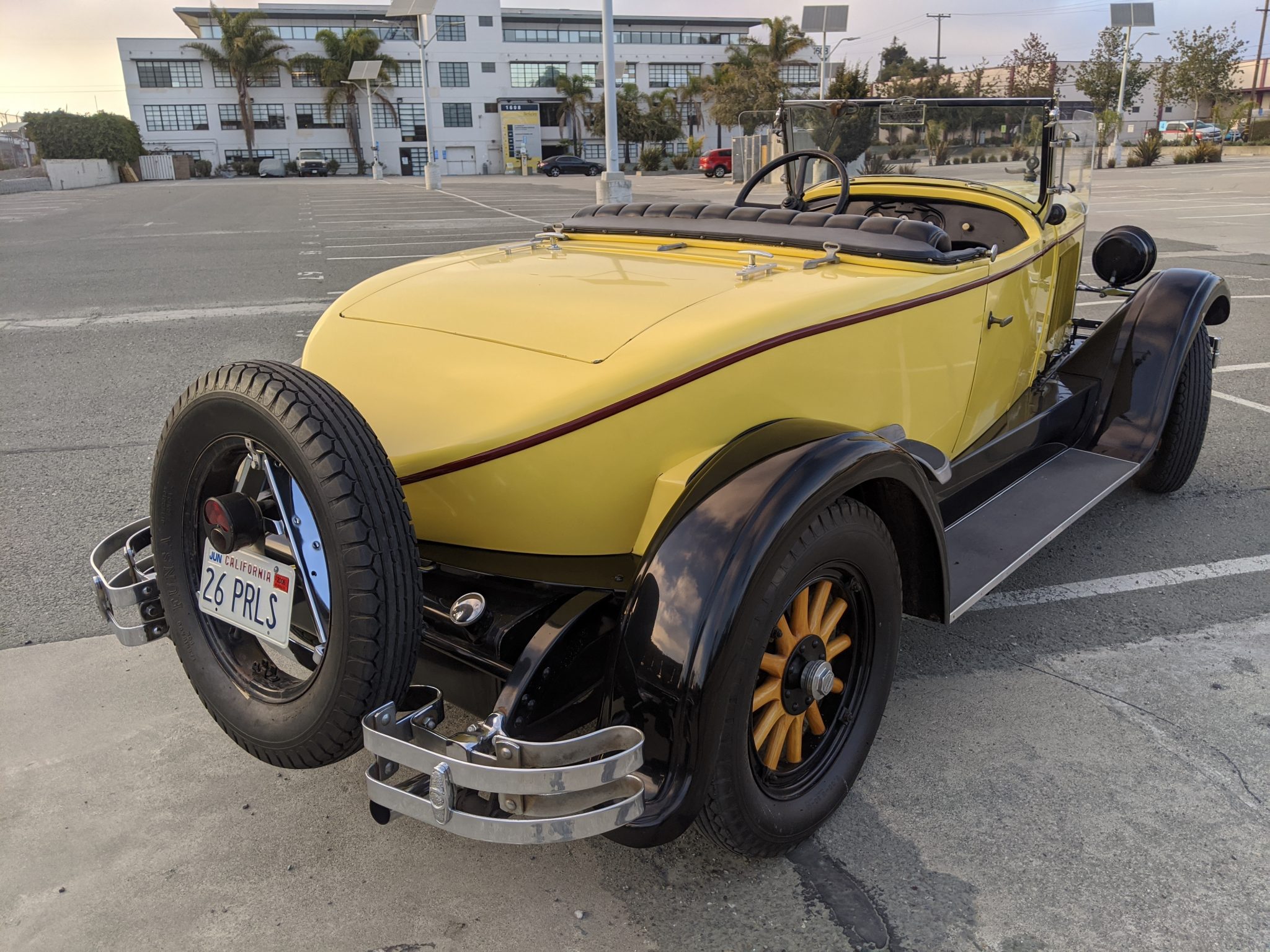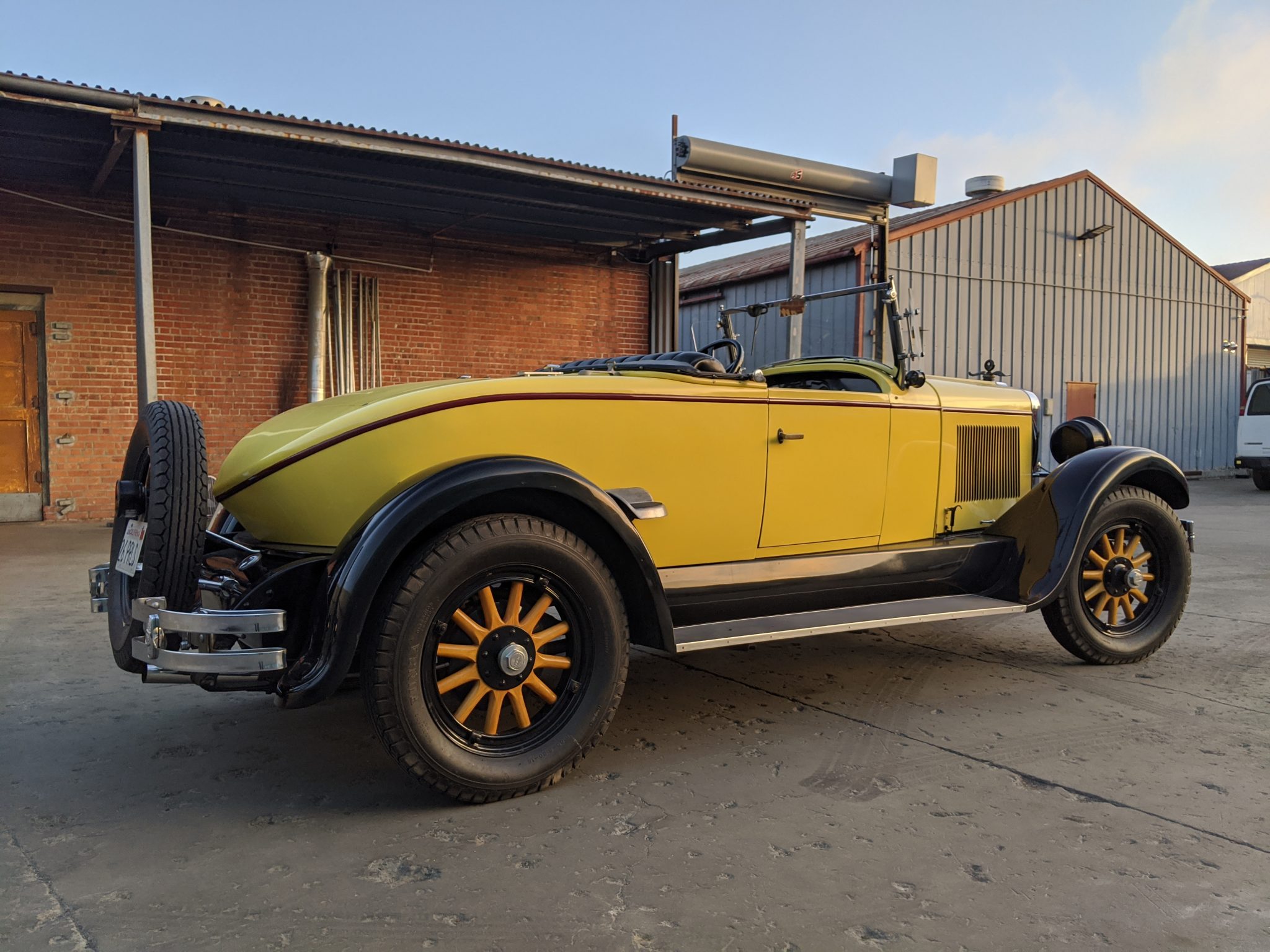 The car features a winged brass hood ornament with an inset water temperature gauge, accessory wind wings, an access step for the rumble seat, and a centrally-mounted brake light. Varnished wood-spoke wheels are mounted with Funsa 6.00-6.50-19 bias-ply tires that should be replaced due to sidewall cracking. A matching steel rim with a spare tire is mounted out back. A soft top and frame are included in the sale and can be seen in the gallery, though dry rot is noted in the wood cross members.