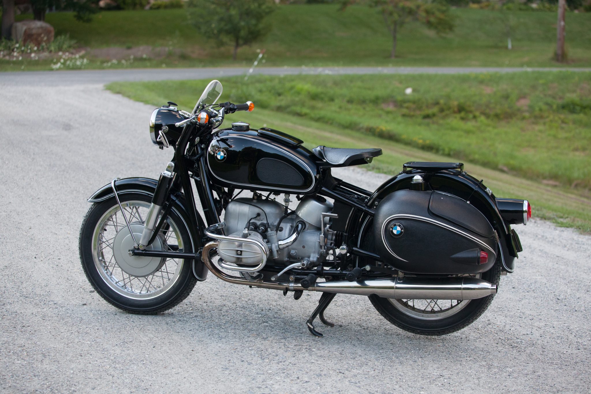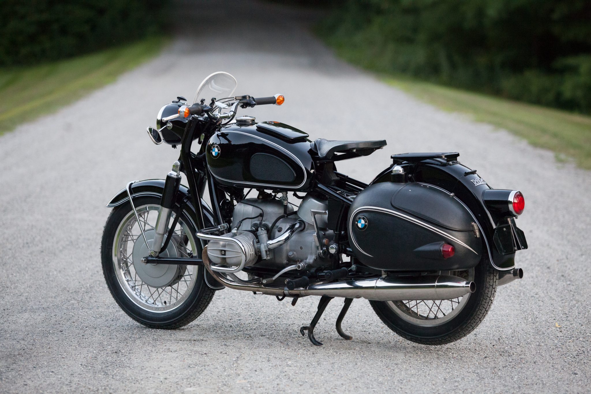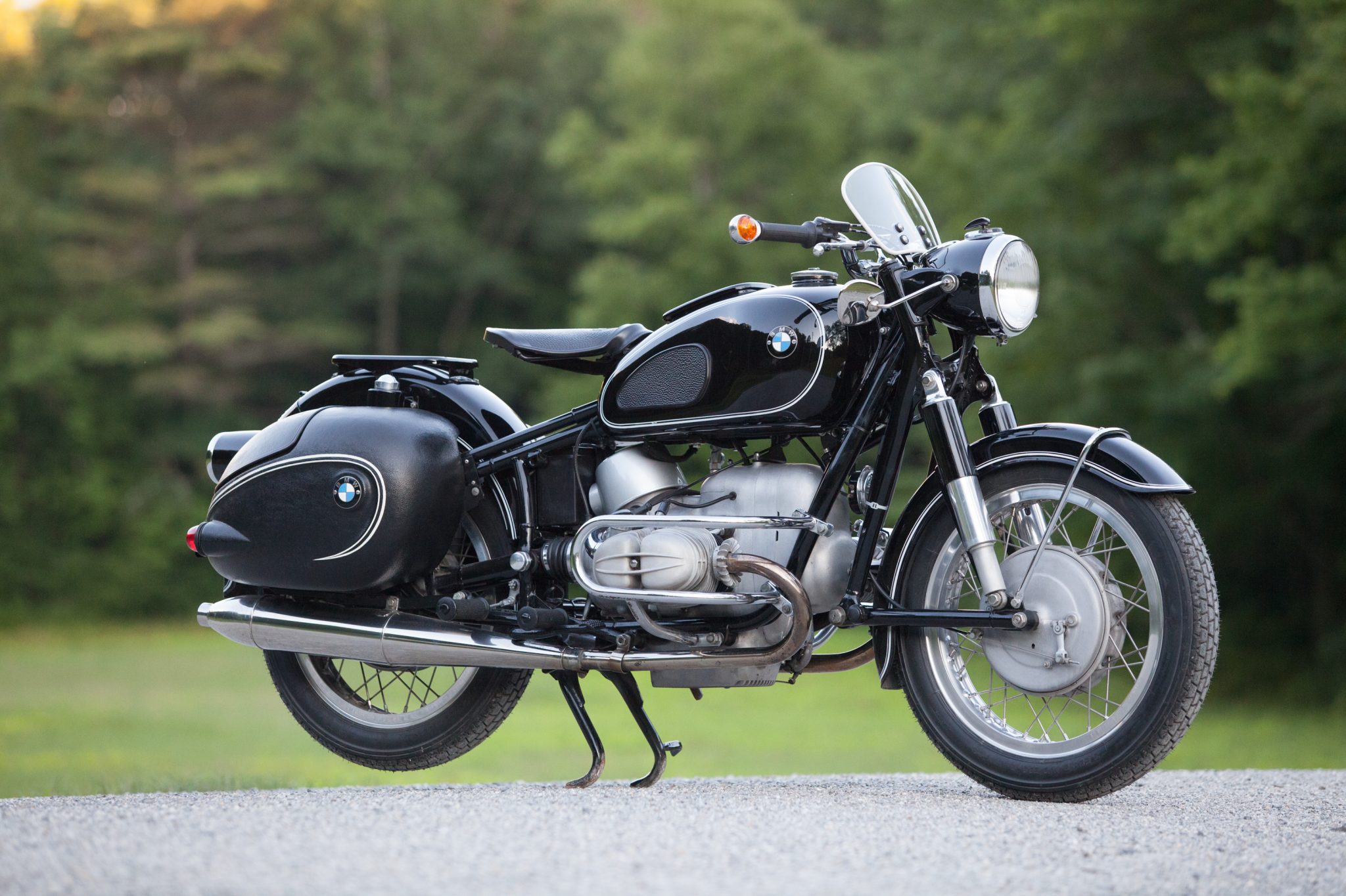 The bike is shown with and without accessories installed, including the Enduro saddlebags and the Hoske windscreen. It is also fitted with a 6.5-gallon Schorsch Meier sport tank with an integrated, lockable storage compartment, along with headlight-mounted mirrors and Hella bar-end turn signals.