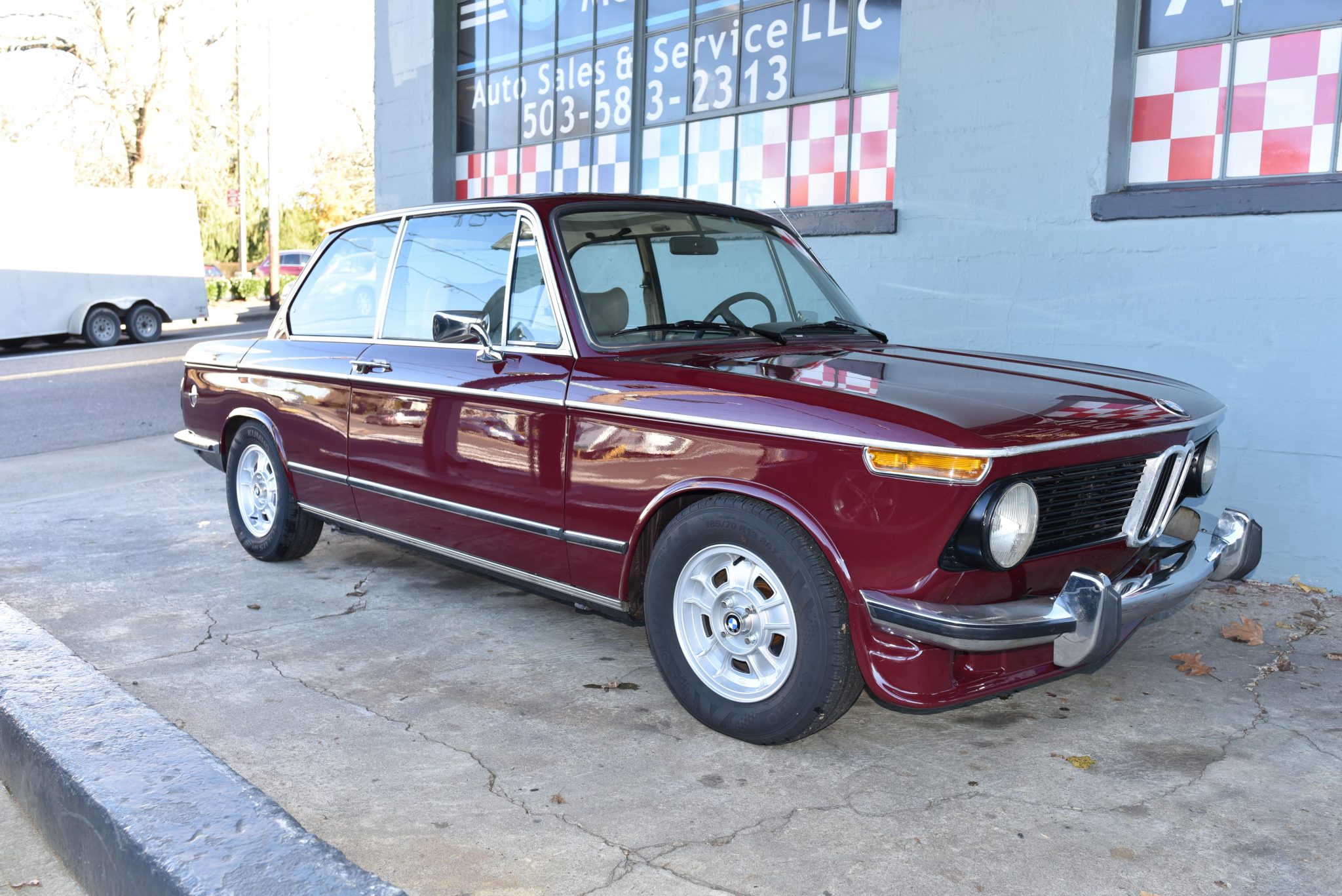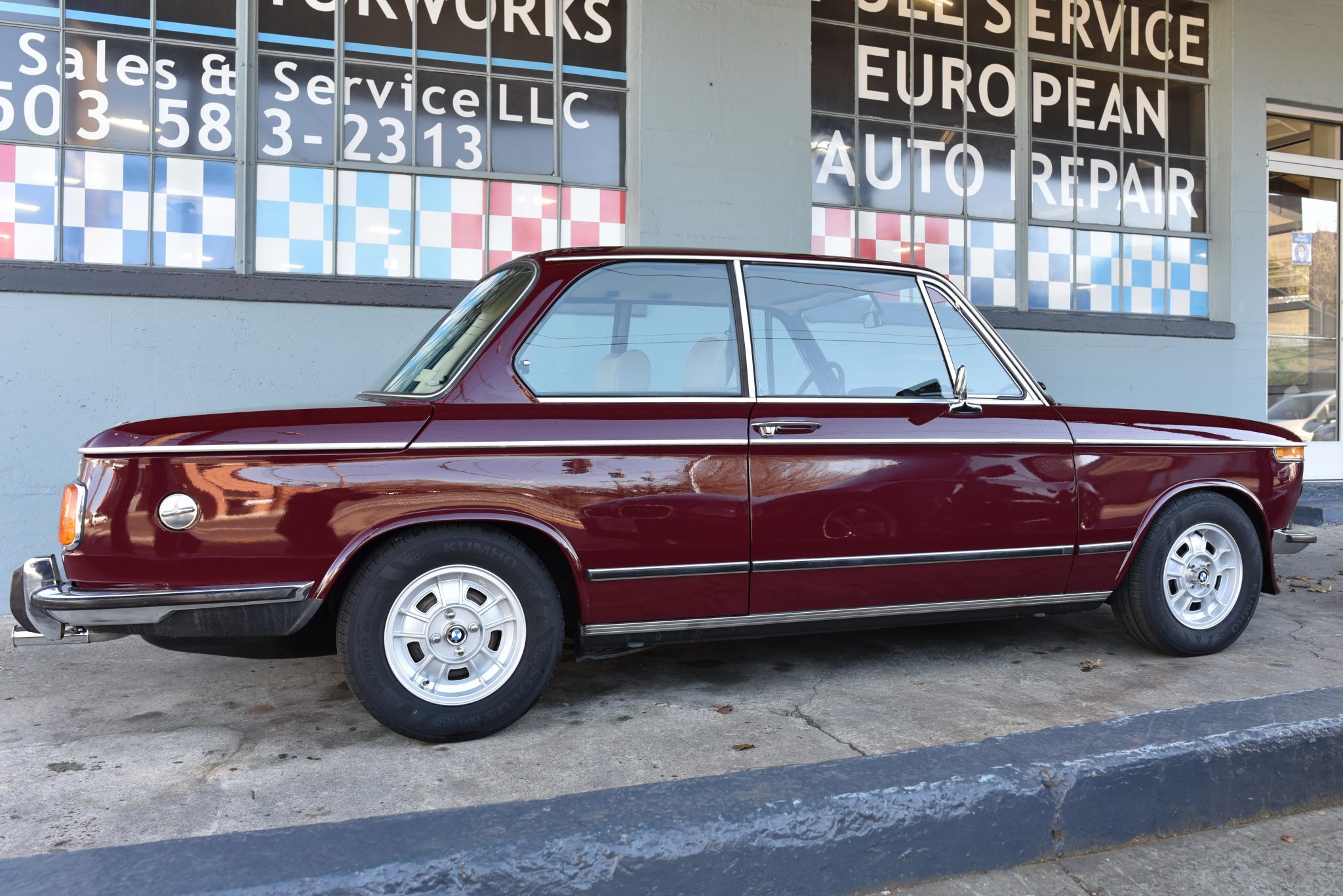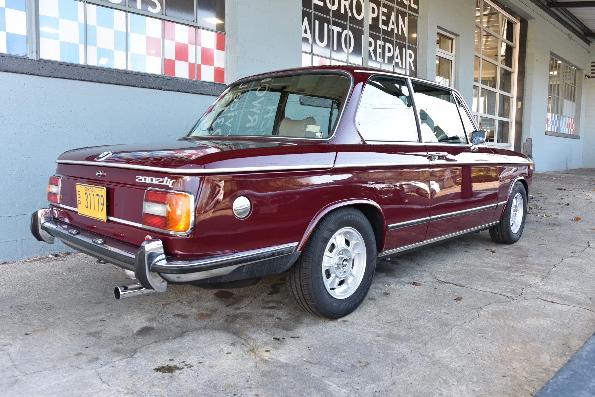 The selling dealer installed replacement 13″ BMW tii-specification wheels mounted with 185/70 Kumho Solus TA11 tires, and a fifth wheel and tire are located in the trunk. The suspension is modified with H&R springs and Bilstein Sport shocks, and additional service included: