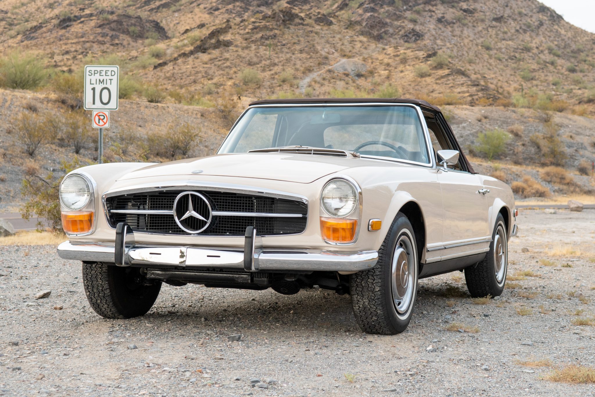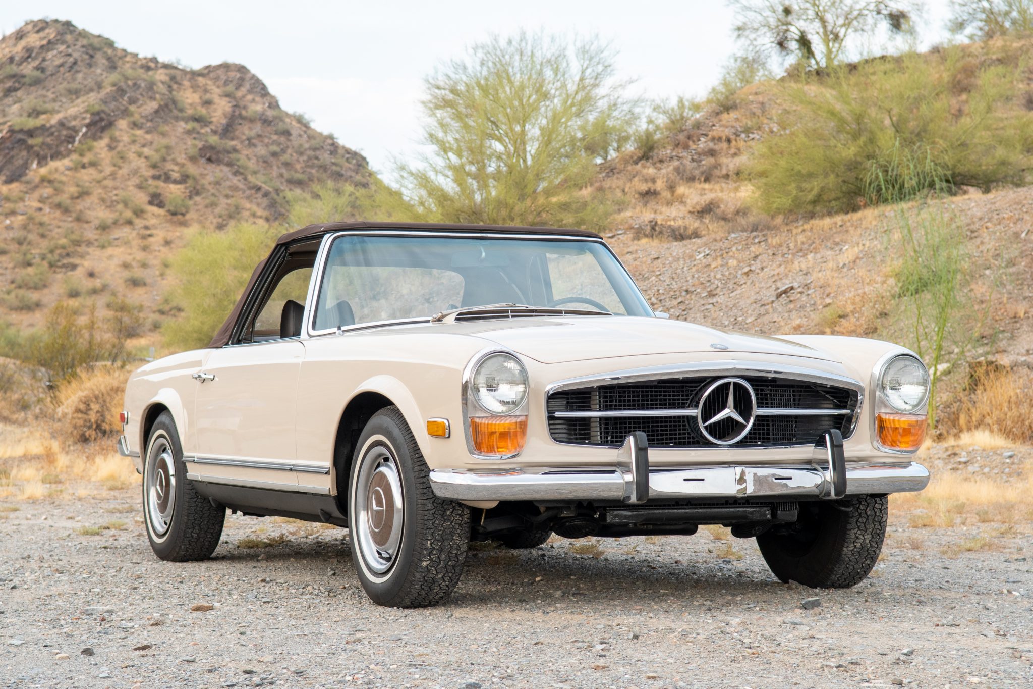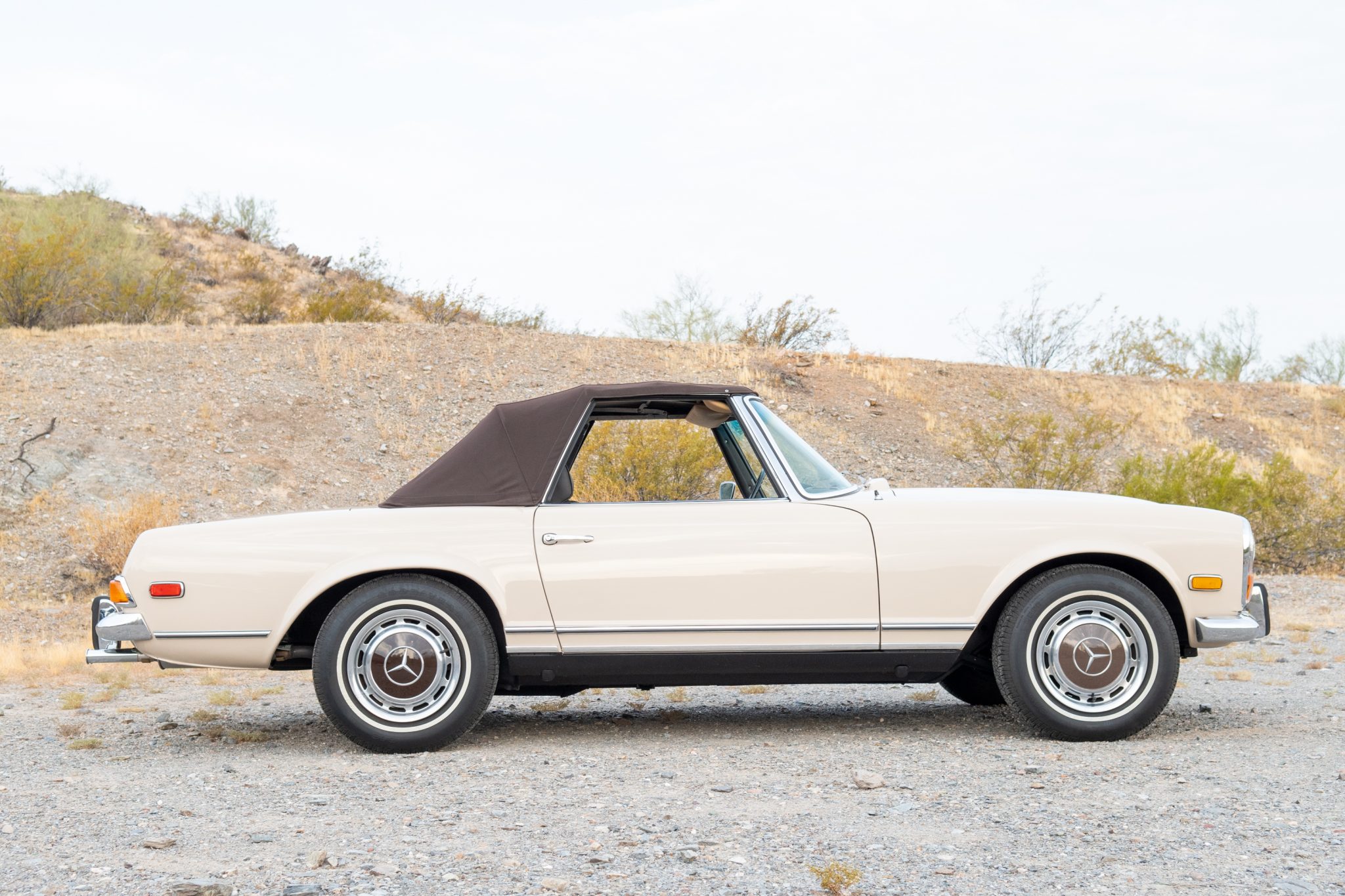 Factory 14″ steel wheels feature covers with brown centers that coordinate with the Pagoda hardtop, and the wheels are mounted with 195/75 Goodyear S4S whitewall tires. A spare wheel is mounted inside the trunk along with a jack and tool roll. The brake fluid was reportedly flushed in preparation for the sale.
