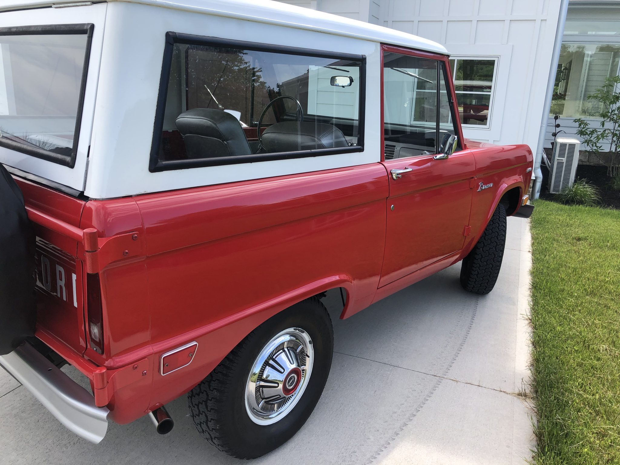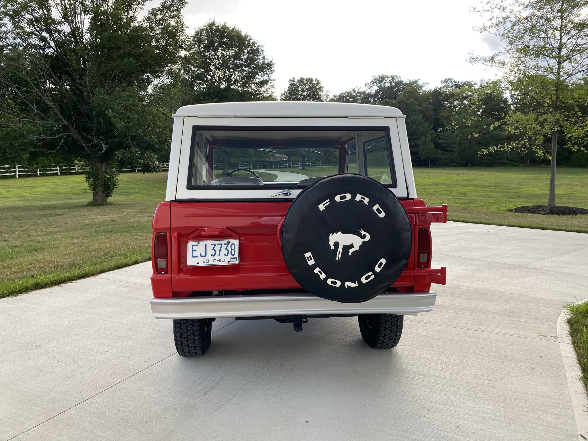 Factory 15″ steel wheels with polished covers wear Goodyear Wrangler Radial tires that measure 235/75 at all four corners. The front axle is equipped with manually-locking hubs, and a full-size spare is mounted on a swing-out carrier affixed to the split rear tailgate.