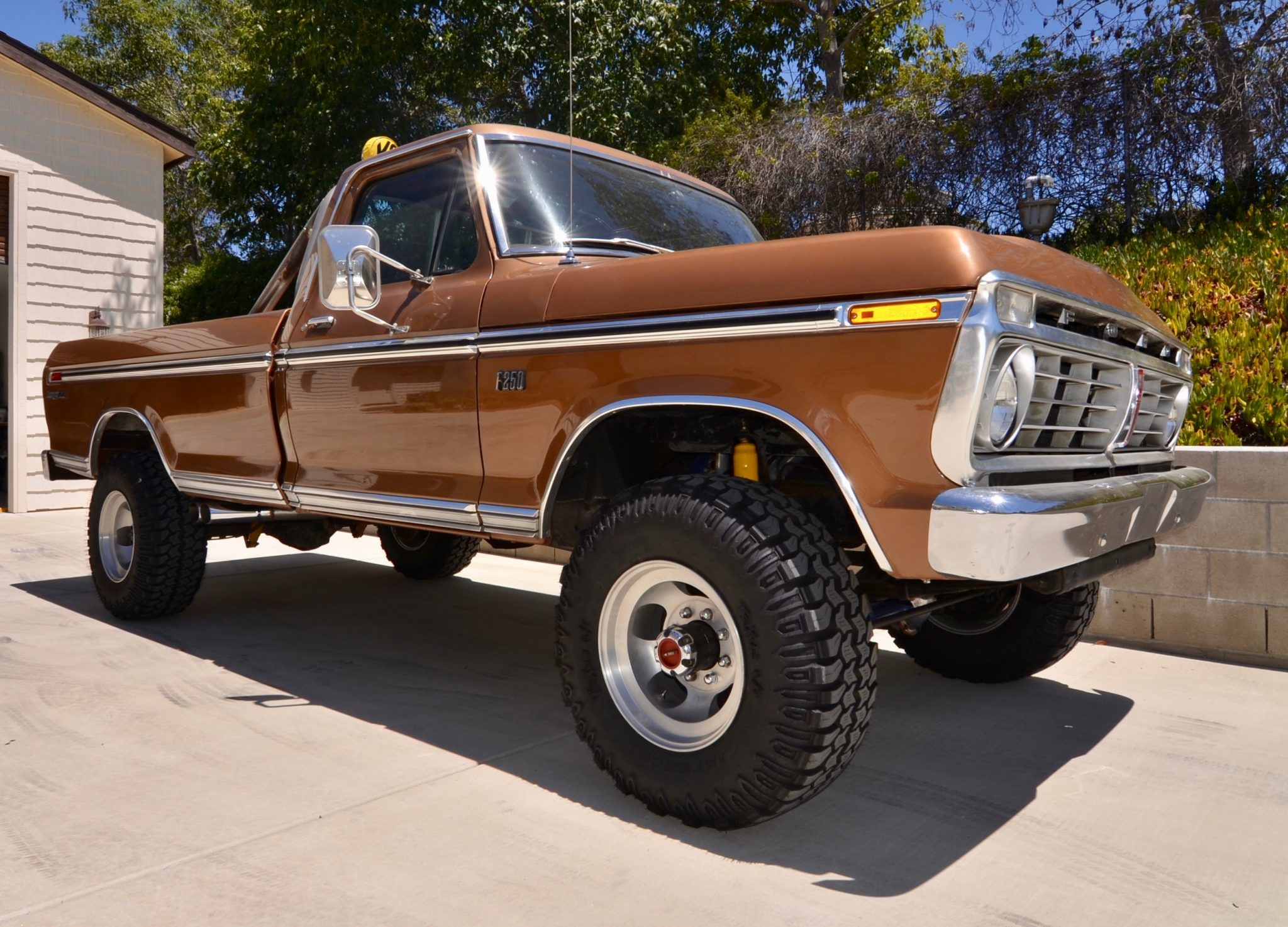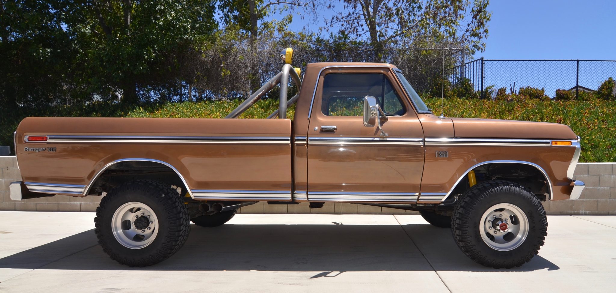16″ five-slot wheels with manually-locking front hubs are wrapped with 33×12.5″ Interco TrXuS mud-terrain tires. The truck is equipped with a factory power brake booster, and the seller states that the brake system was overhauled during current ownership.