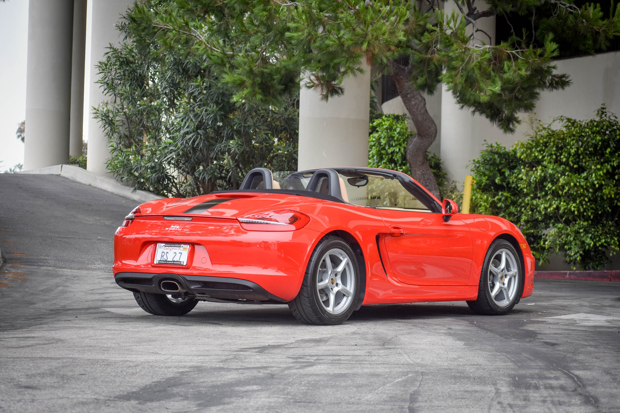 Factory 18″ five-spoke wheels feature colored Porsche-crest center caps and wear Bridgestone Potenza RE-71R tires measuring 235/45 up front and 265/45 out back that were installed in September 2019. Standard equipment includes cross-drilled brake rotors at all four corners, an Automatic Brake Differential (ABD), Anti-Slip Regulation (ASR), and Porsche Stability Management (PSM).