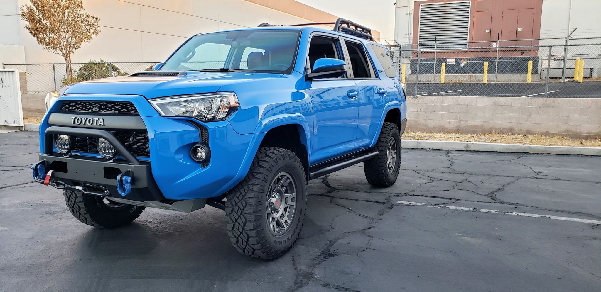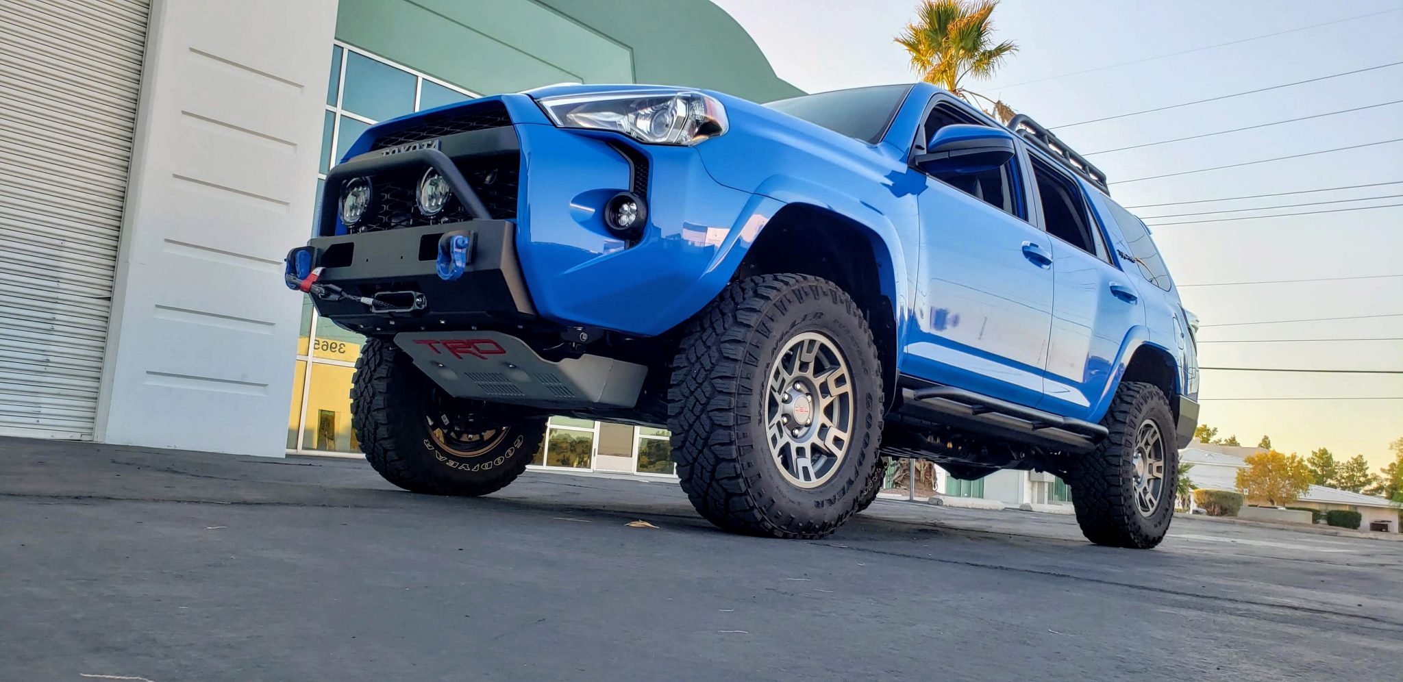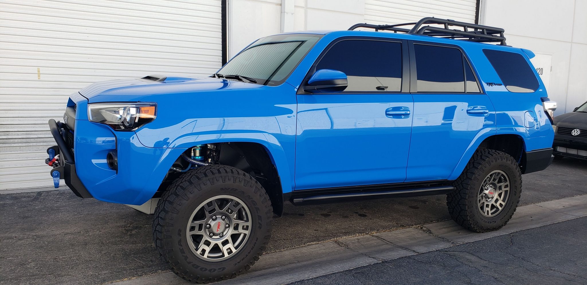 Replacement gray-finished 17″ TRD Pro wheels are fitted to the hubs with 1.5″ spacers and wear 285/70 Goodyear Wrangler Duratrac tires, and a matching spare is mounted to a swing-away rear carrier. A King coilover bypass suspension setup has been installed, which affords approximately 2.5″ of lift.