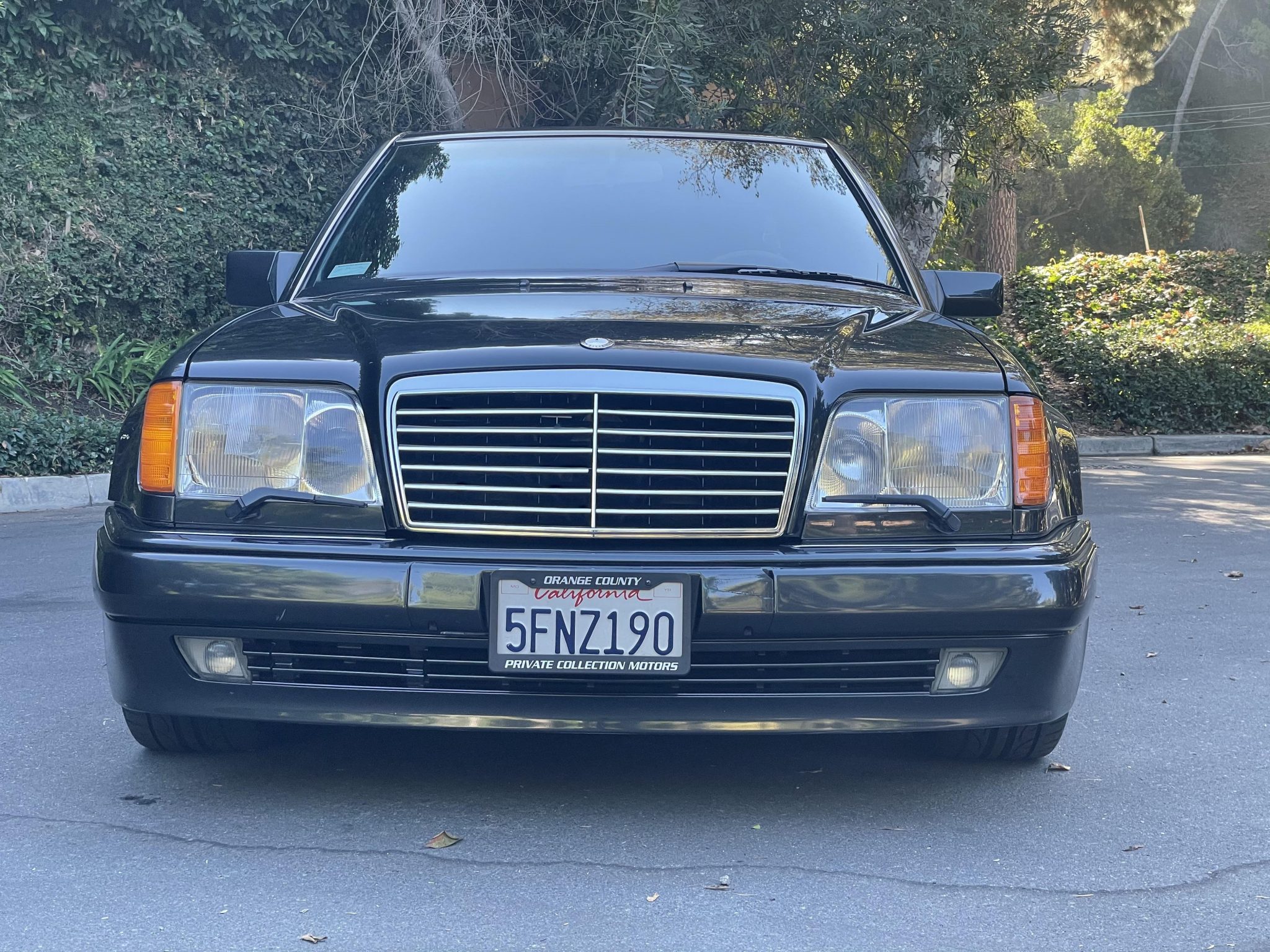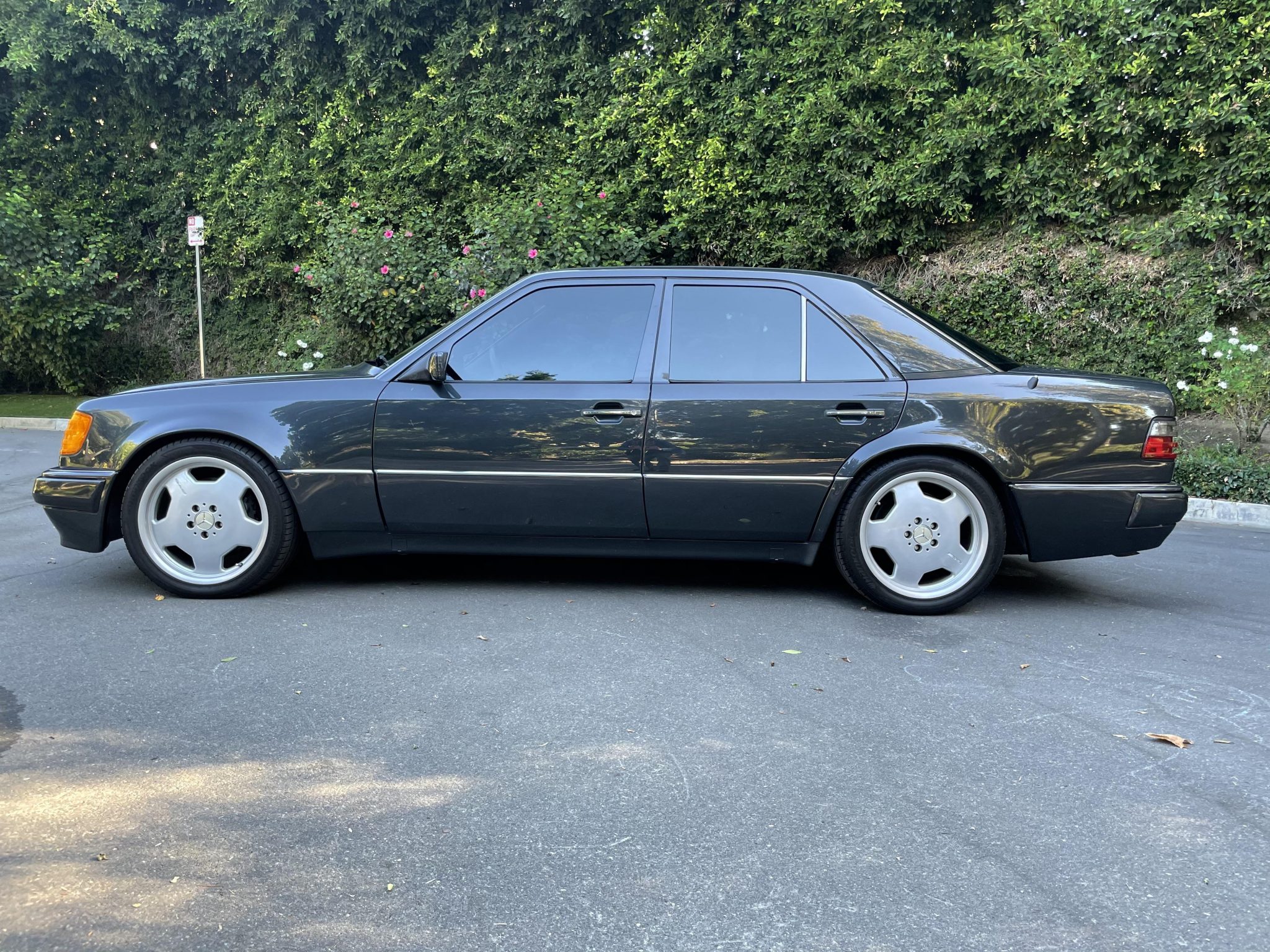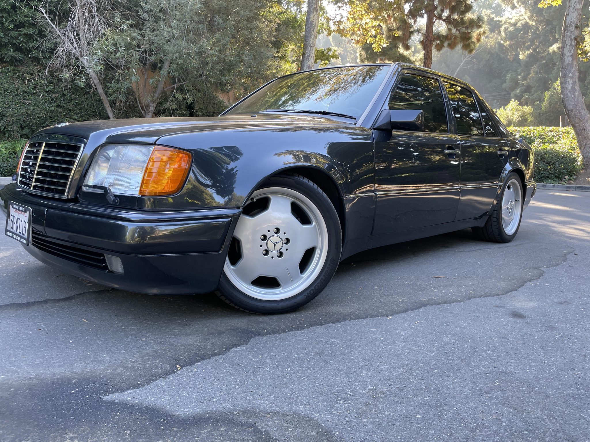 Staggered-width 18″ AMG monoblock wheels are mounted with Hankook Ventus V12 evo2 tires. The E500 was equipped from the factory with disc brakes that were sourced from the contemporary SL600 roadster. The car has been lowered with aftermarket springs, though the self-leveling suspension system has been retained.