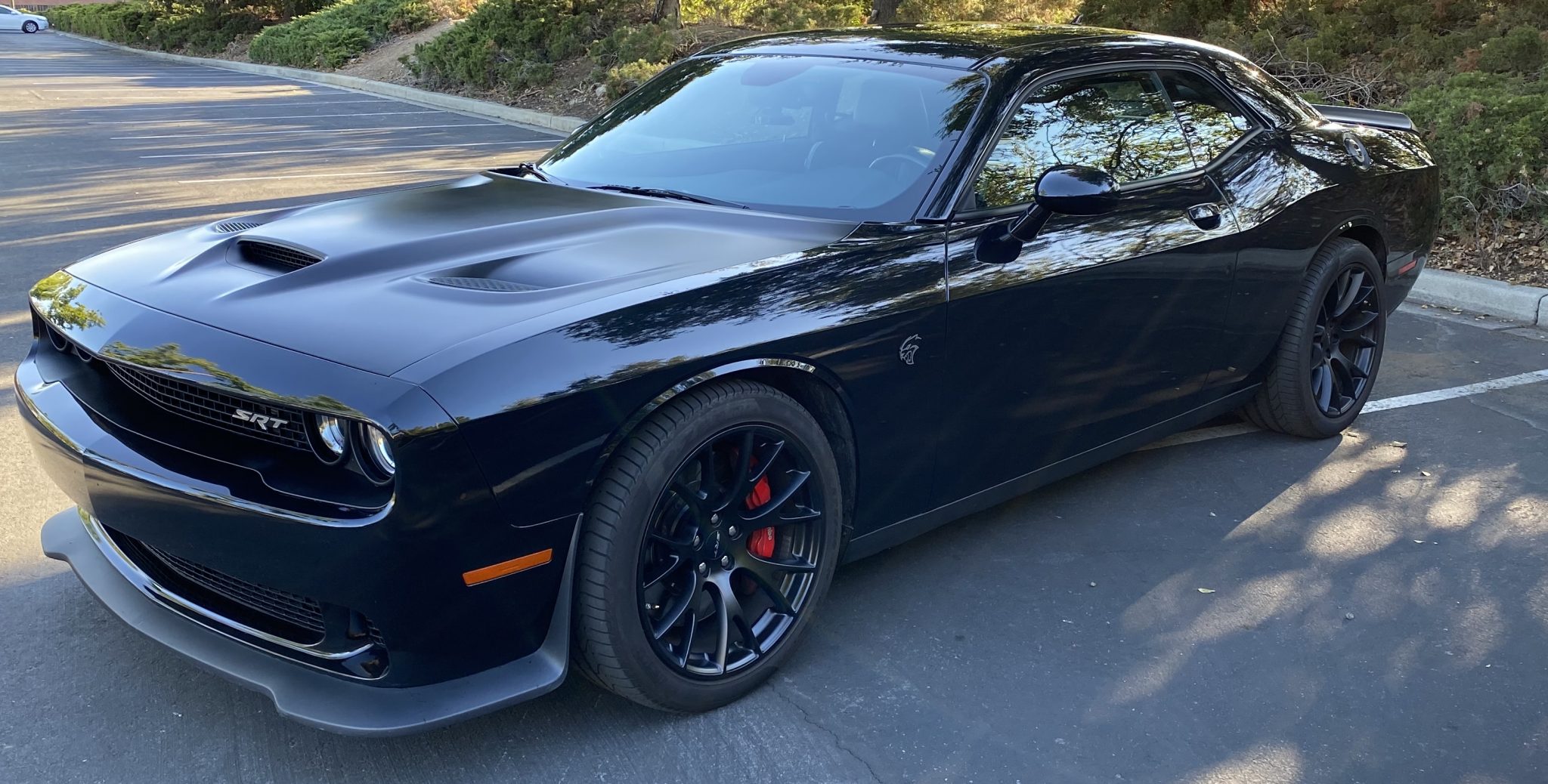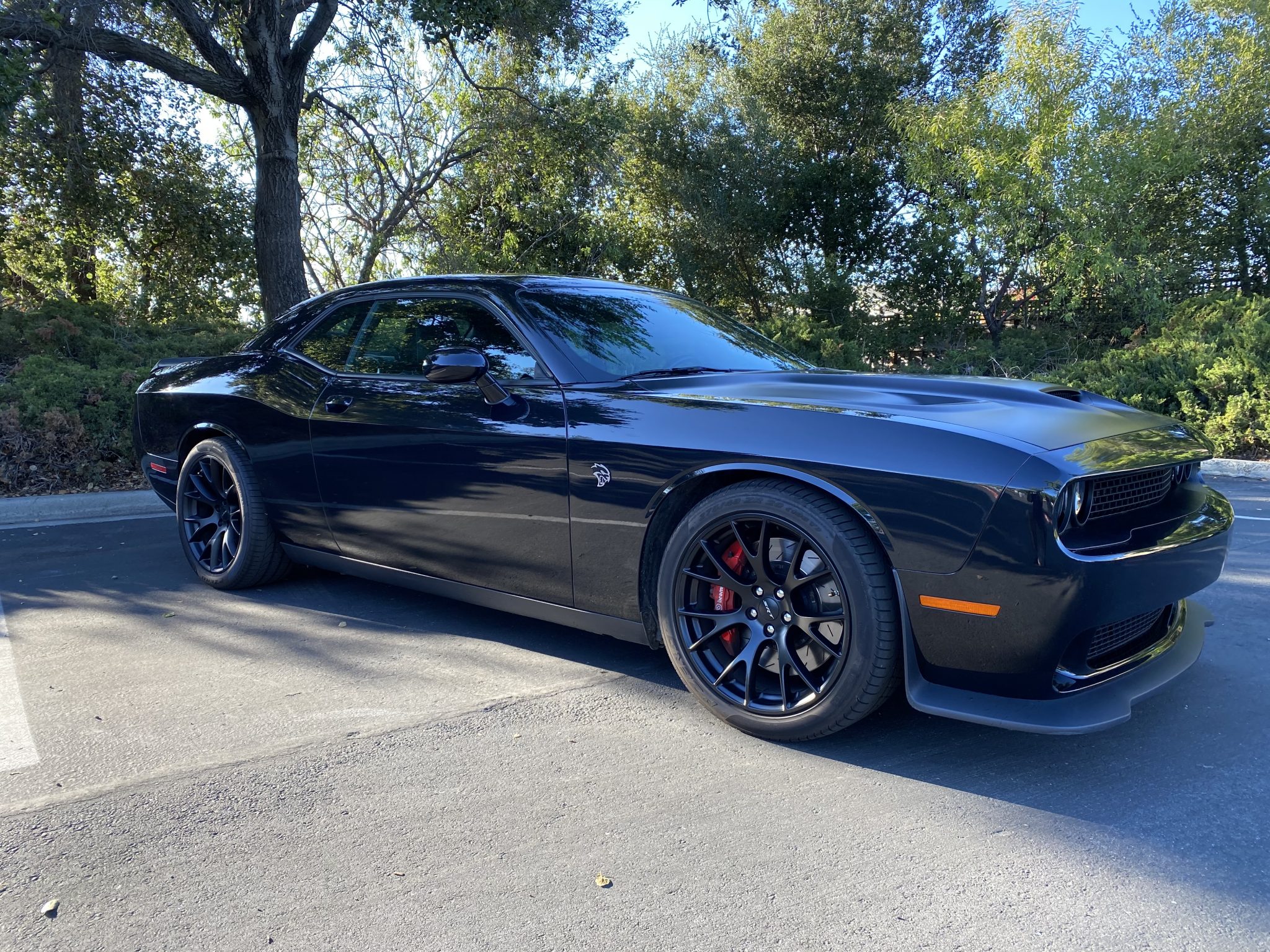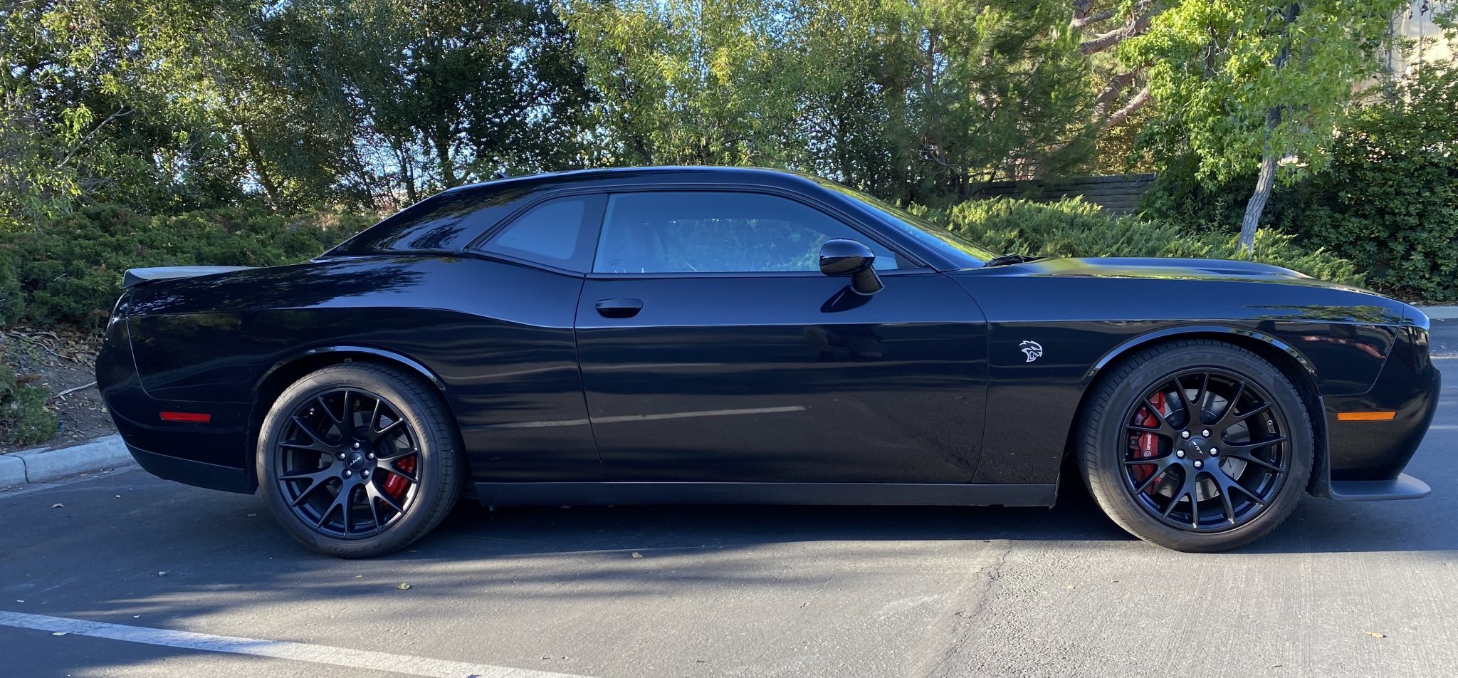 Aftermarket 20″ Y-spoke wheels wear SRT center caps and are fitted with Pirelli P Zero tires measuring 275/40 up front and 315/35 out back. Red-painted Brembo brake calipers are fitted over slotted rotors at each corner. Curb rash is present on one of the installed wheels, and the factory 20″ matte black forged wheels accompany the car.