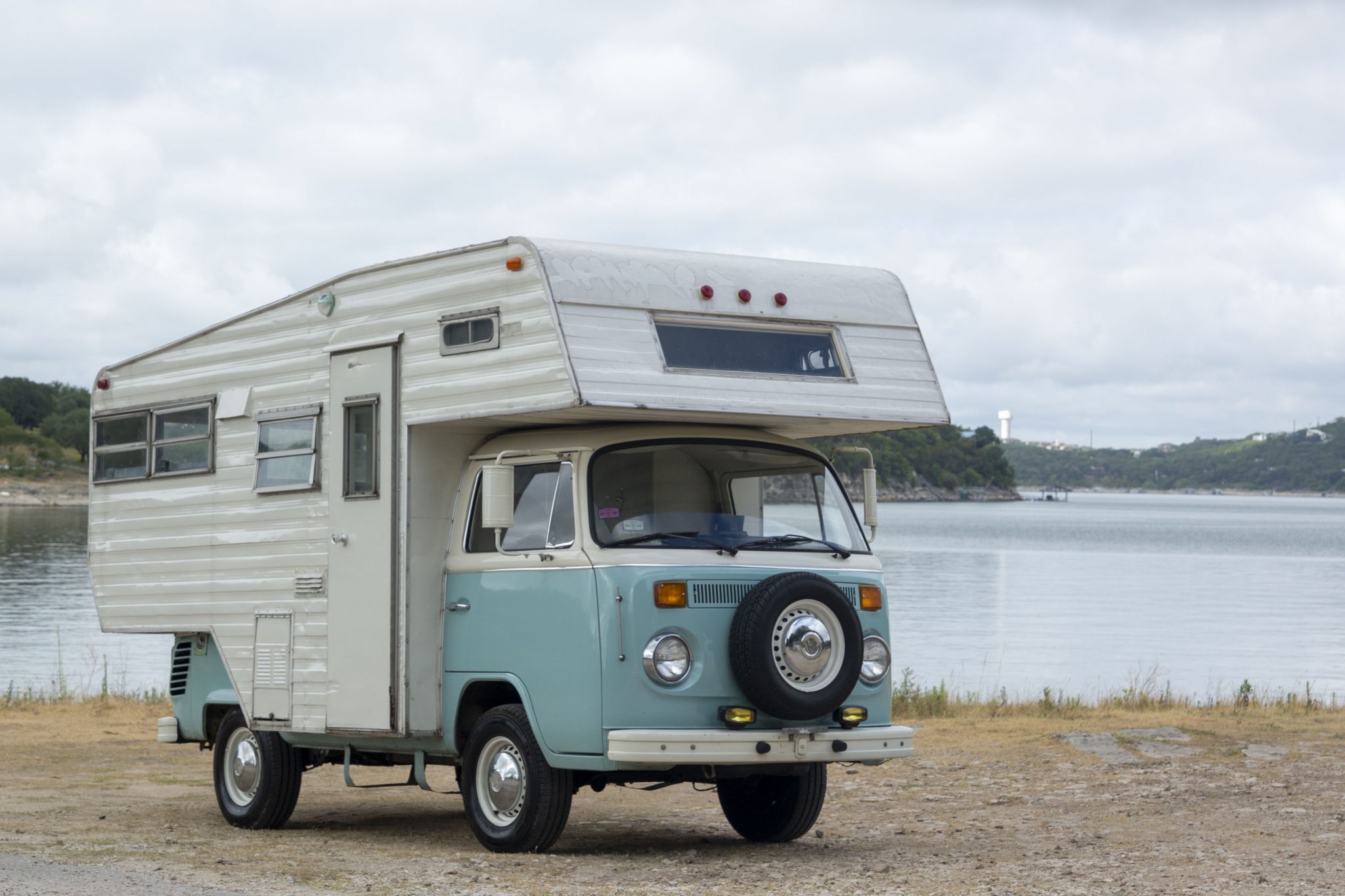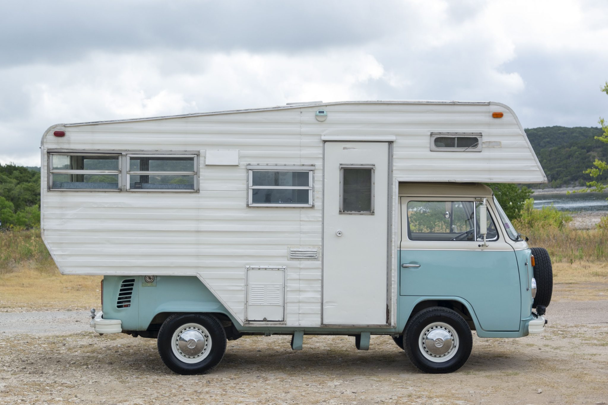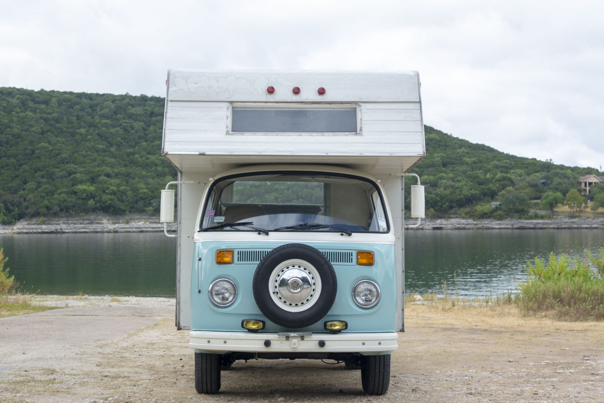 White-painted 14″ steel wheels with chrome VW hubcaps are wrapped in 195/70 Michelin Agilis tires; a full-size spare wheel mounted to the front of the van is fitted with a Panther radial tire. The suspension and brakes were reportedly serviced prior to the ~900-mile journey from Mexico to the United States.
