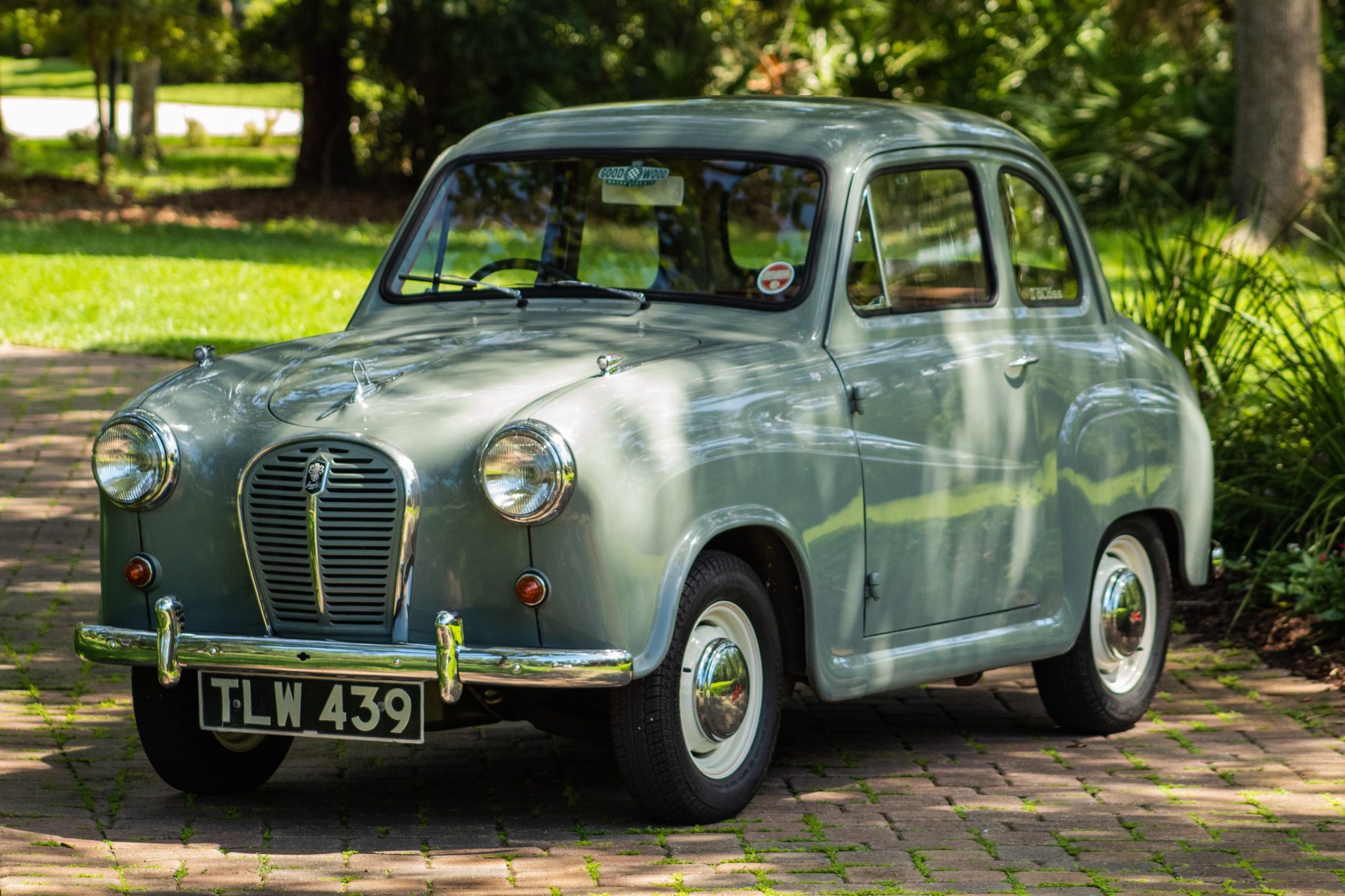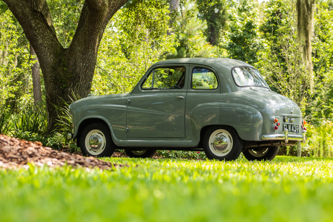 White-painted 13″ steel wheels with red pinstriping and chrome Austin hubcaps are wrapped in 155/80 Continental ContiEcoContact EP tires. Factory drum brakes are fitted at all four corners.