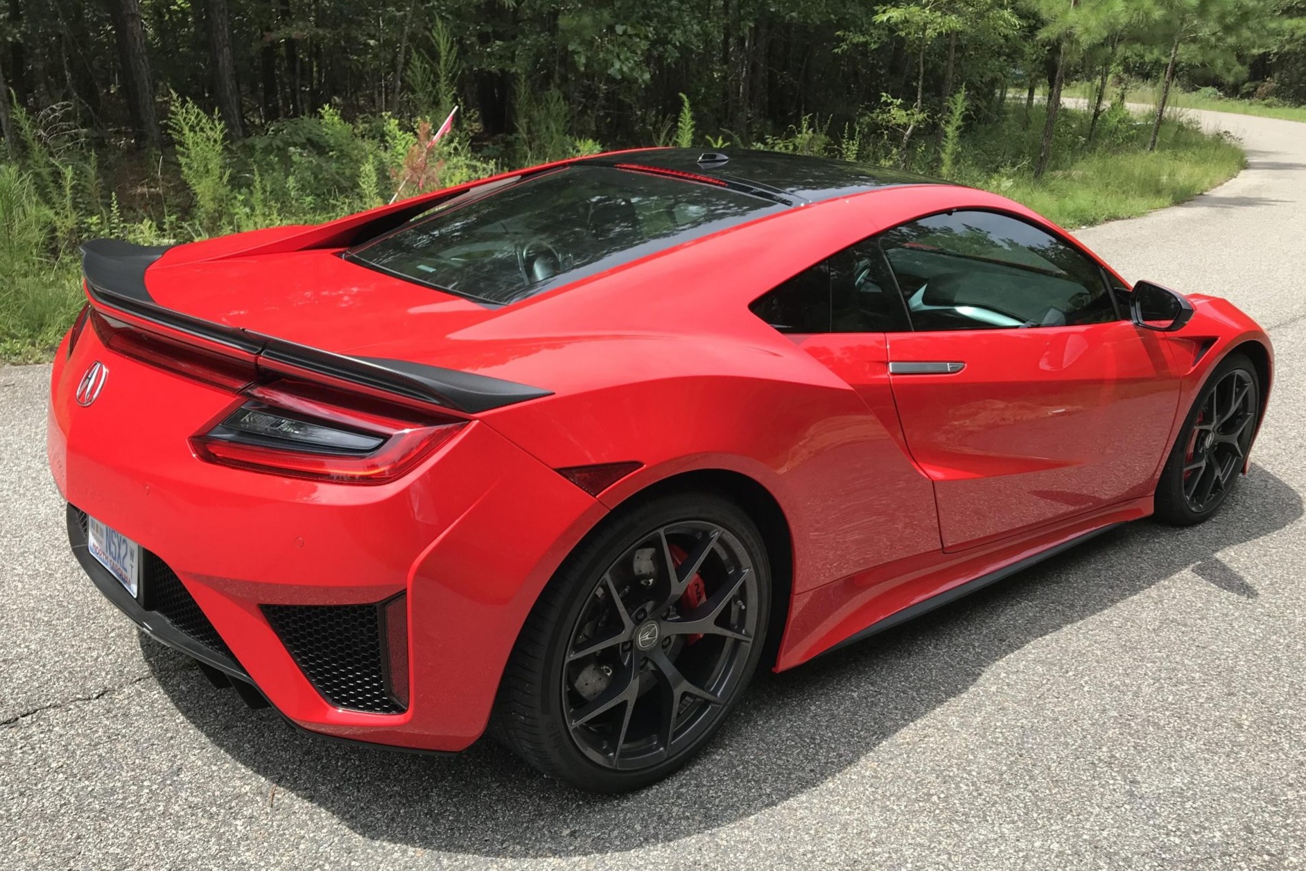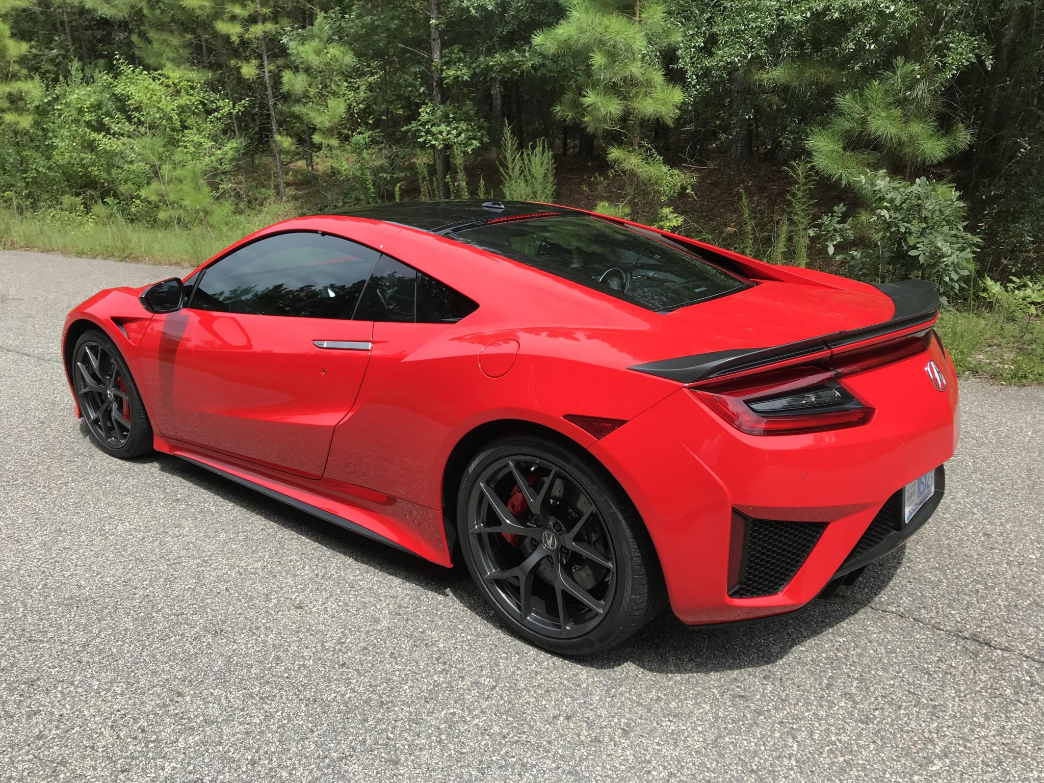 Factory 19″ front and 20″ rear Y-spoke wheels are mounted with Continental ContiSportContact tires. The second-generation NSX utilizes double-wishbone front and multi-link rear suspension with magnetorheological dampers at each corner. The car was optioned with a carbon-ceramic brake system and red-finished calipers.