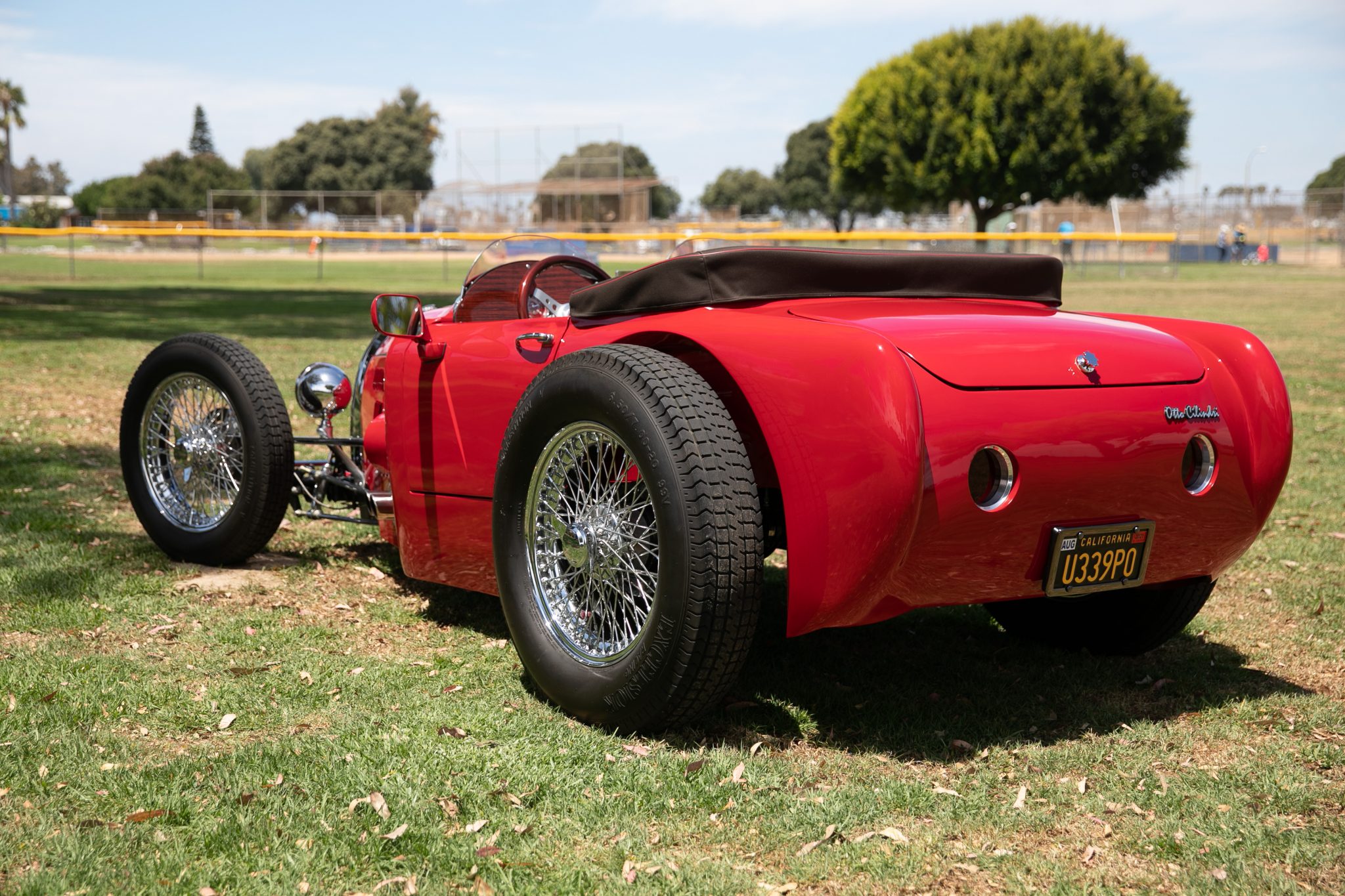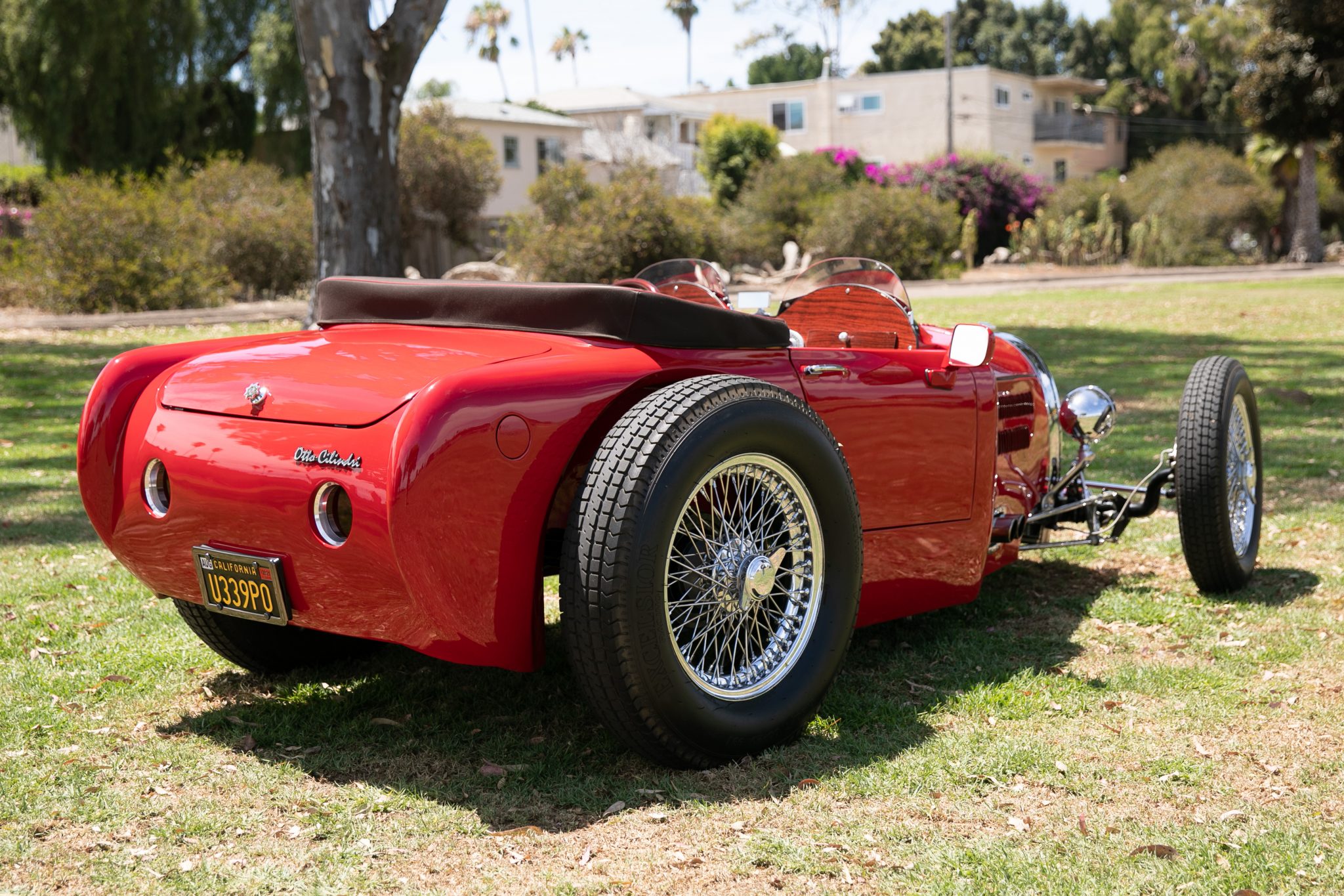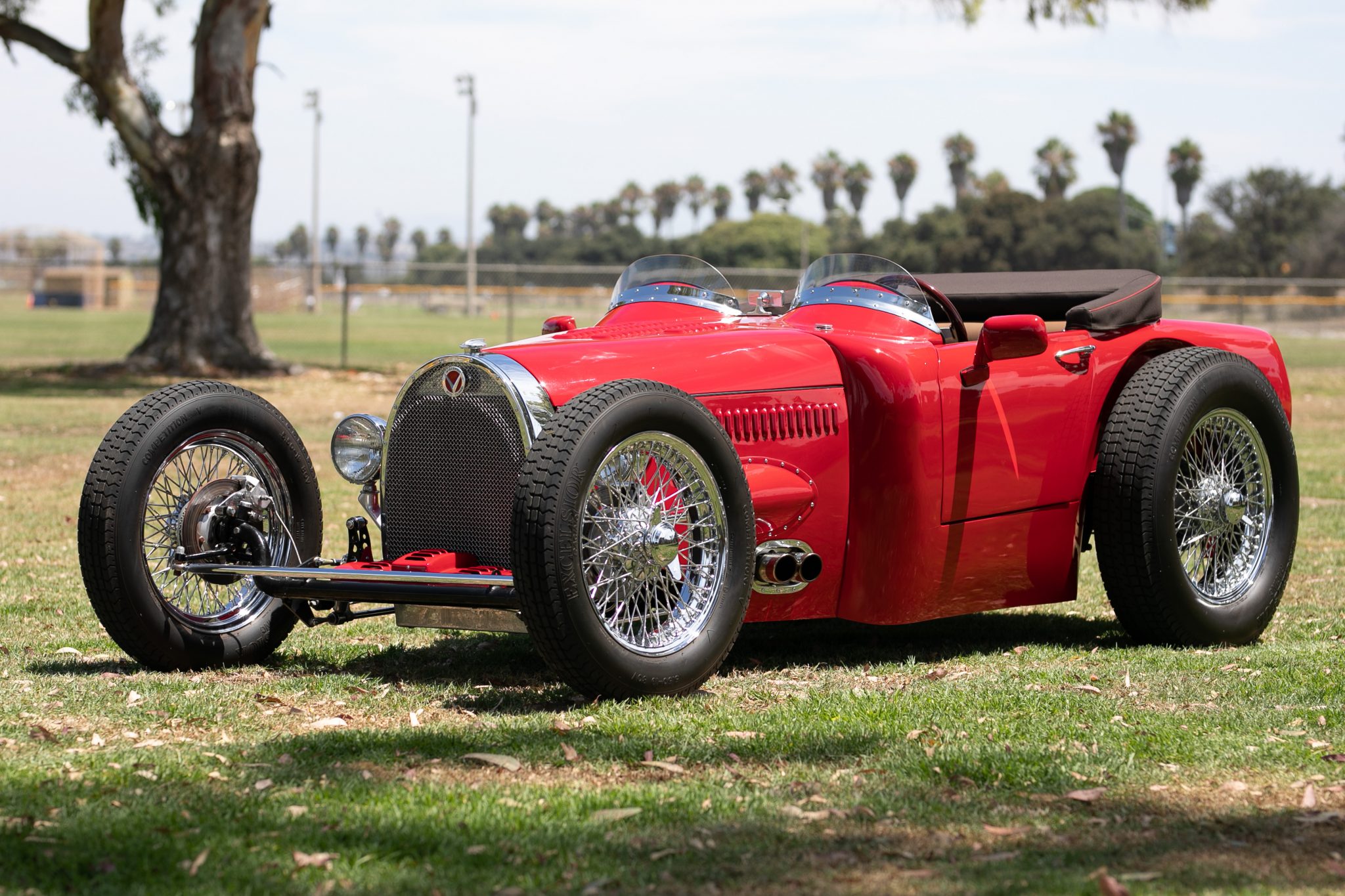 Chrome-finished wire knock-off wheels measuring 19″ up front and 20″ at the rear are wrapped in Excelsior Racing Competition tires measuring 5.5″ and 6.5″ wide, respectively. Disc brakes are fitted in front, with drum brakes at the rear.