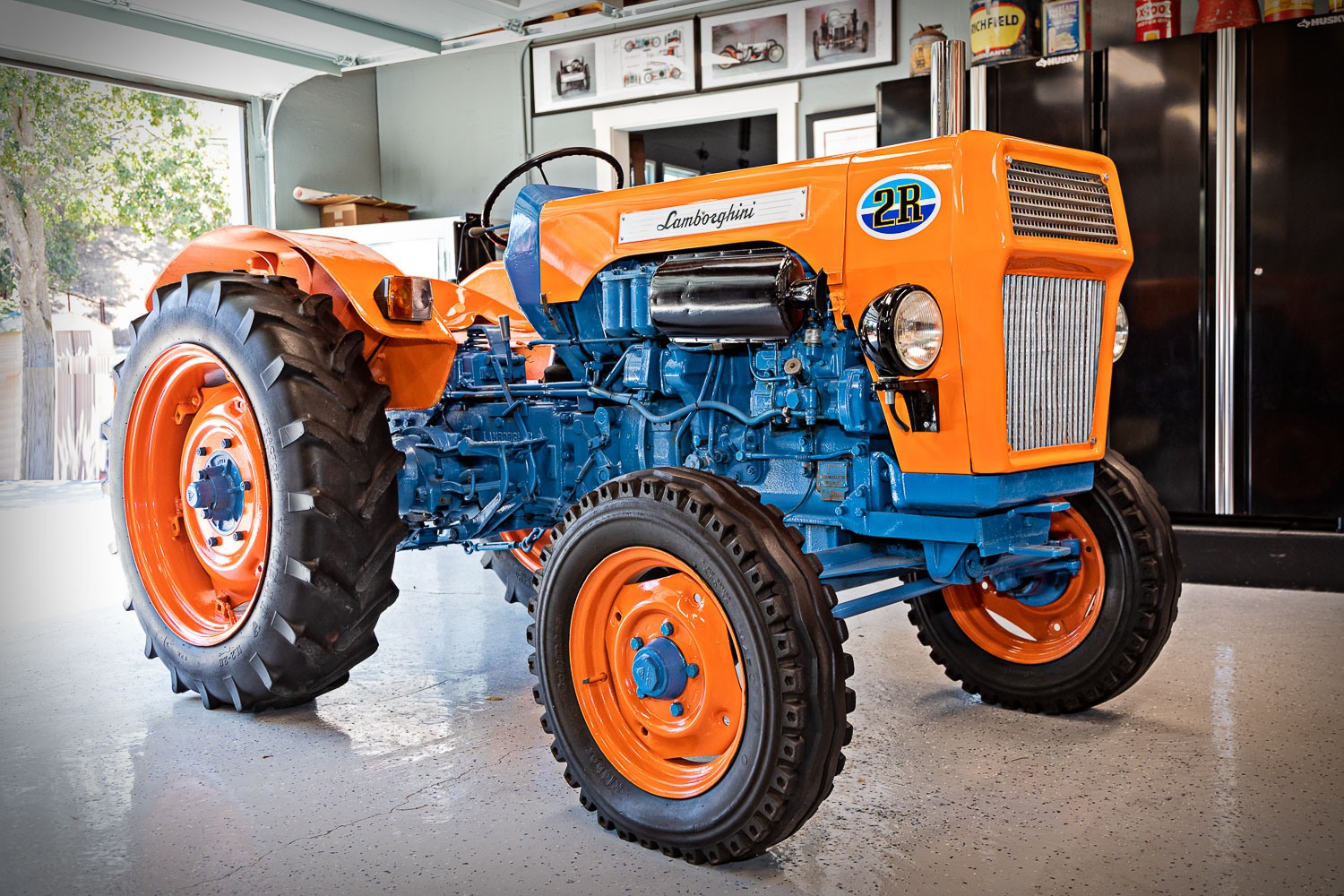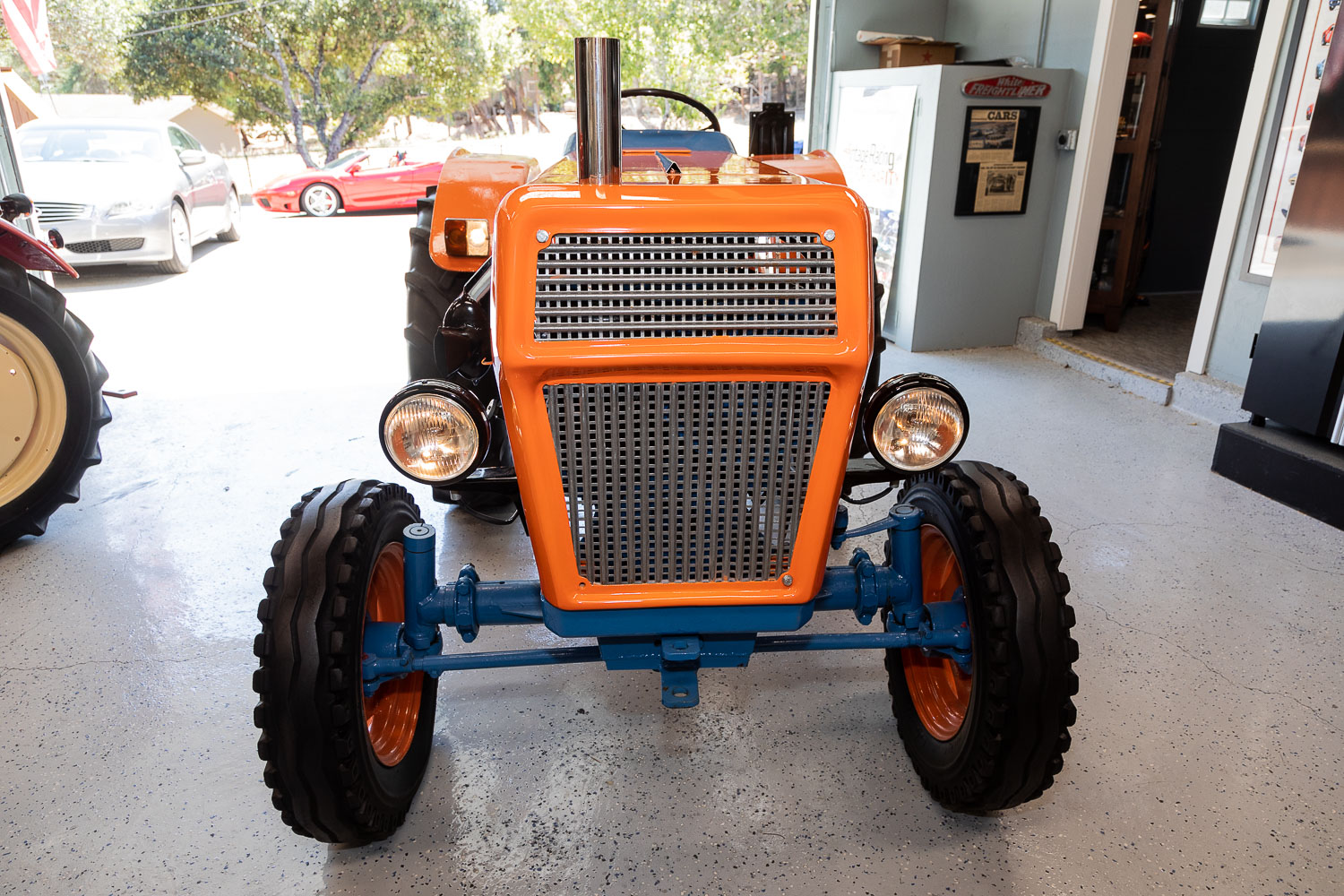 The wheels measure 16″ and 28″ in diameter, and all four wear older tractor tires. The hubs and lug nuts have been painted blue to match the other mechanical components.