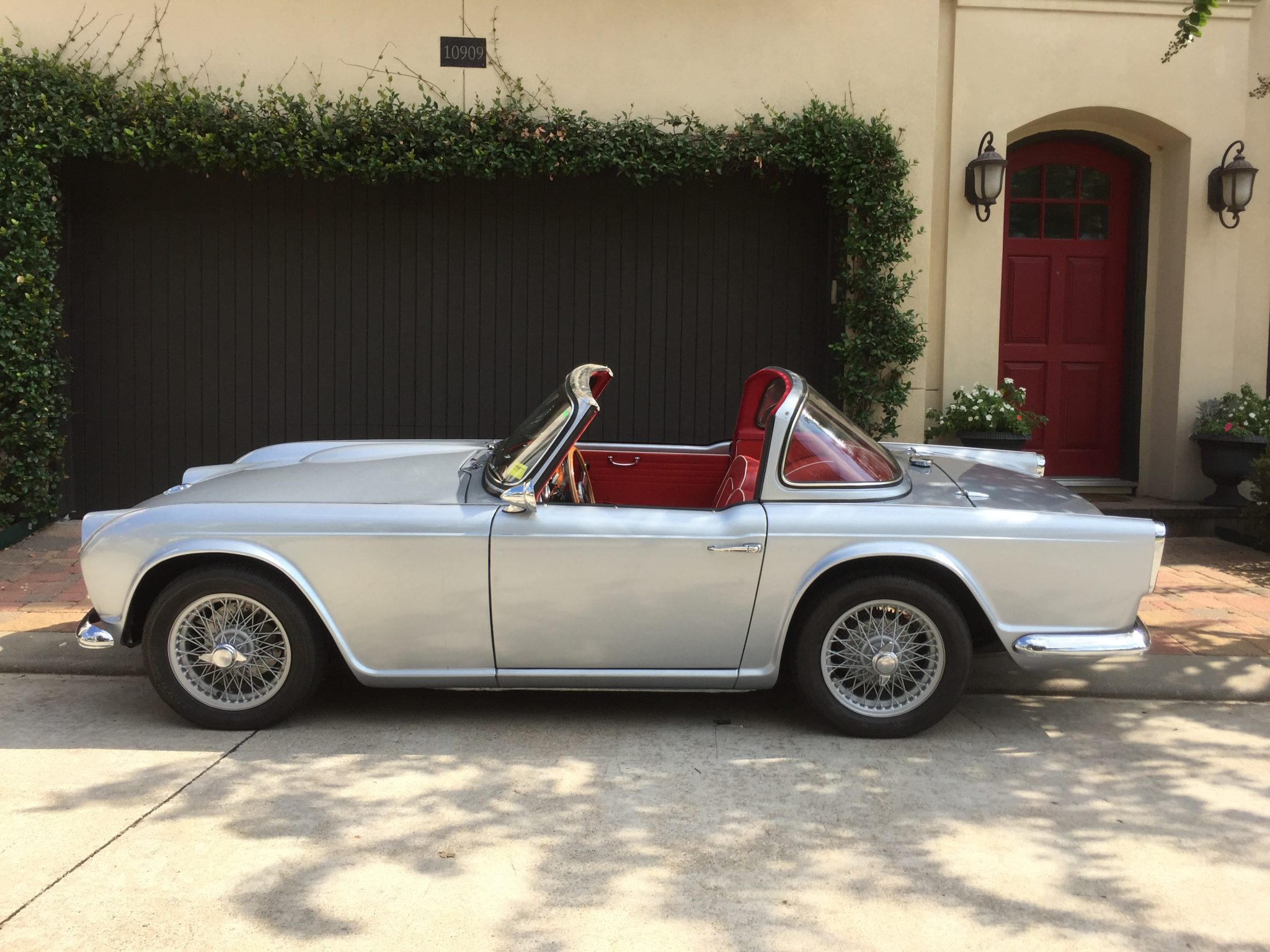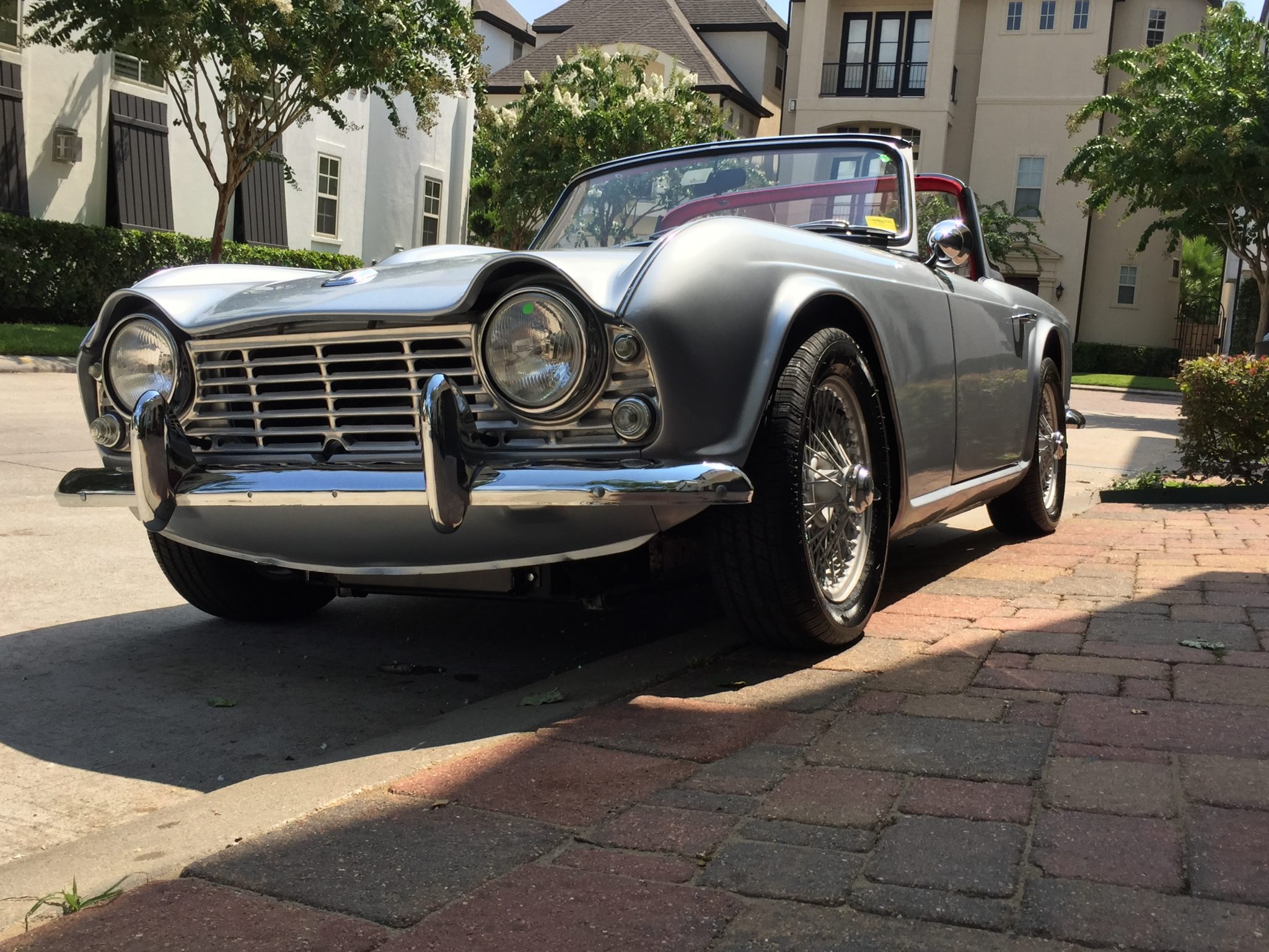 Silver-painted 60-spoke wire wheels with two-eared chrome knock-off hubs are wrapped in 195/60 Epic Tour LL821 tires. The rack-and-pinion steering has been refurbished with a quick-ratio rack and replacement bushings, and adjustable front shock absorbers and replacement springs have been installed. The lever-arm rear shocks have been refurbished, and Alfin rear brake drums have been installed. Slotted and drilled disc brakes are fitted up front.