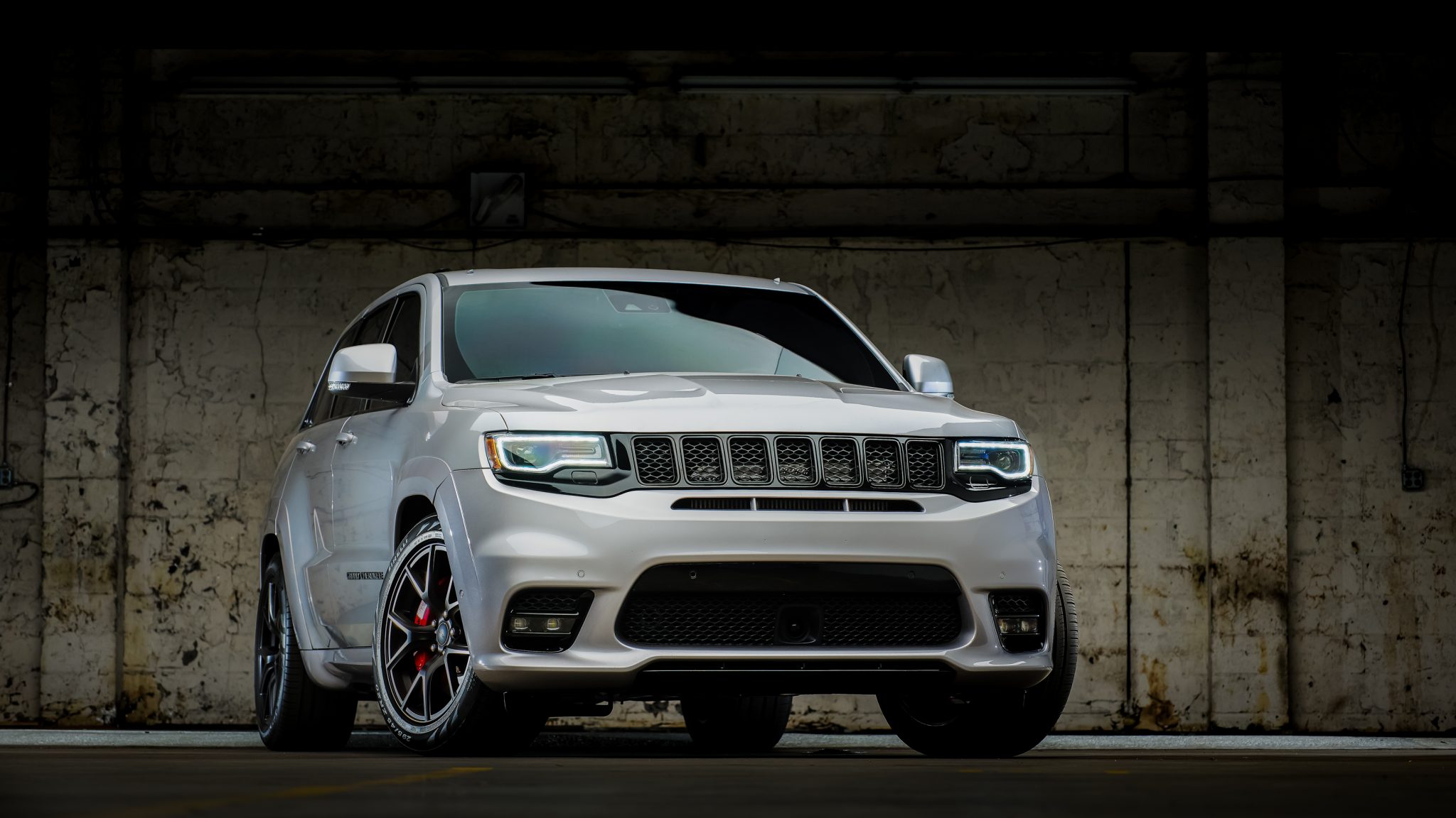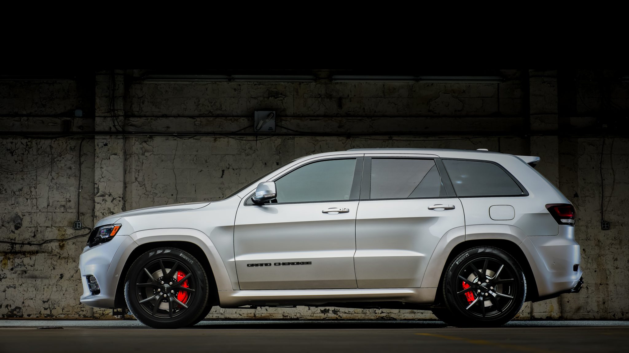 Black-finished 20″ wheels feature SRT center caps and wear 295/45 Pirelli Scorpion Verde tires. The suspension is modified with lowering springs, and braking is from red-finished Brembo calipers and vented discs at all four corners.