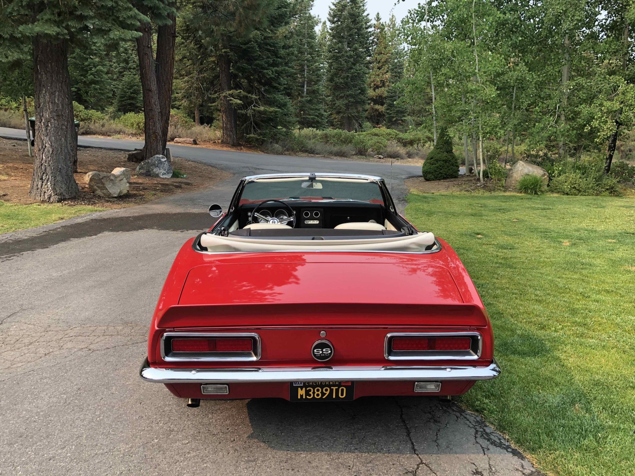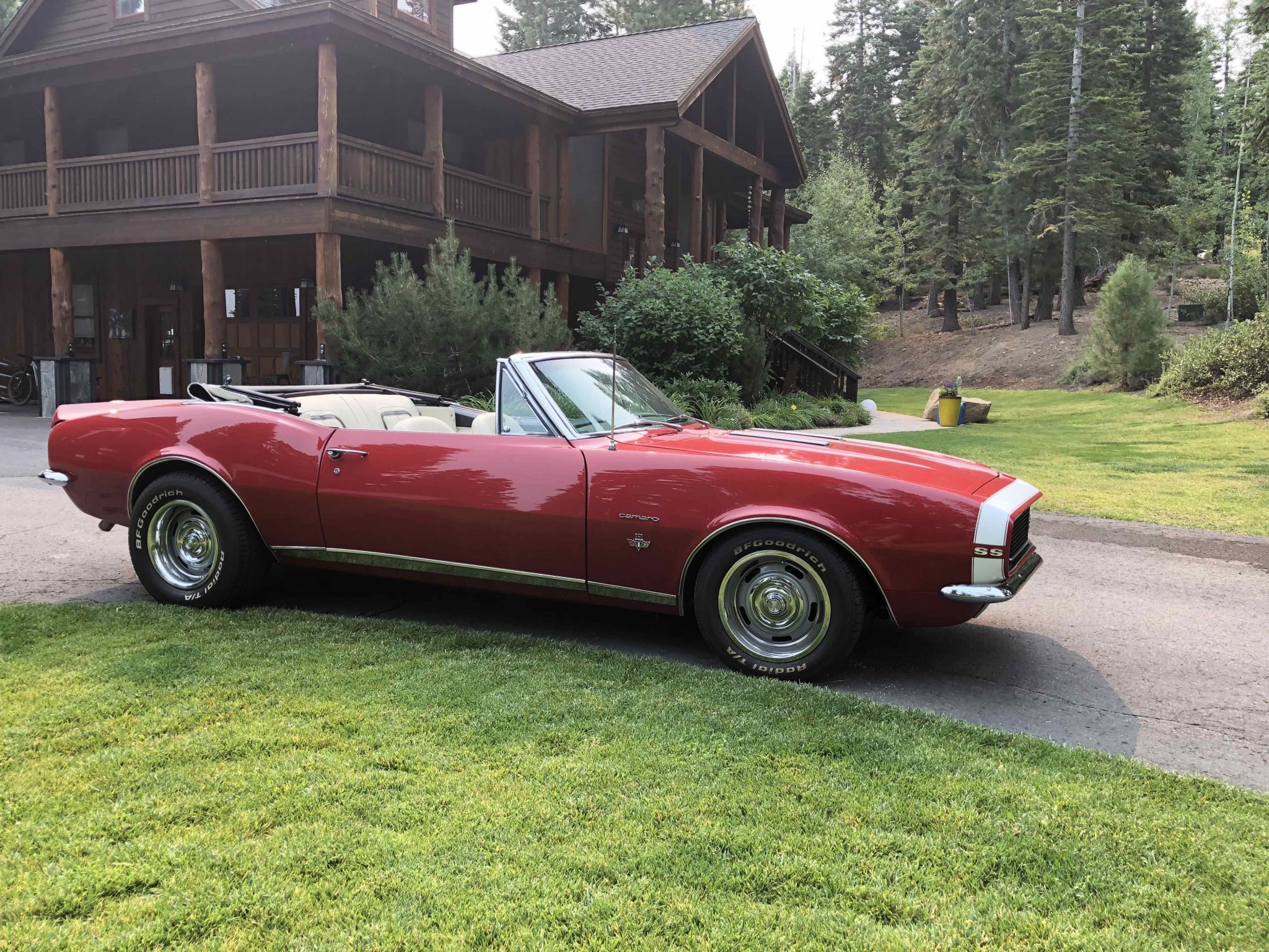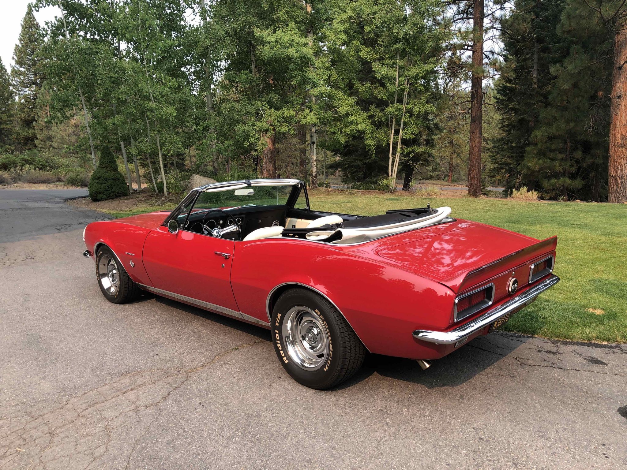 Rallye-style 15″ wheels wear chrome trim rings and hub covers and are wrapped in BFGoodrich Radial T/A tires measuring 215/60 front and 255/60 rear. The ride height has been lowered using a Hotchkis suspension kit and is complemented by chassis-stiffening components. The power-operated Parchment soft top is shown raised and lowered in the gallery.