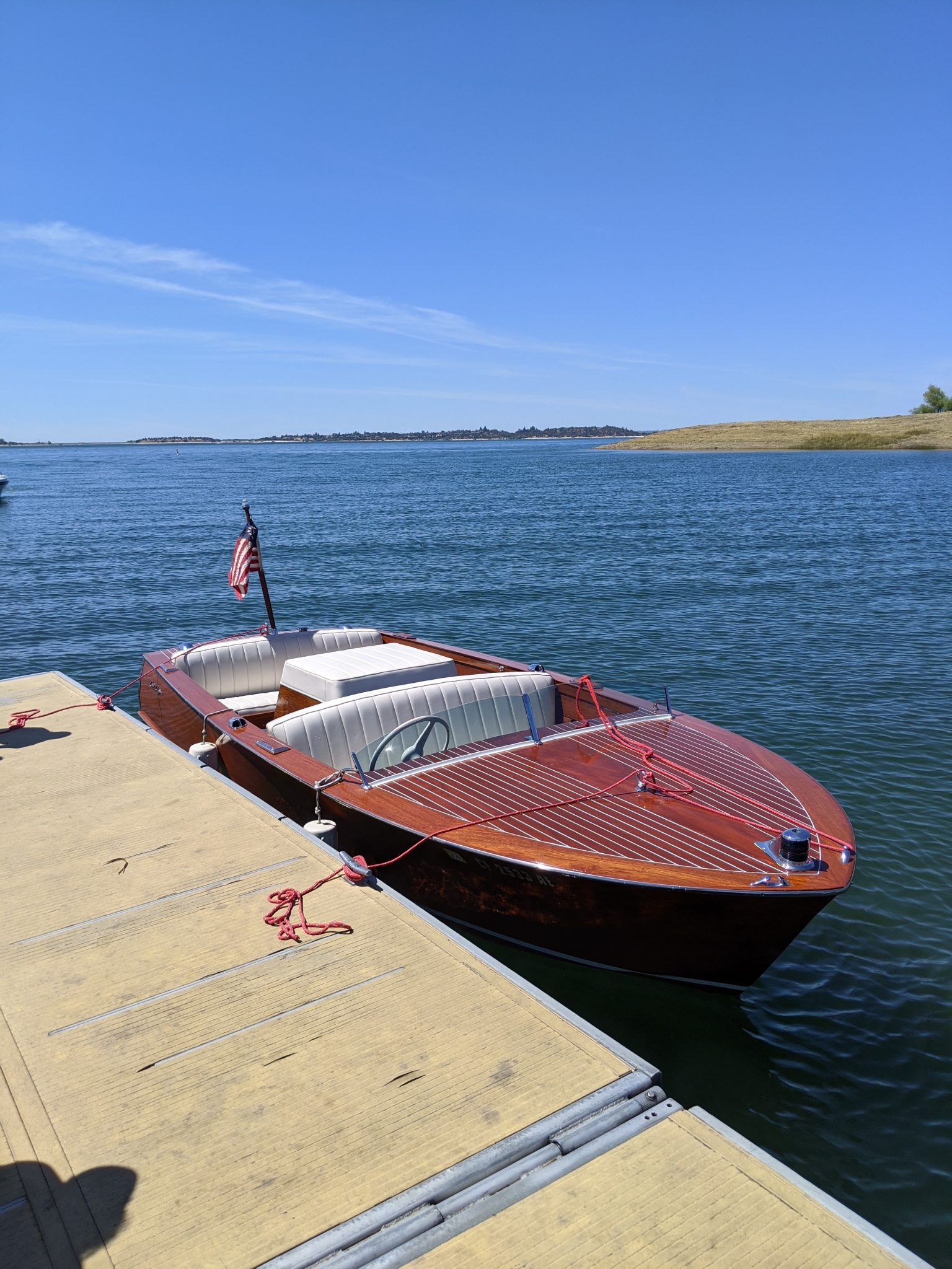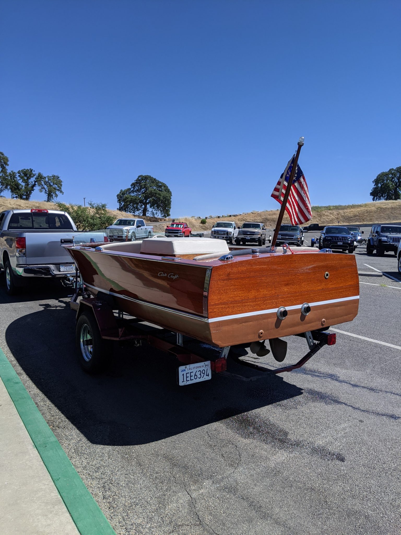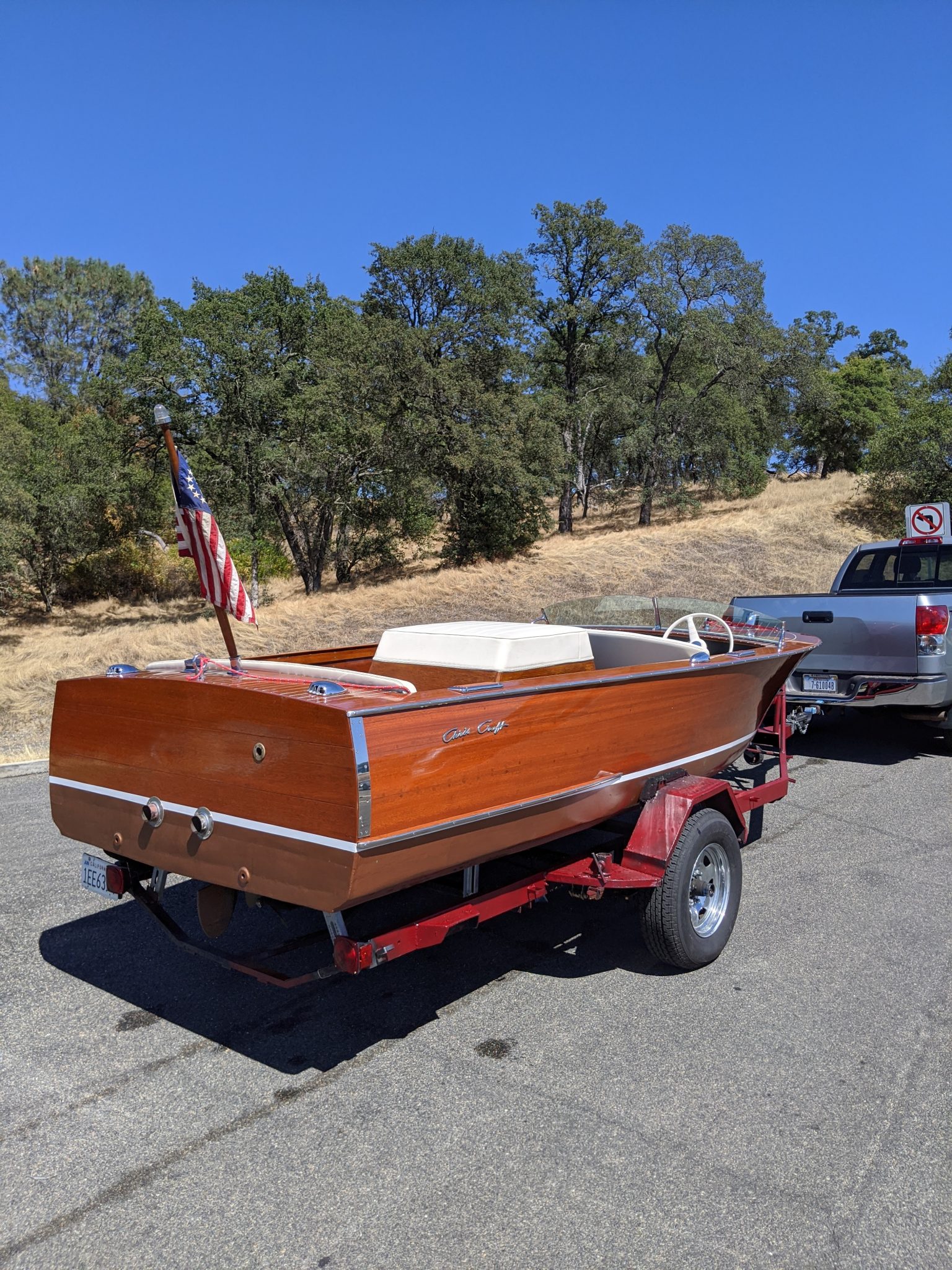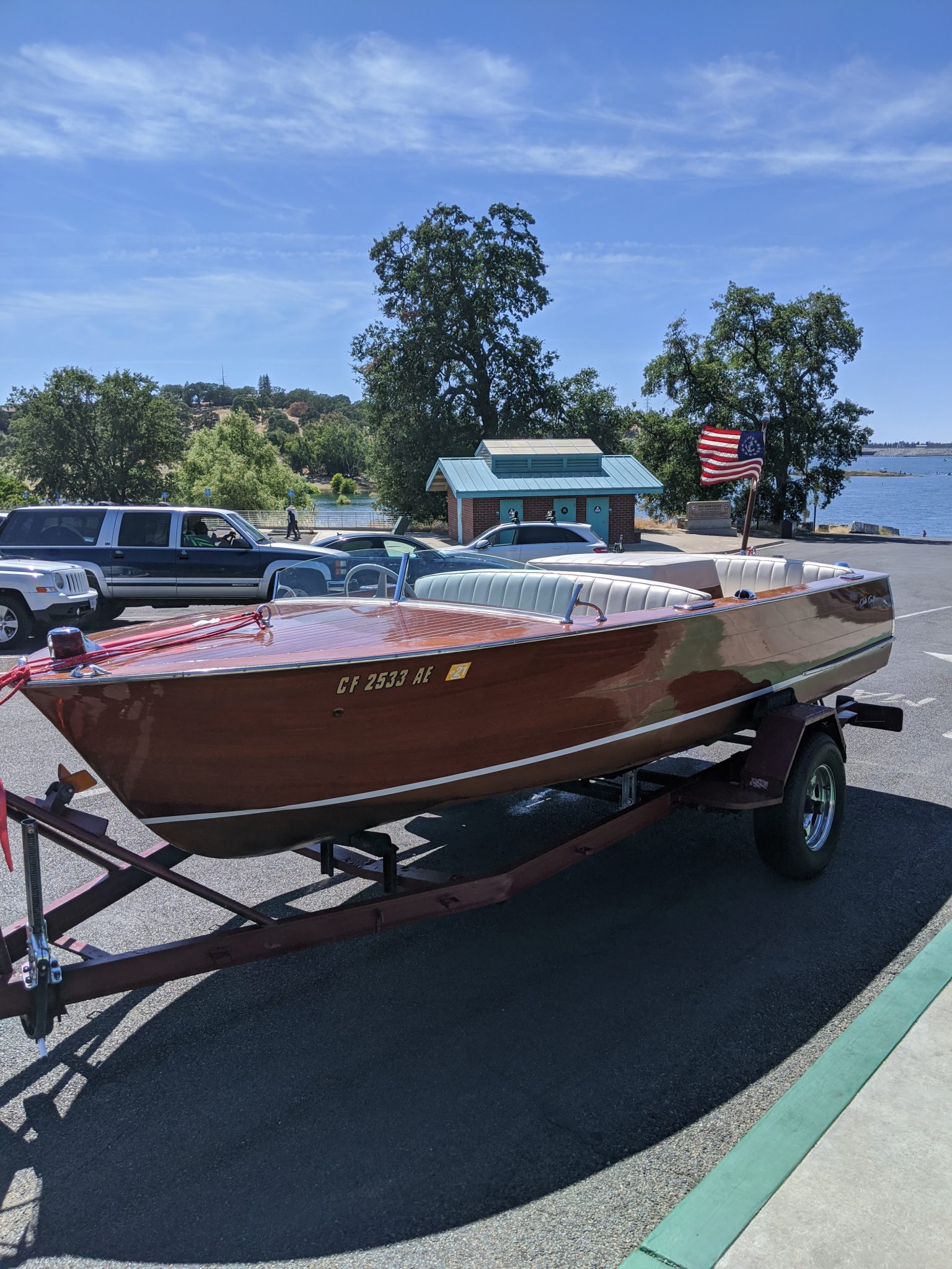 Details include a backdated bow light, a racing-style two-piece windscreen, bright rub rails, and dual exhaust exits at the waterline. The boat rests on a single-axle trailer featuring a manual winch as well as rollers and carpeted bunks. The seller states that the wheel bearings were repacked and new tires fitted in 2020.
