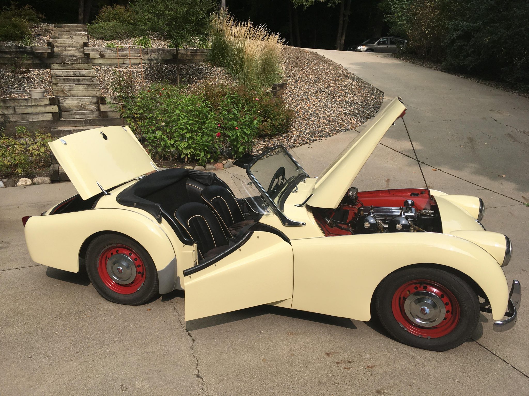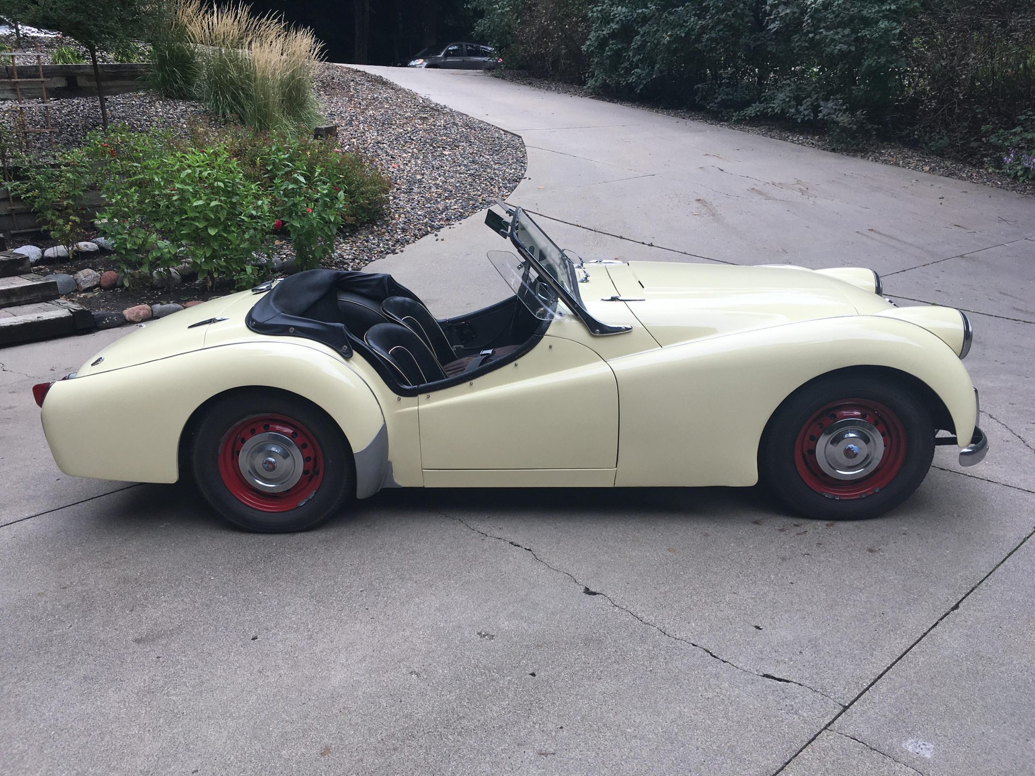 Red-painted 15″ steel wheels with chrome Triumph hubcaps are fitted with 165-series Atlas Seasonaire tires. One of the wheels is reportedly out of round, and the seller reports that the car shakes at speeds above 50 mph. Front disc and rear drum brakes are part of a system that was converted to DOT 5 fluid during previous ownership.