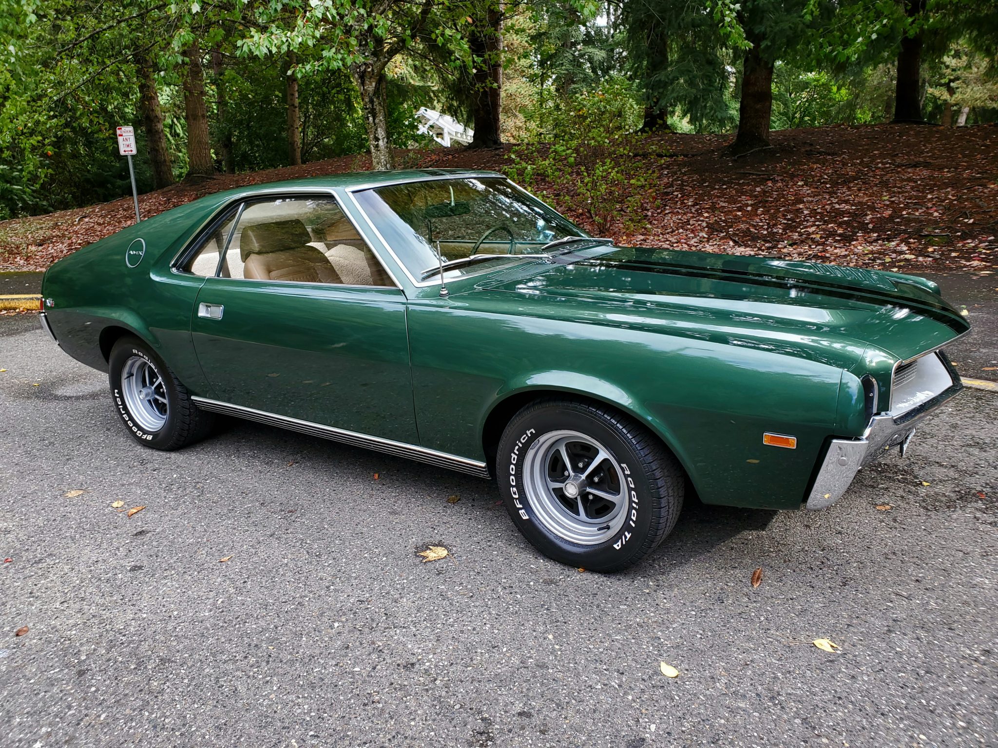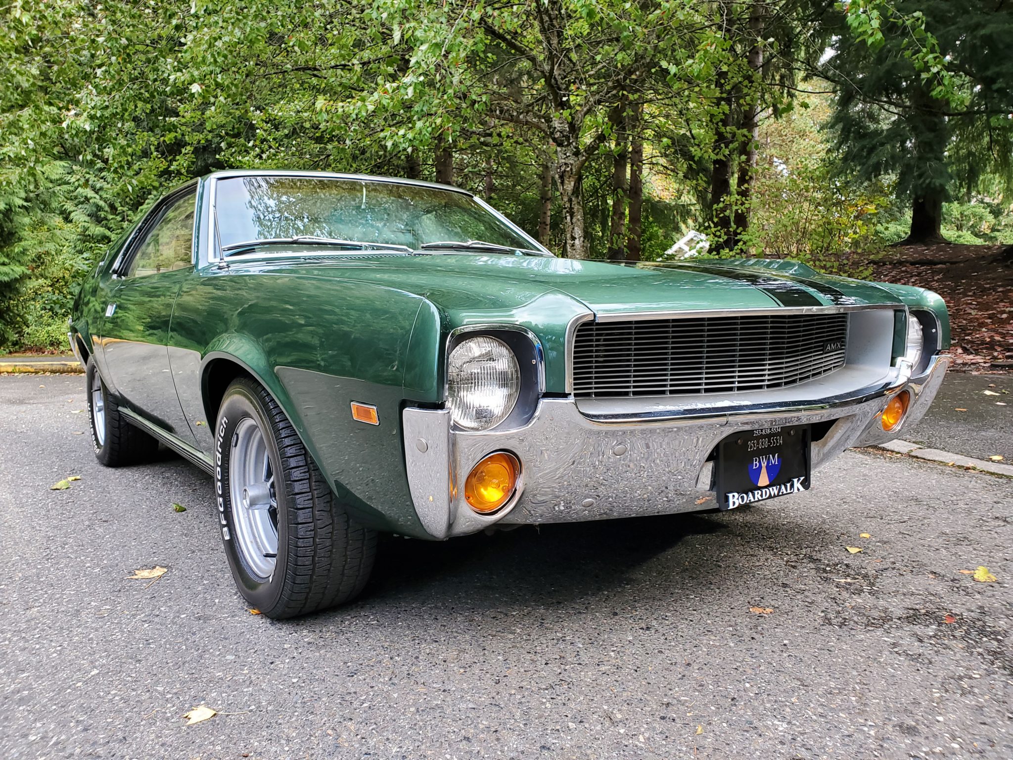 Magnum 500–style 15″ wheels are mounted with BFGoodrich white-letter tires. Power-assisted brakes are equipped with discs in front and drums at the rear.