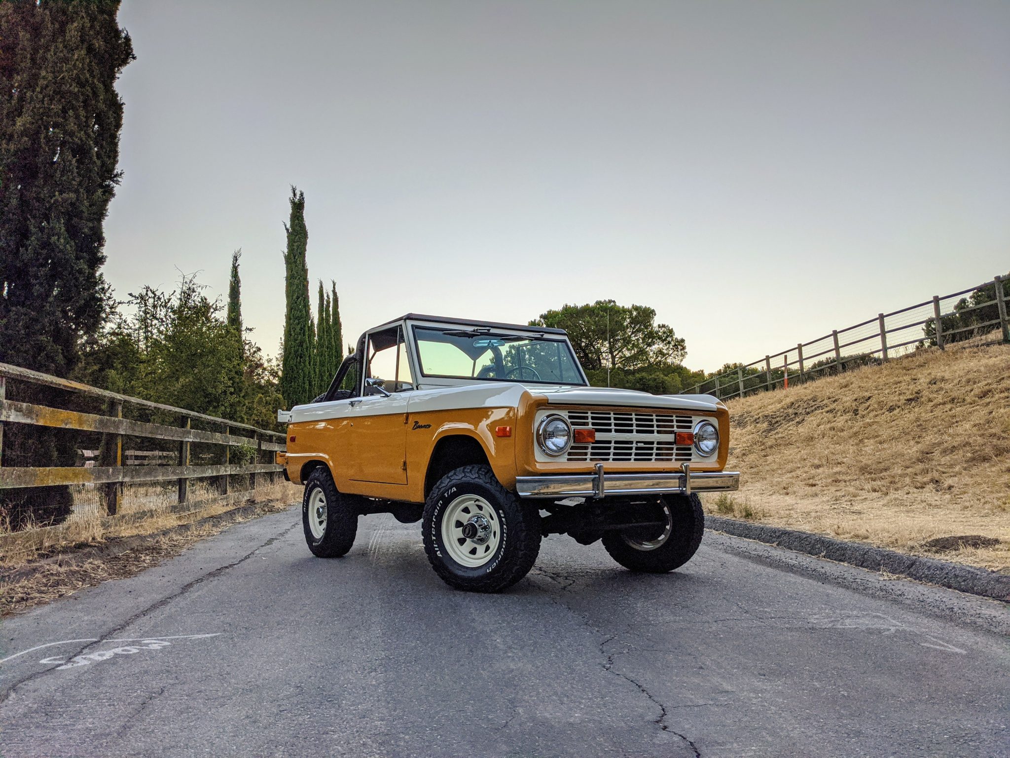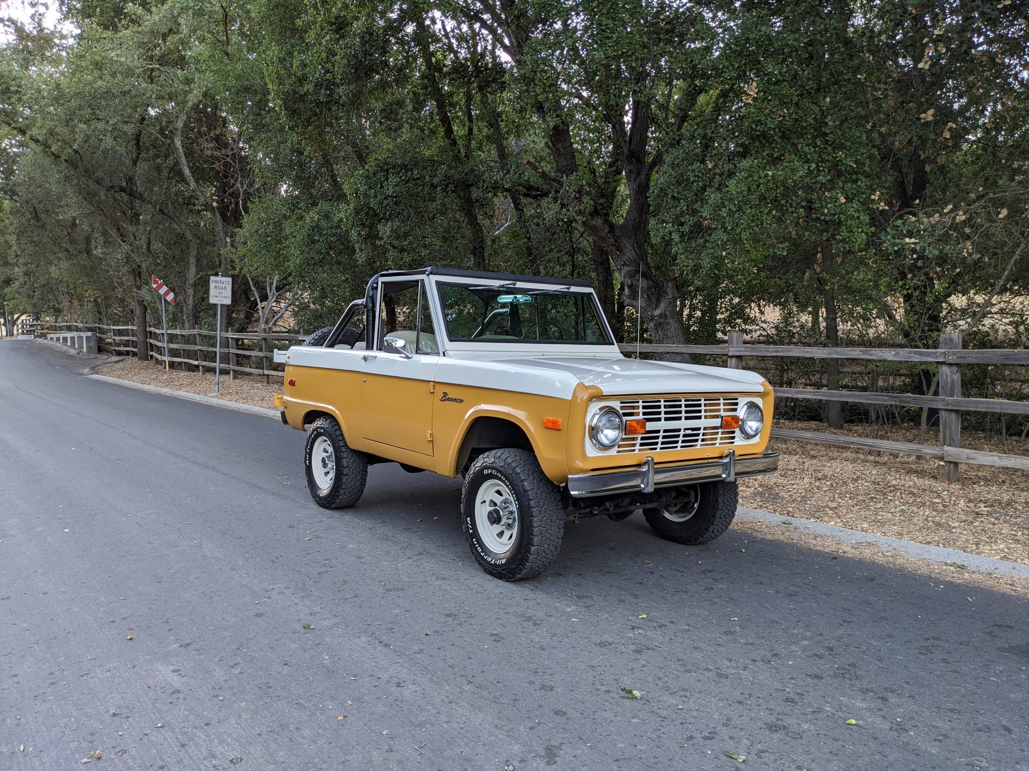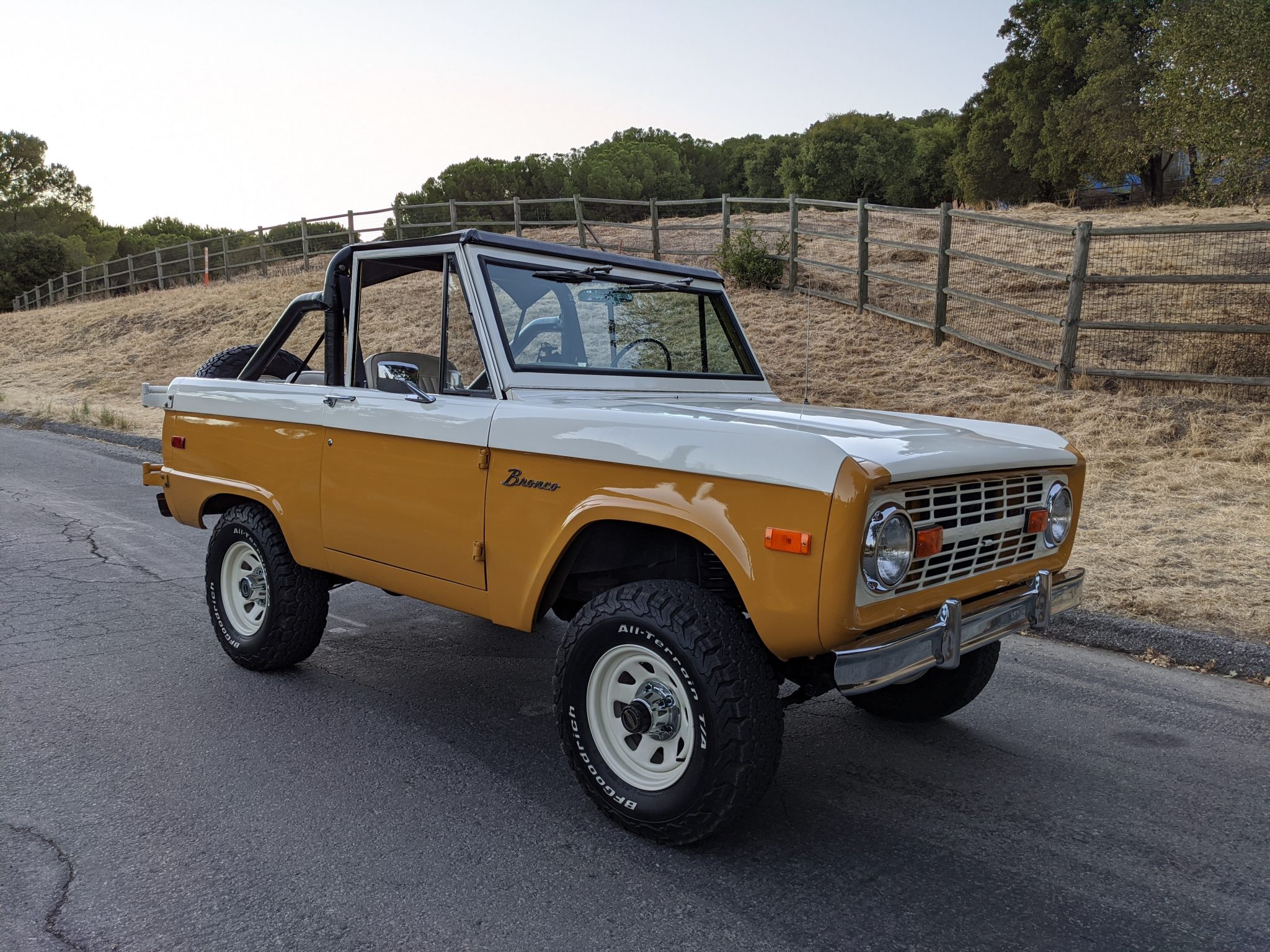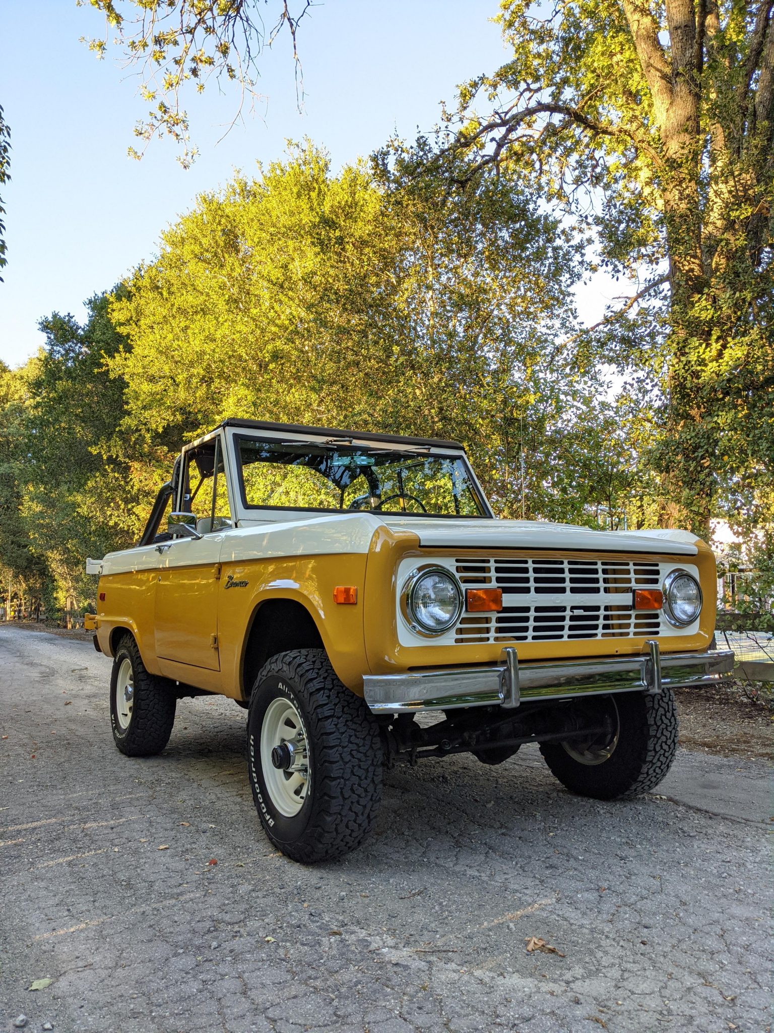 White 15″ wagon wheels and BFGoodrich All-Terrain T/A KO2 tires are said to have been installed within the last two years, and are mounted over manually-locking hubs up front. A steel wheel with a matching tire is mounted to a swing-out carrier at the rear. Braking is from unassisted front discs and rear drums. The truck rides on a 2″ Wild Horses coil spring lift and Bilstein shocks.