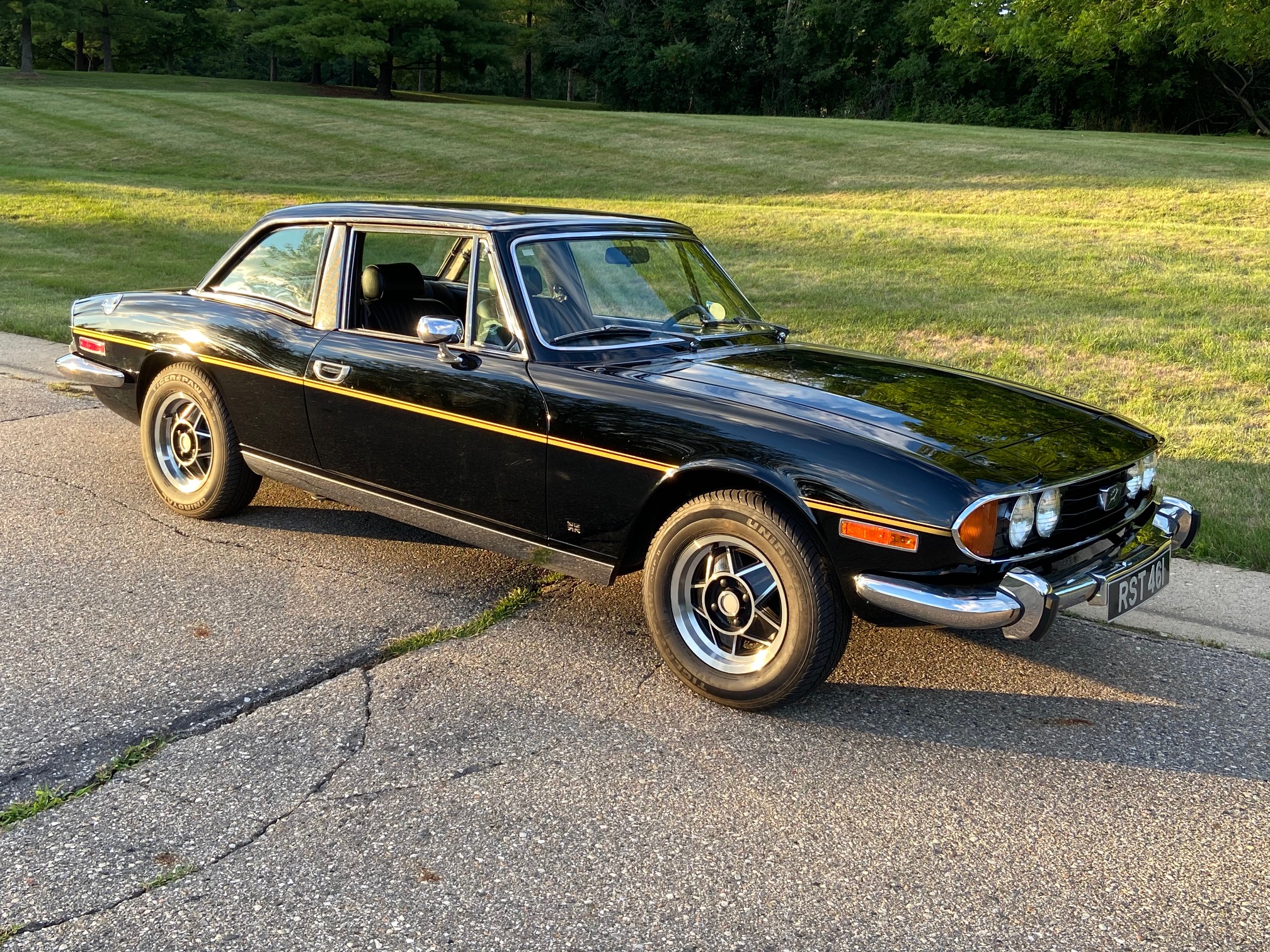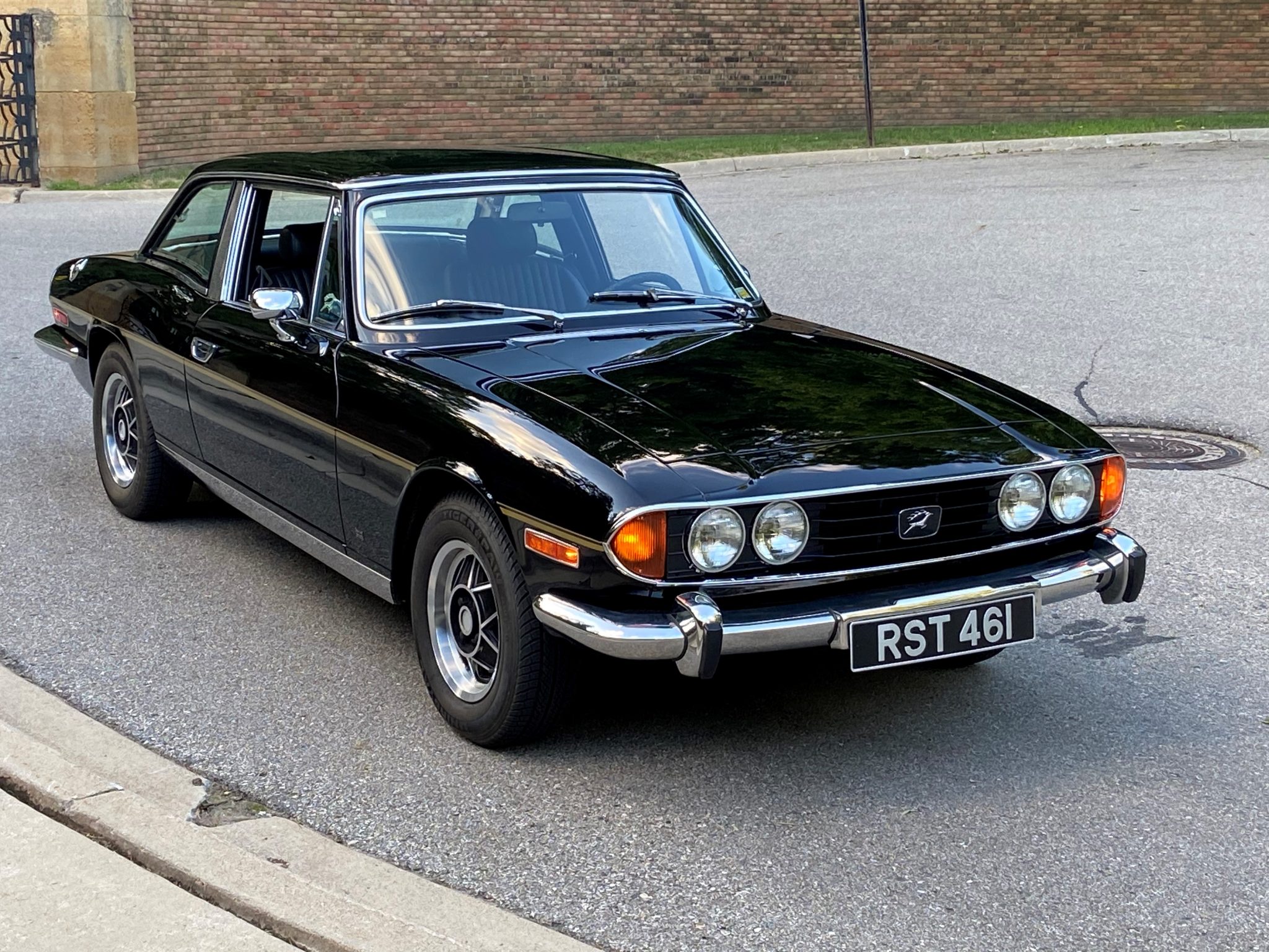 Factory 14″ star-pattern alloy wheels were replaced during the refurbishment, and they are mounted with Uniroyal Tiger Paw tires; a spare alloy wheel and tire are stored in the trunk. The suspension is said to have been refurbished in 2013 with replacement shocks, ball joints, and tie-rod ends, and the brakes and brake hydraulics were overhauled at the same time. A rebuilt power-steering rack was installed as well.