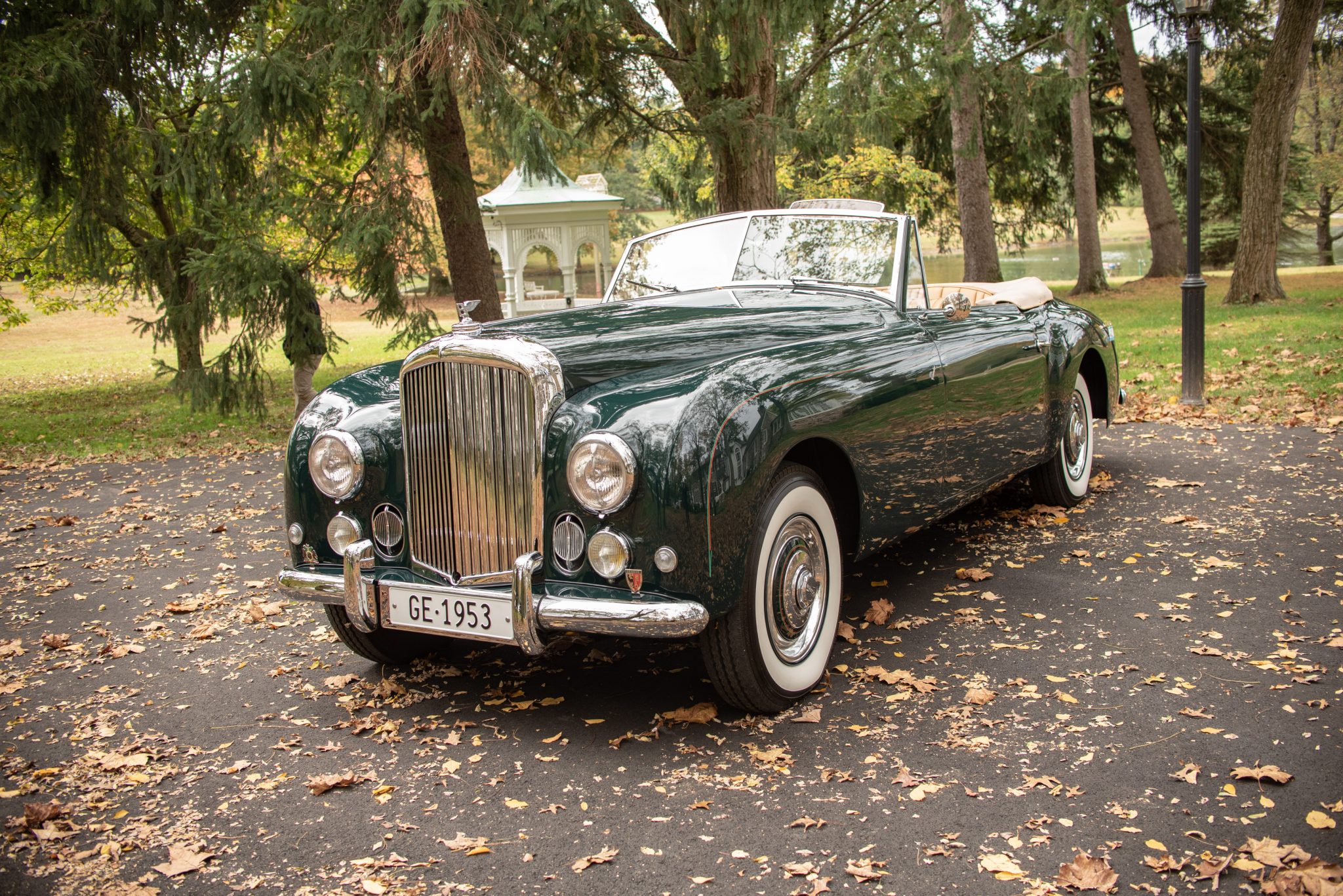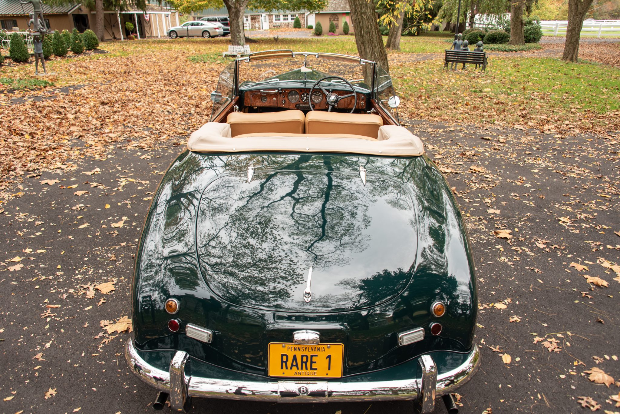 This car, chassis B184MD, was originally bodied as a fixed-head coupe, but was converted to its current cabriolet configuration early in its life. Bodywork by Swiss coachbuilder Graber features streamlined, pontoon-style fenders with integrated air vents and Marchal headlamps and fog lights. The exterior was finished in white prior to the seller’s initial acquisition and was refinished in its current shade of British Racing Green during the subsequent restoration. Closeups of the finish, trim, lenses, and glass are presented in the photo gallery below. The seller notes that each time it was driven to an event, the car received a show-preparation detailing upon its return to be ready for the next event.