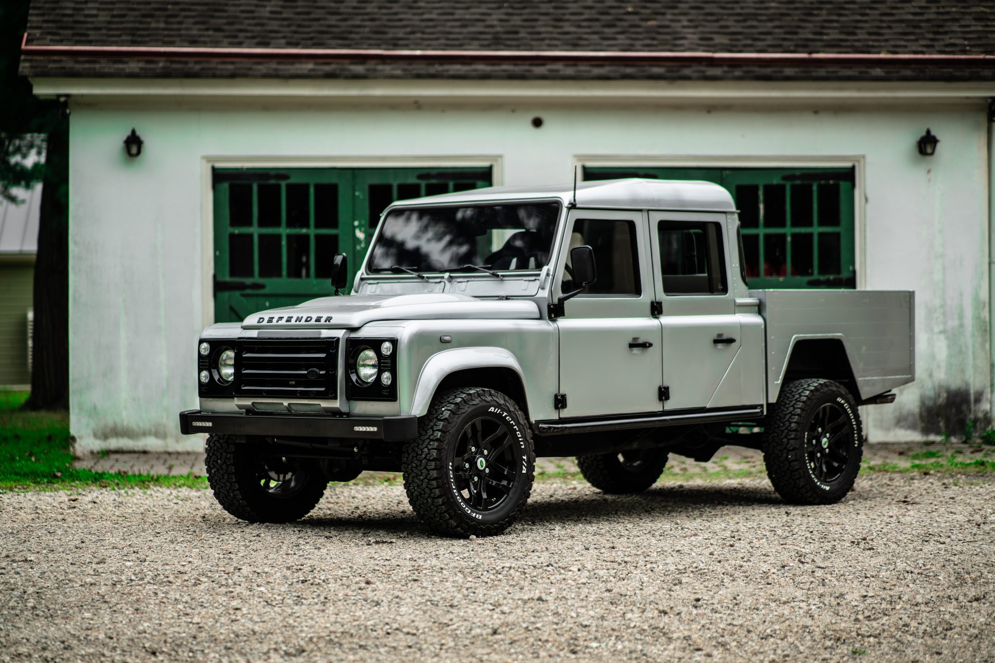 Black aftermarket alloy wheels are mounted with BFGoodrich All-Terrain T/A tires. The truck is also equipped with an aftermarket front bumper and rock sliders.
